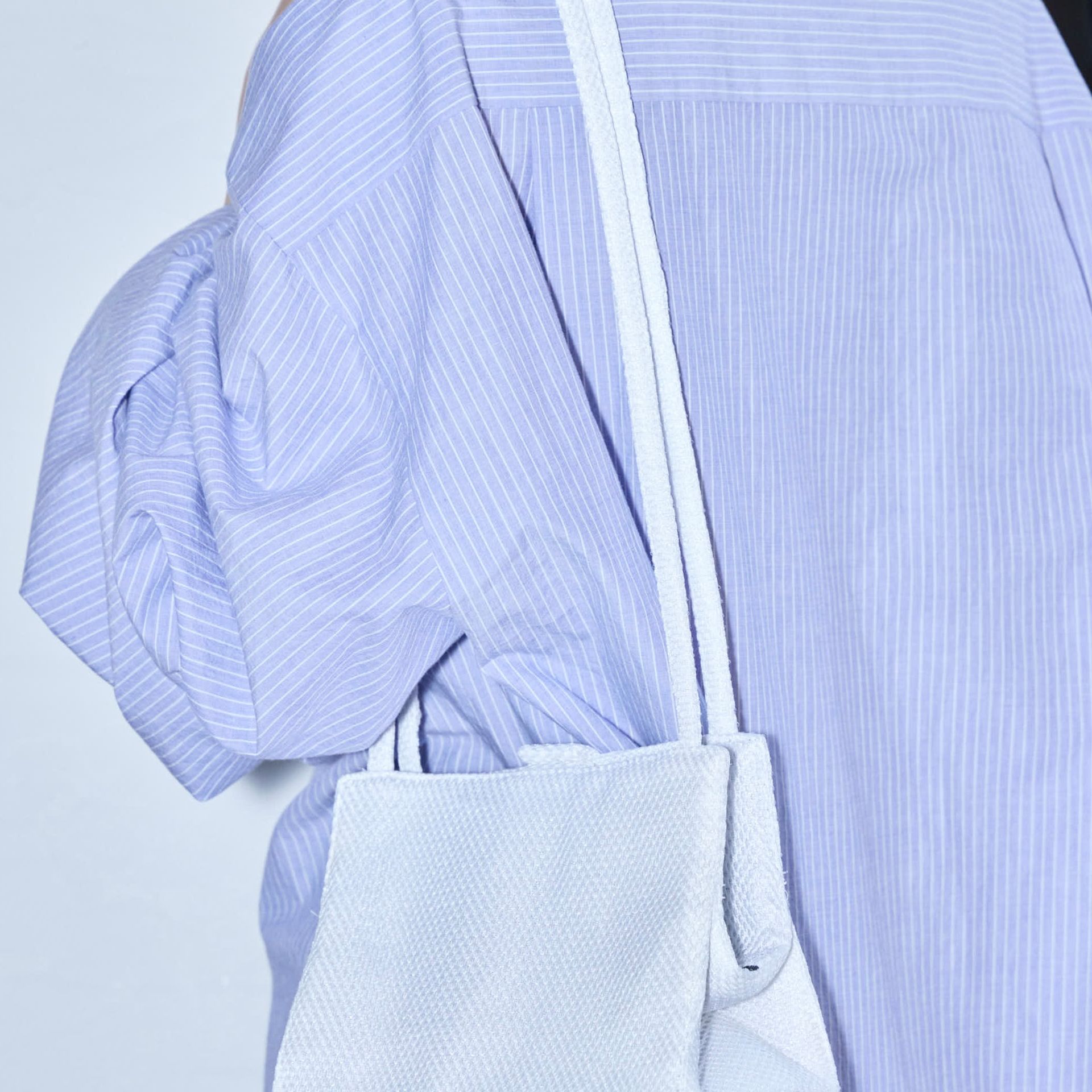 WHITEはクリーンなコットンツイル、杢グレーはピンストライプのポリエステル素材で、それぞれ異なる印象に。