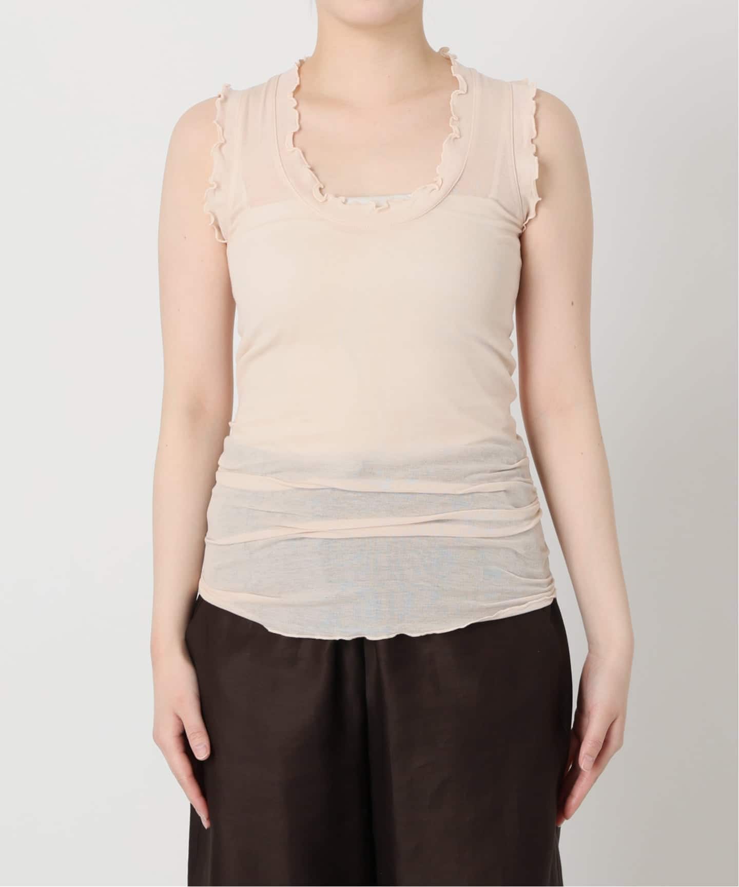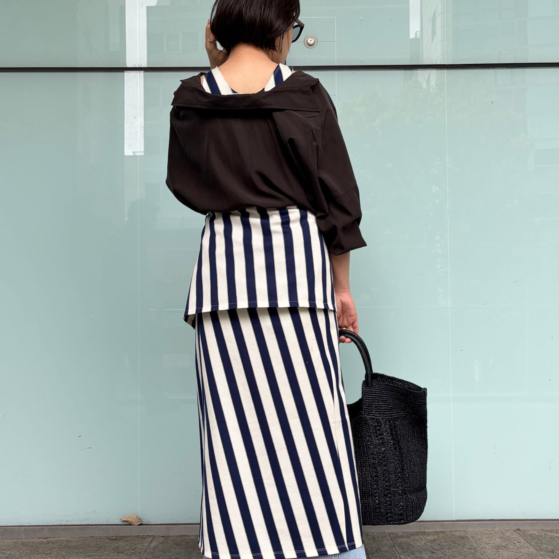 やや厚みのある生地なので1枚でもボディラインを拾わないのが嬉しいポイント。私は背が高いのでパンツを合わせてバランスを取りました。