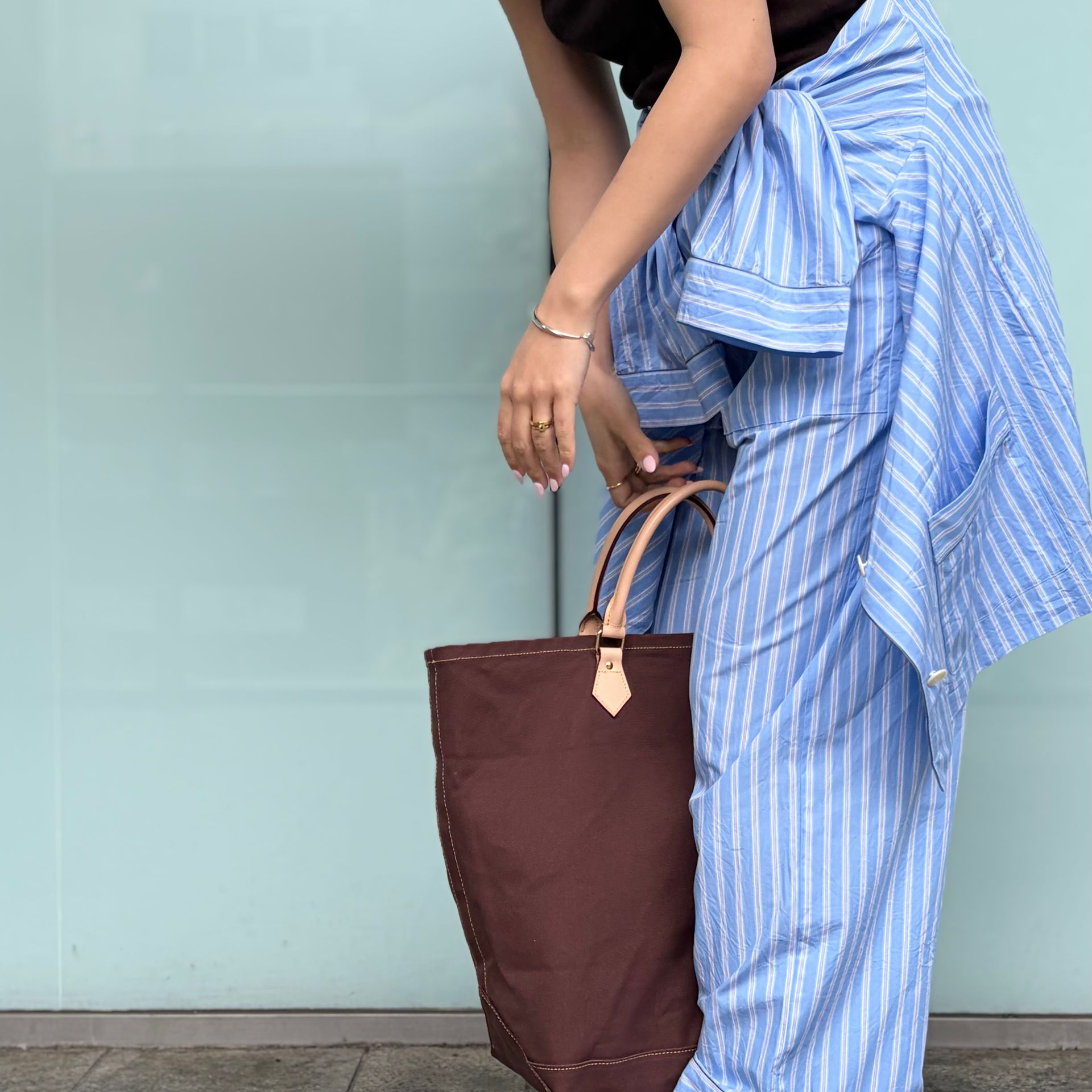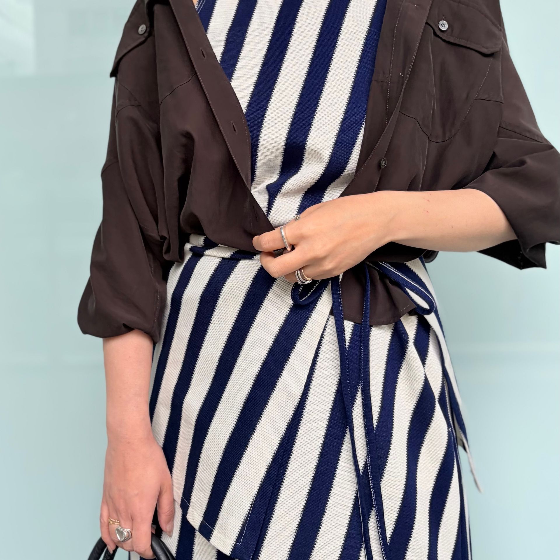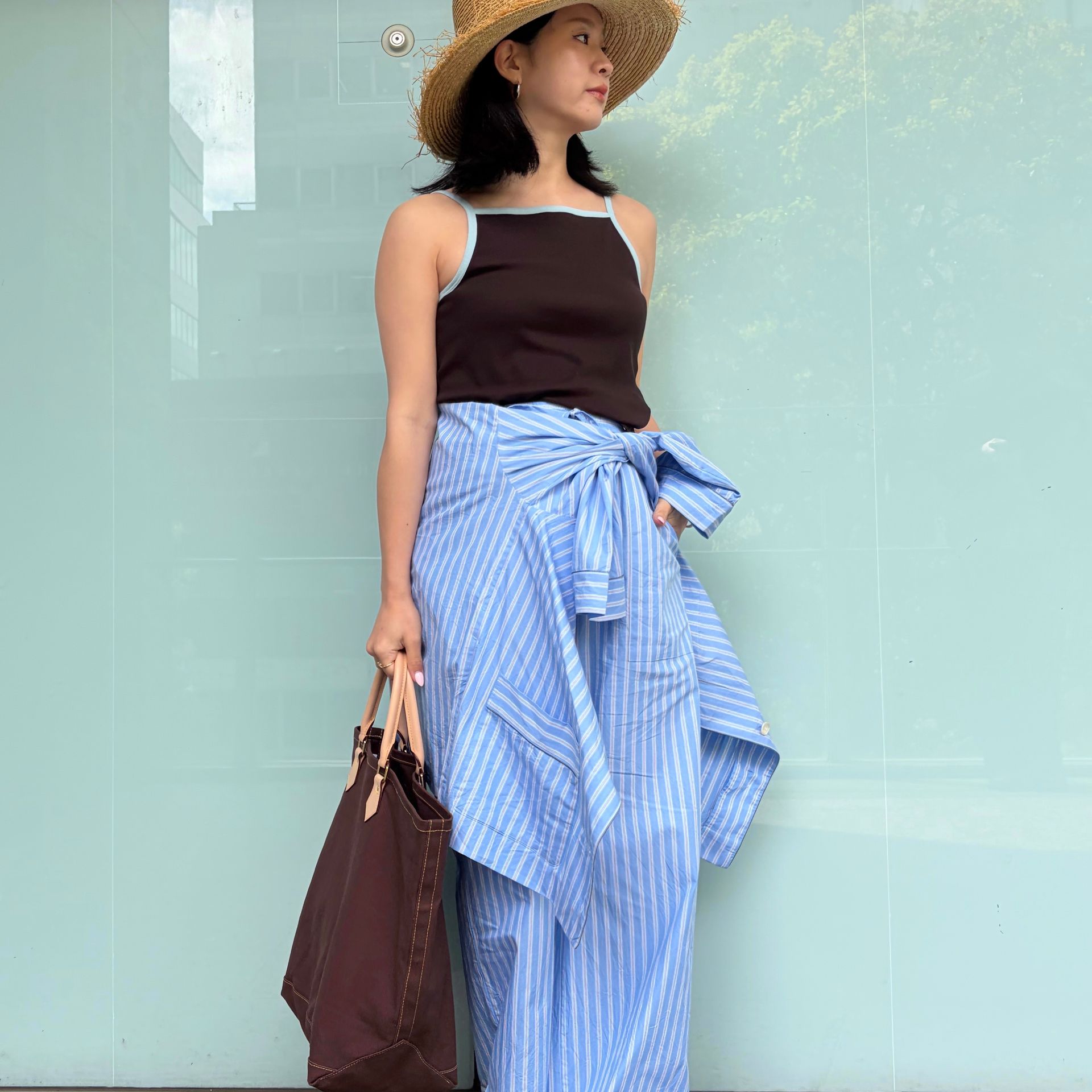 トップスやバッグで深めのブラウンを合わせて、落ち着きのある印象に。大人のアーバンリゾートスタイル*
