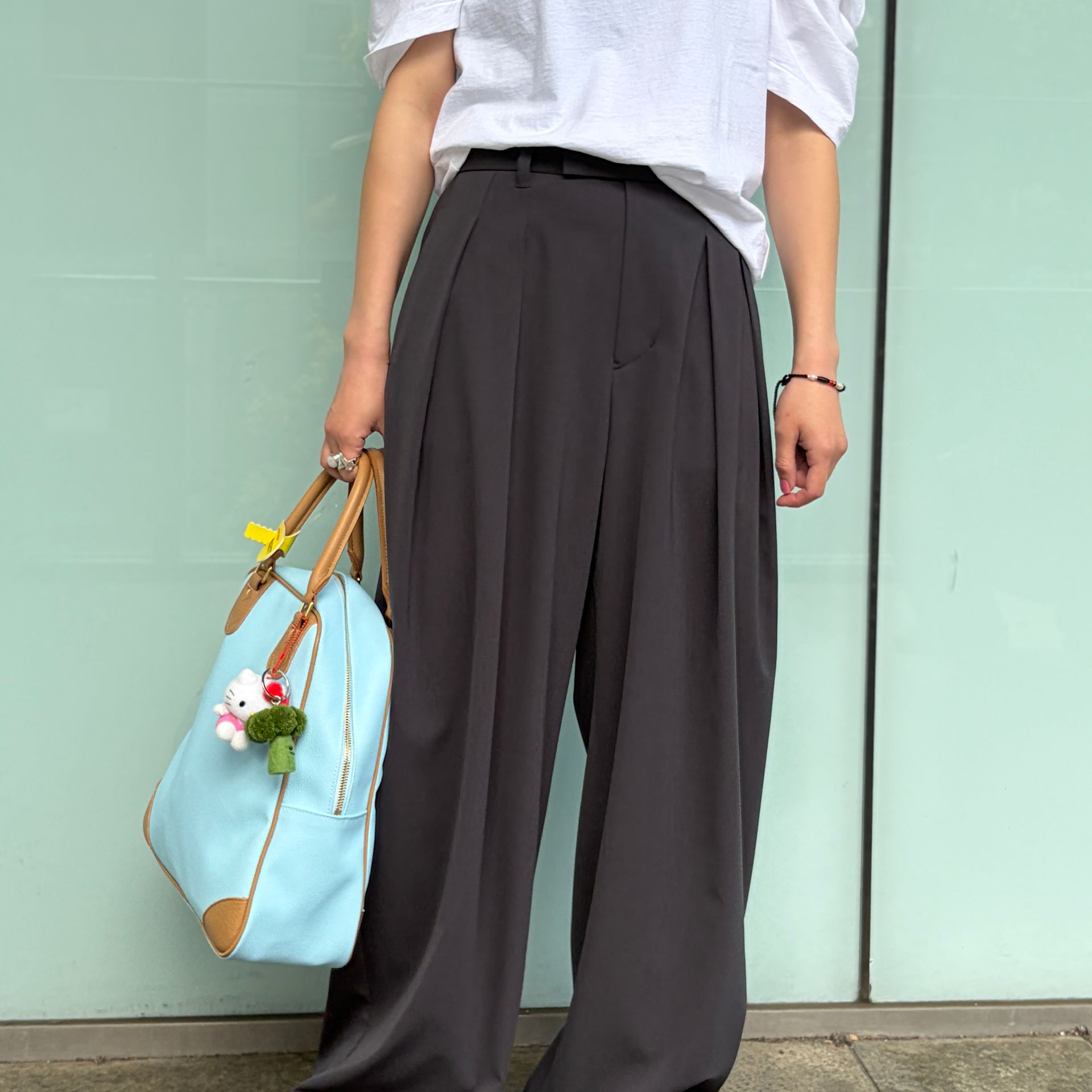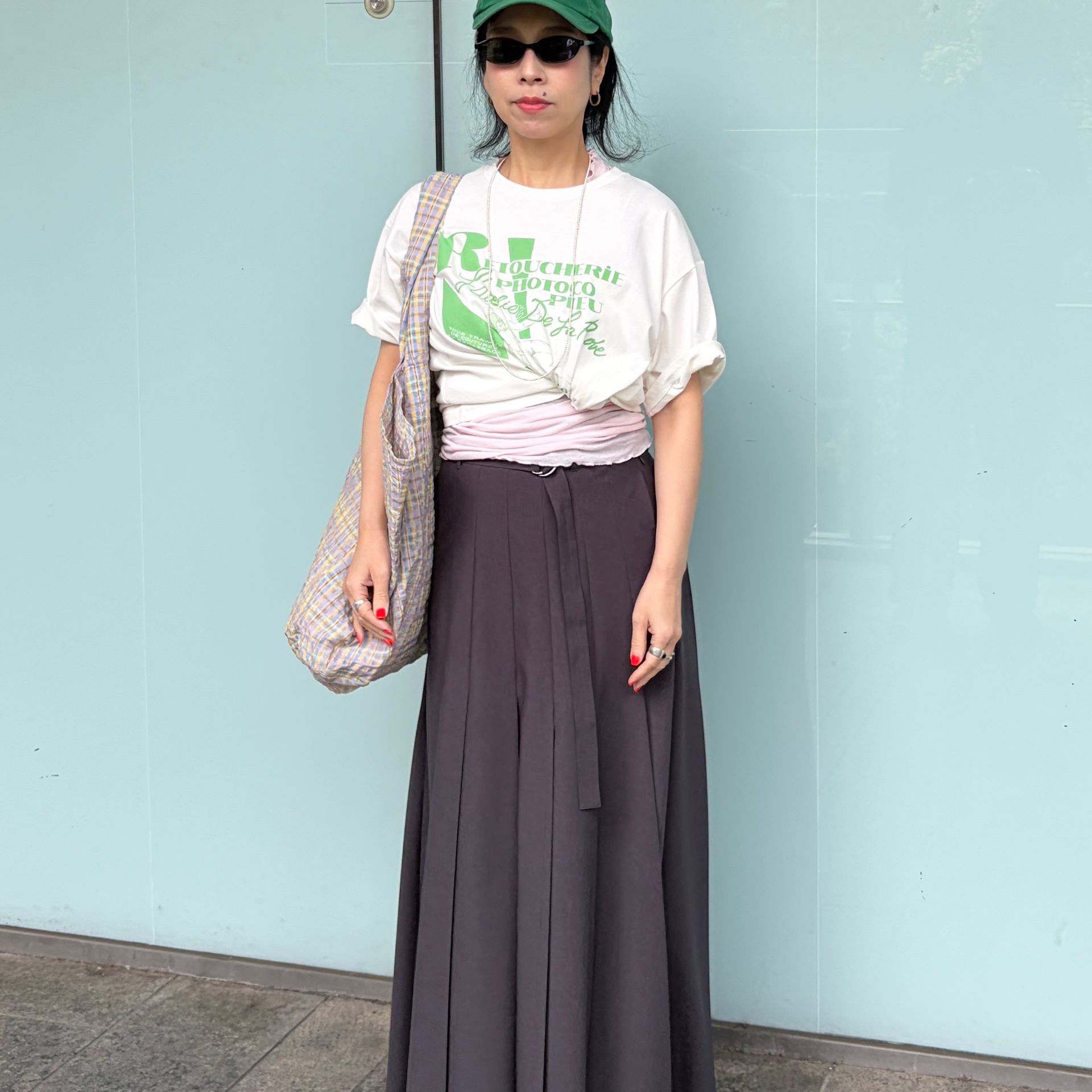 よく見るとバッグのピンクとグリーンのカラーをTシャツやキャップで拾っているのが、自分の中での小さなこだわり*
