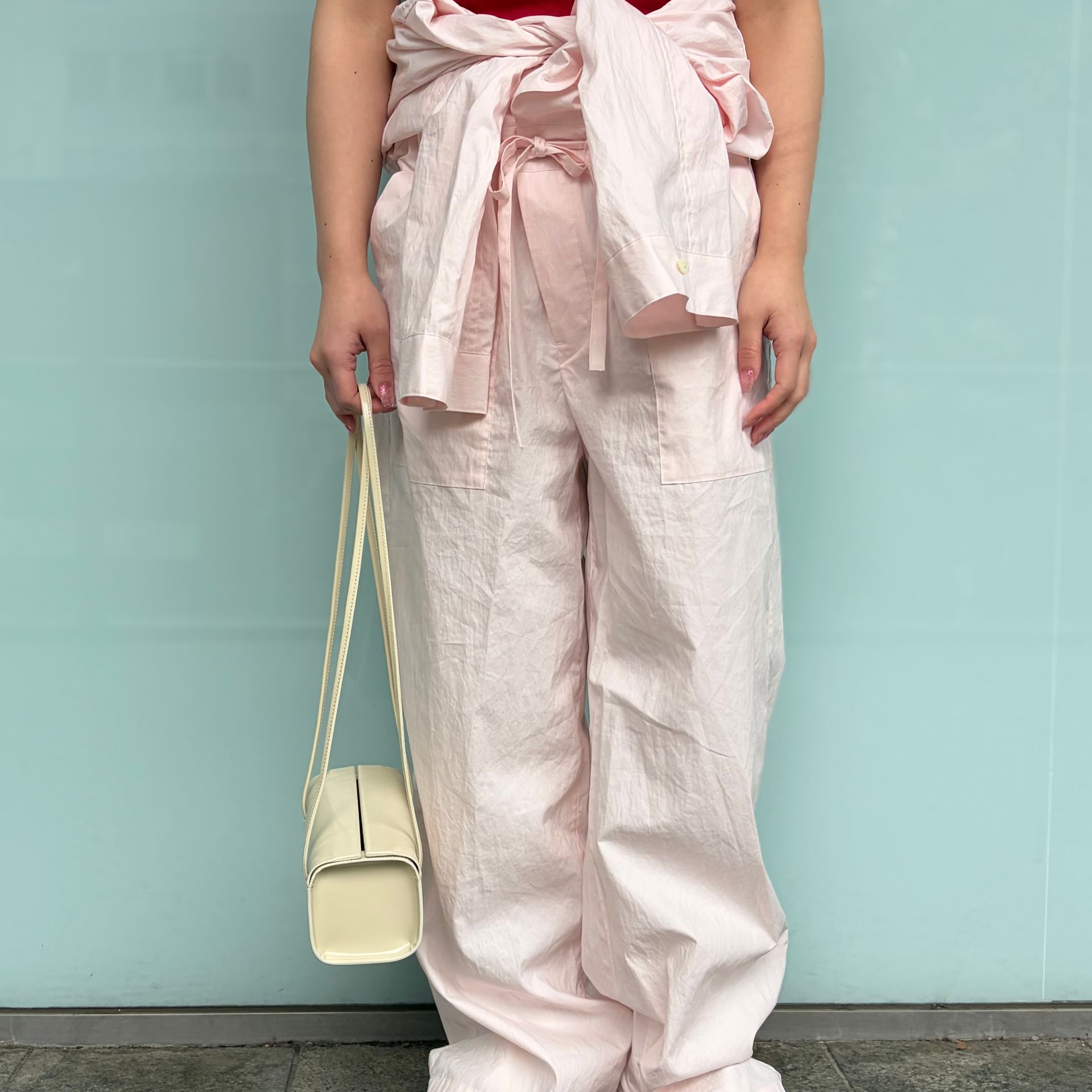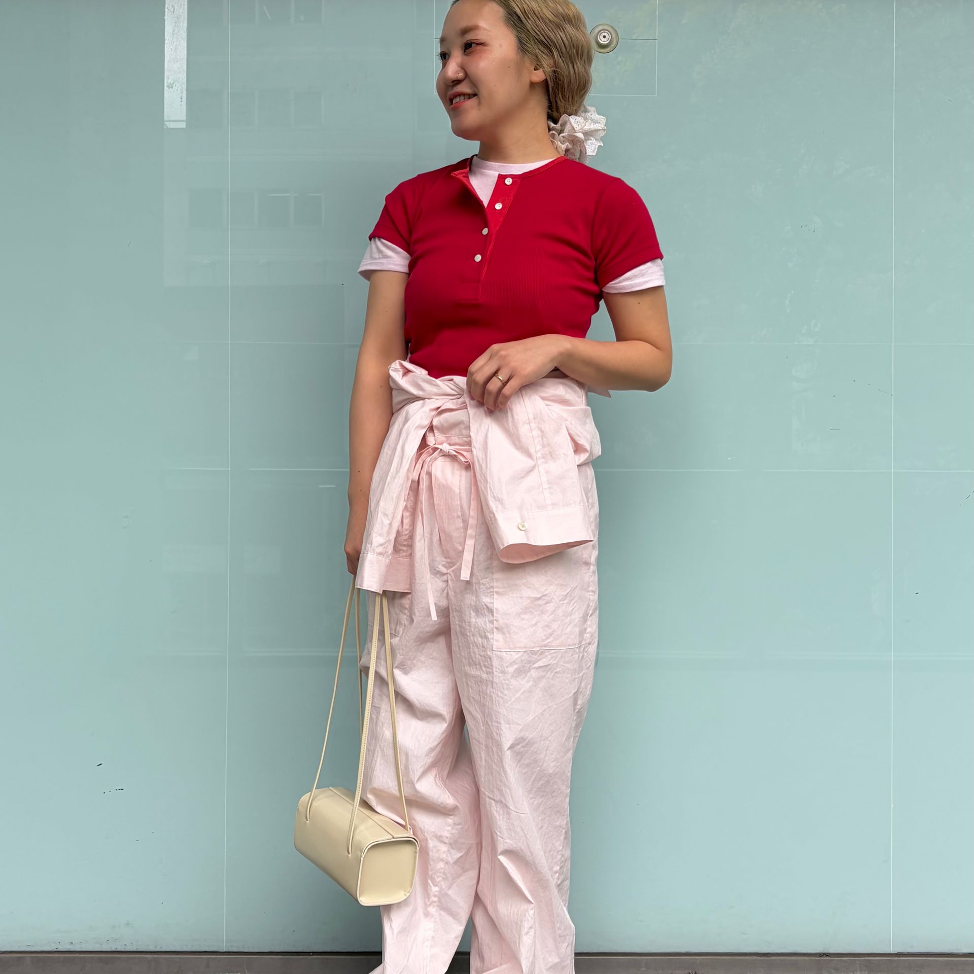 最近気分なピンク×レッドの色合わせをしたくて、ピンクのオールインワンを主役にカットソーをレイヤード。