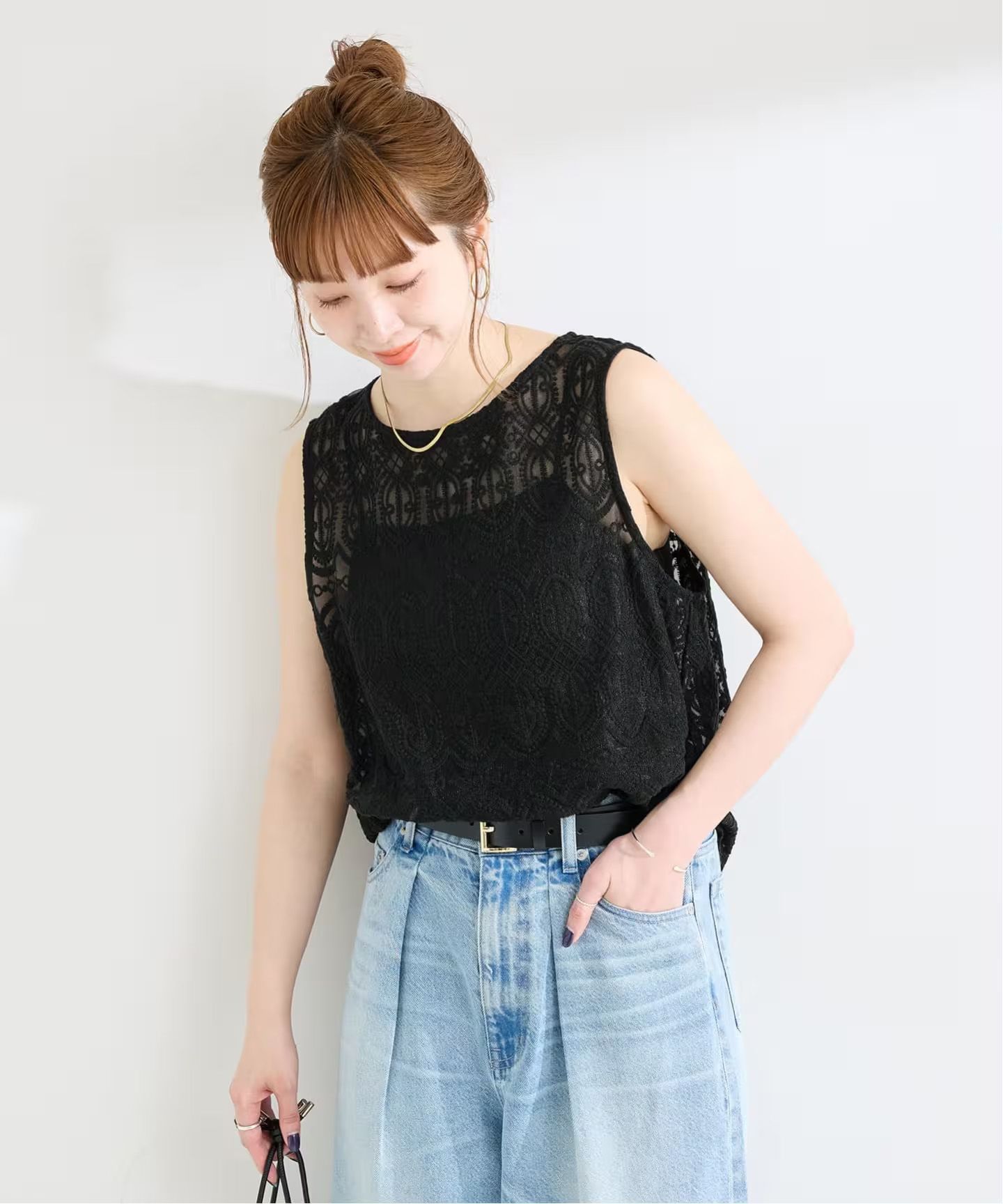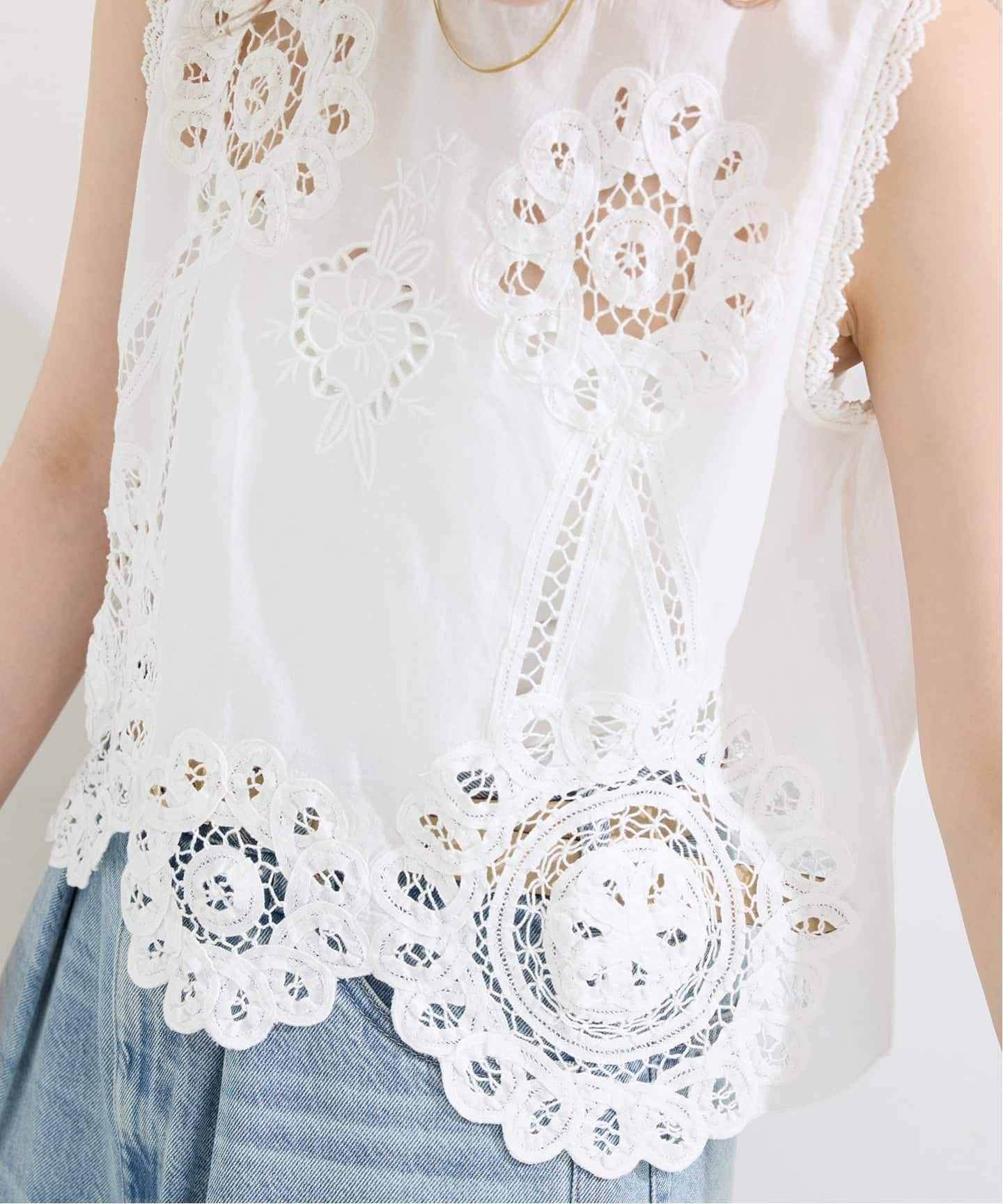 軽やかに透ける、総レースが美しいノースリーブブラウス。