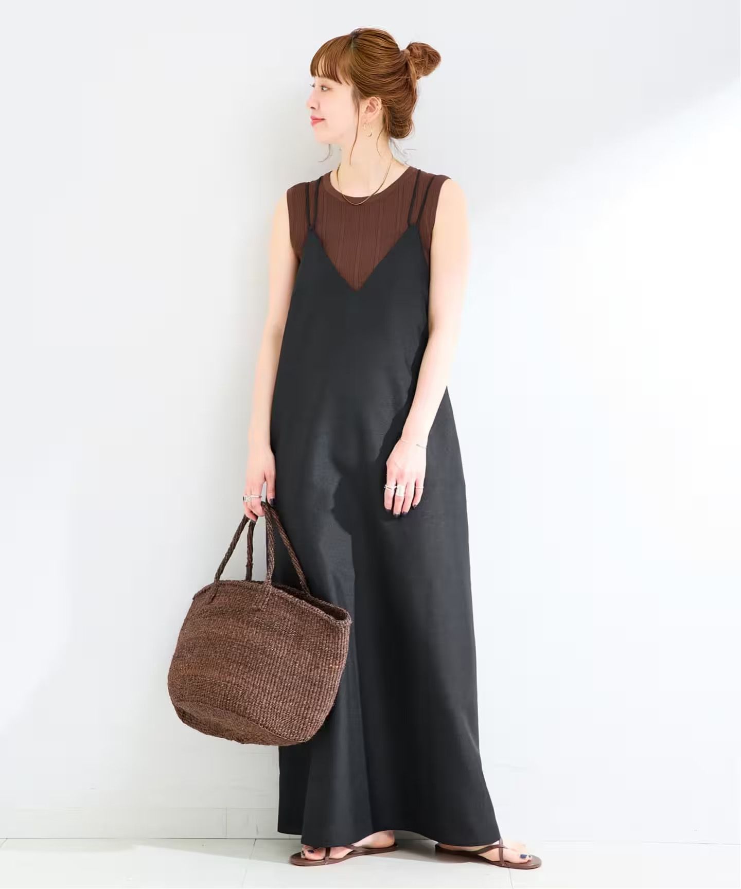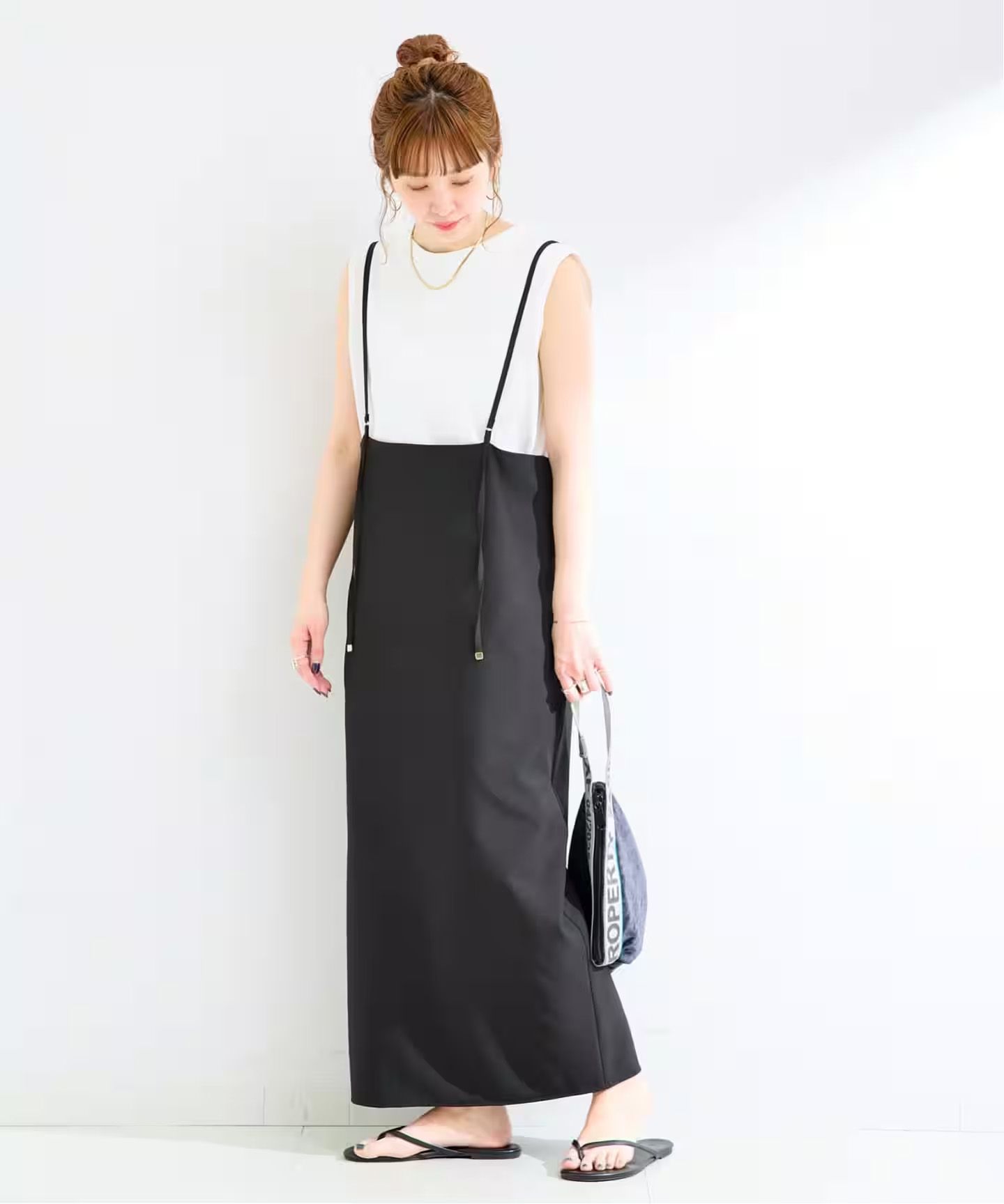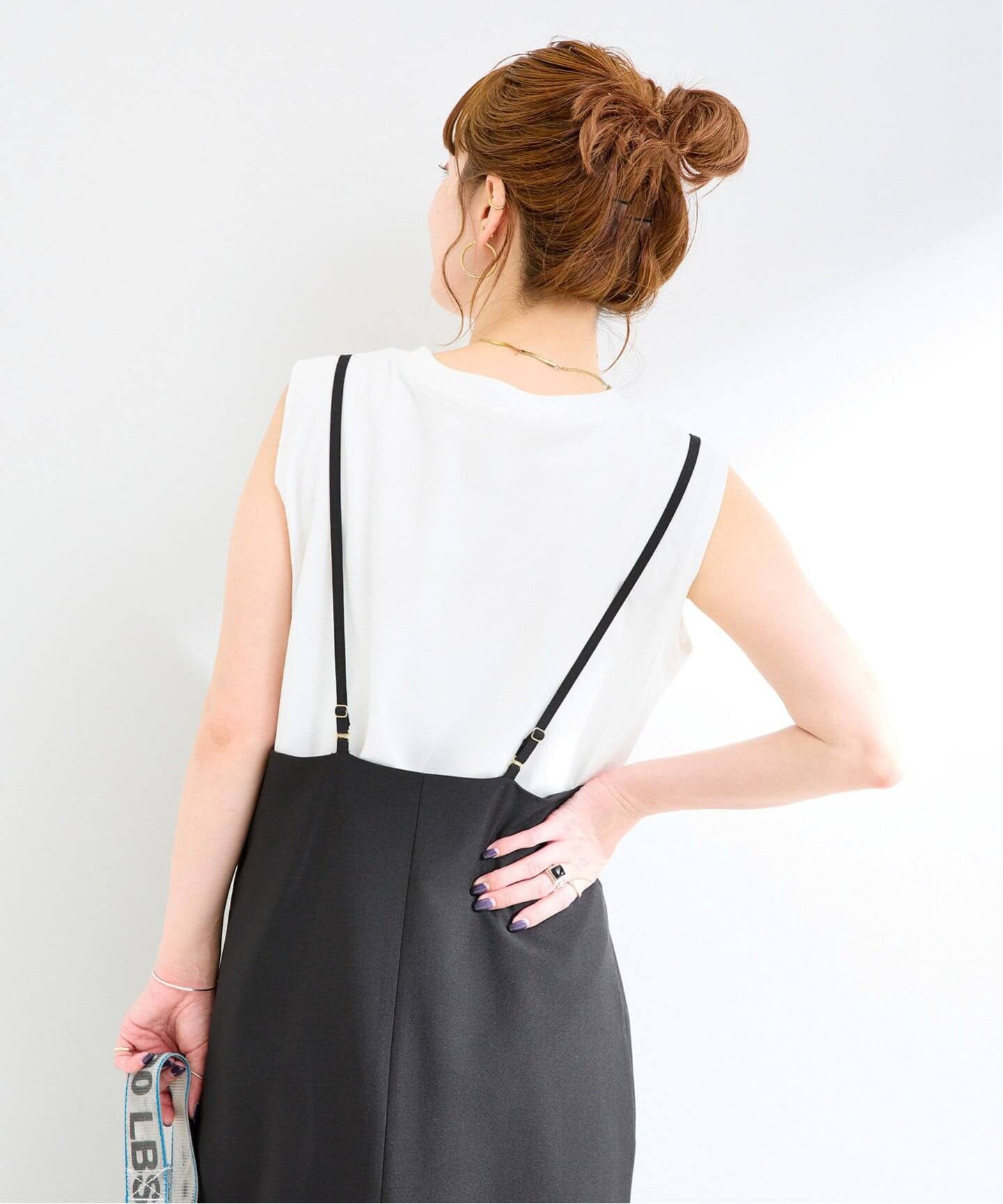 キャミワンピースはIラインシルエットですっきりとした見え感で縦長ラインが強調されます。