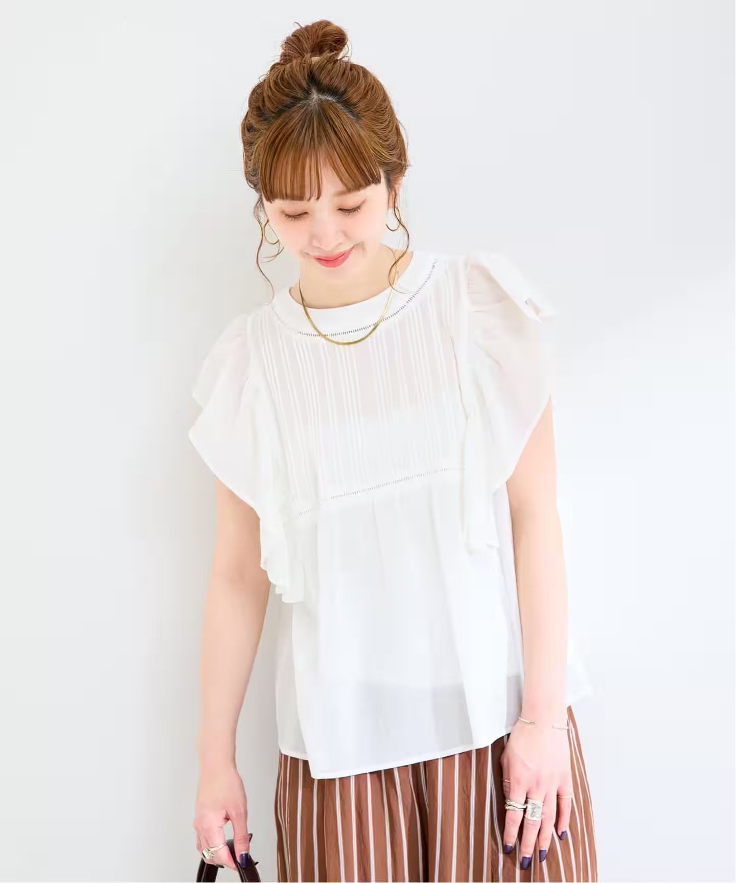 柔らかなフリルデザインが可愛らしいピンタックブラウス。