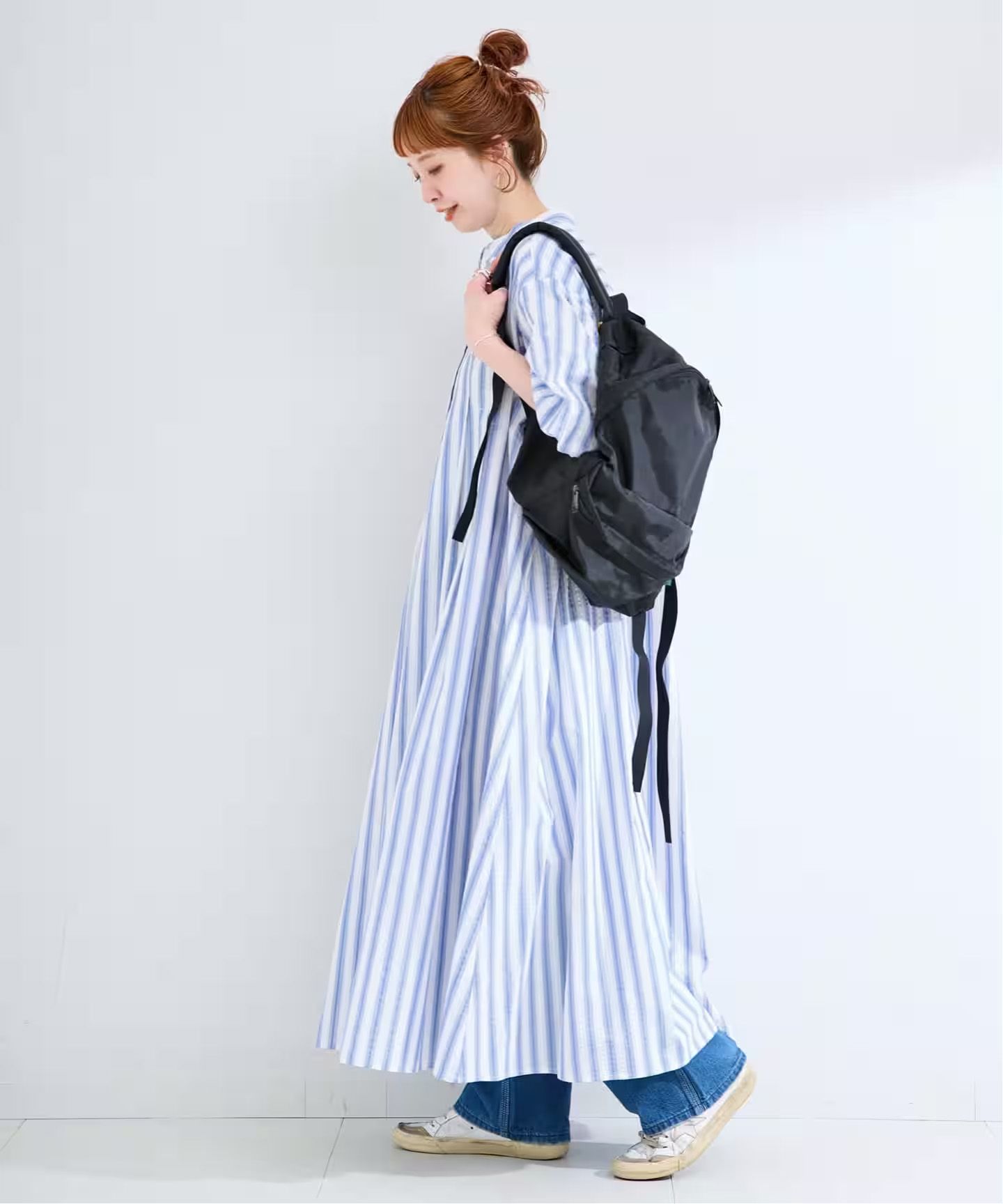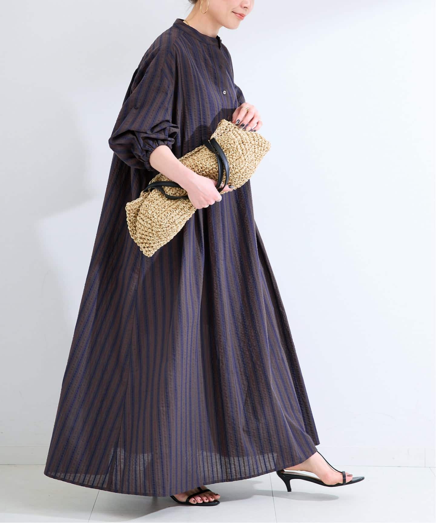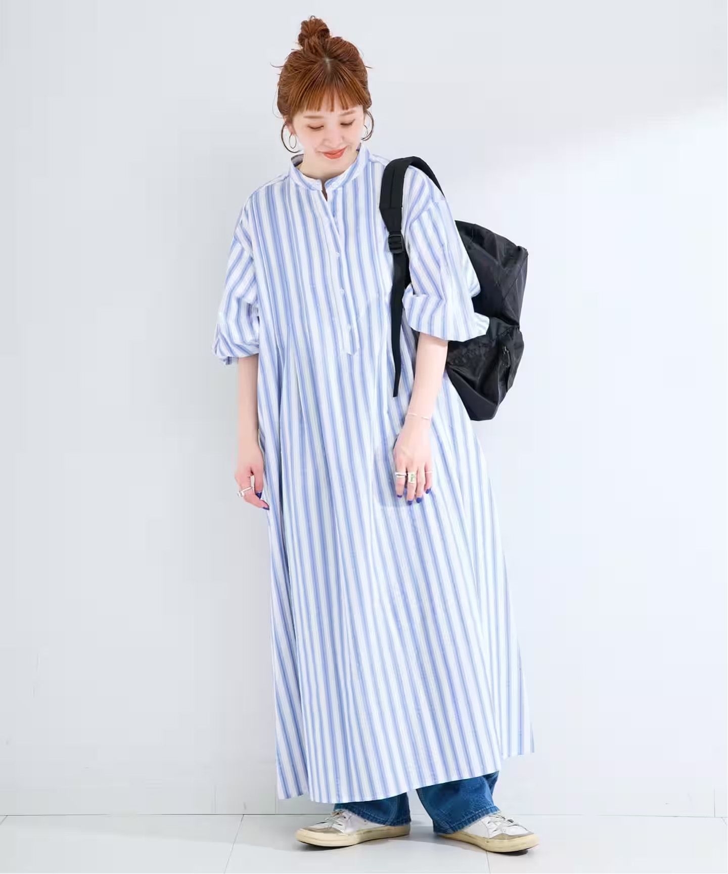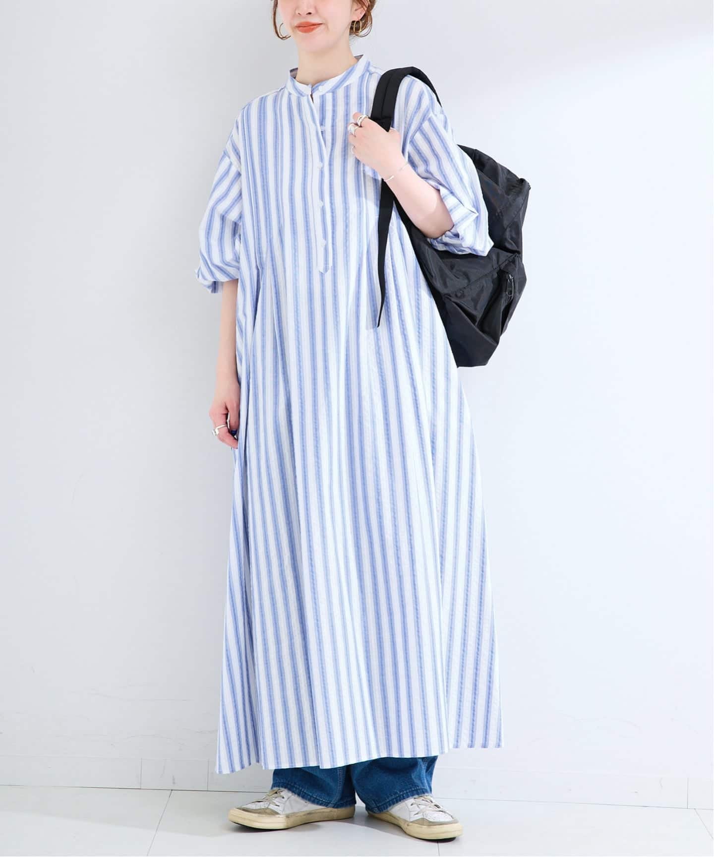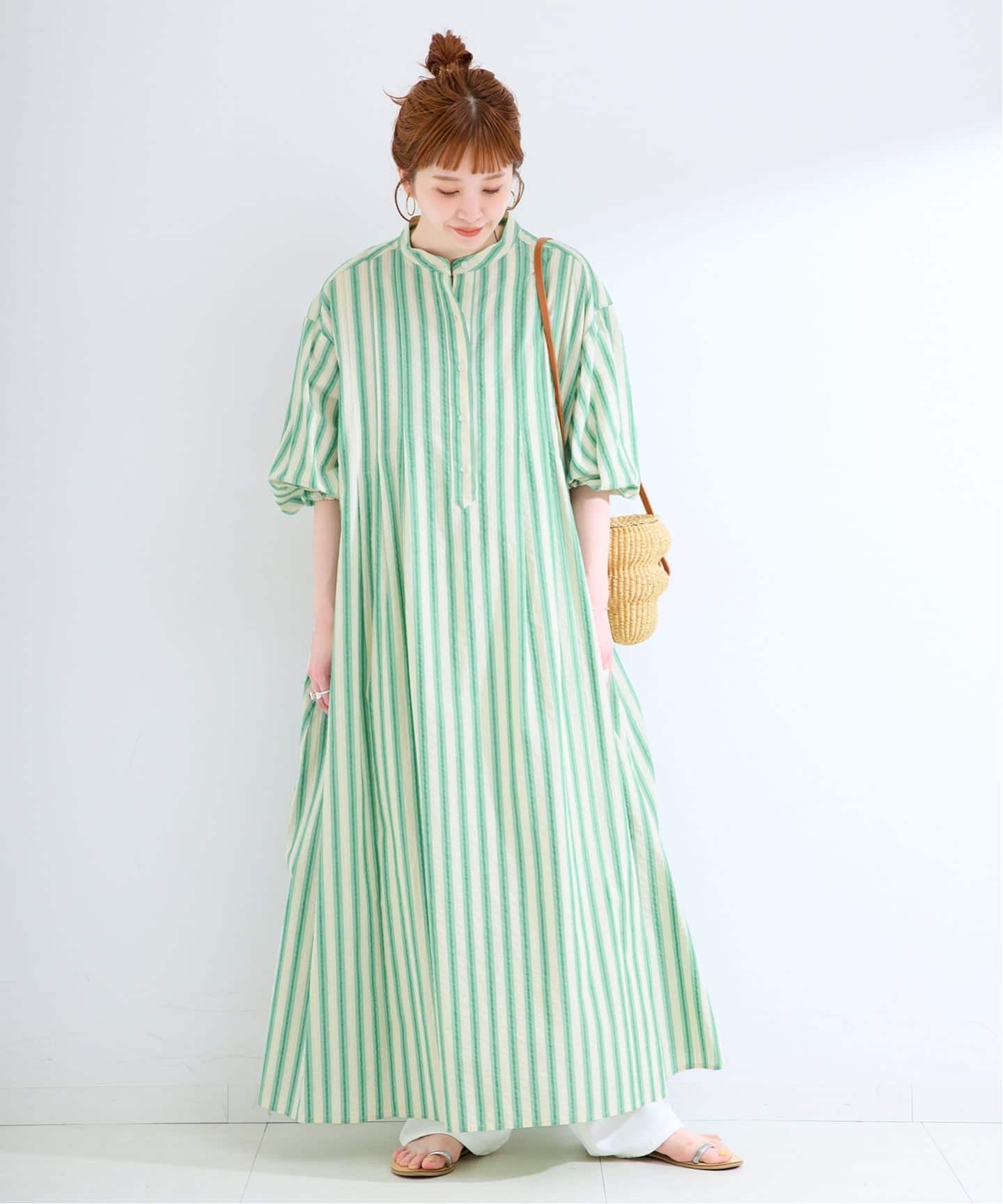 ポップなカラーリングと表面感のあるドビーストライプが目を惹くワンピース。