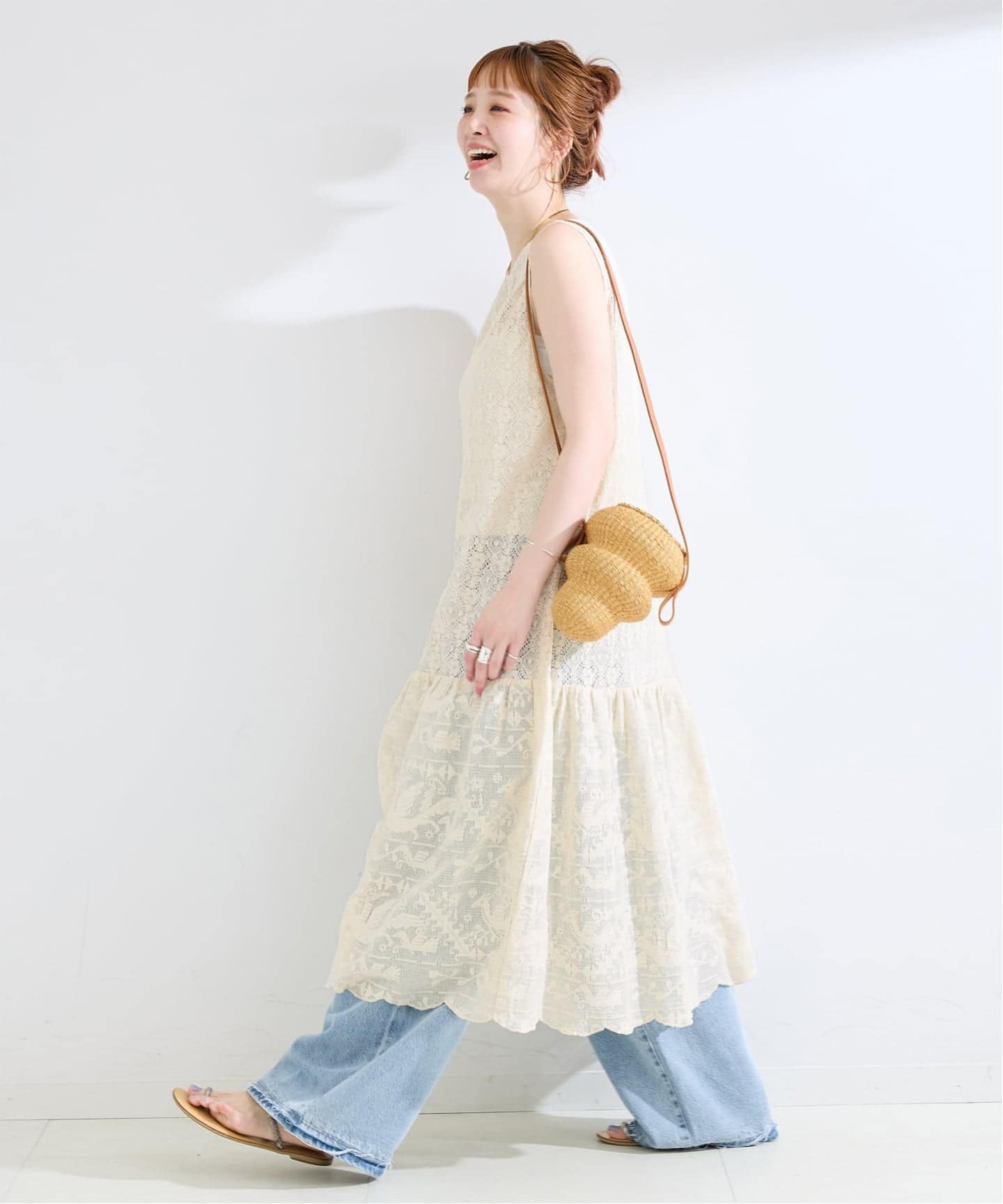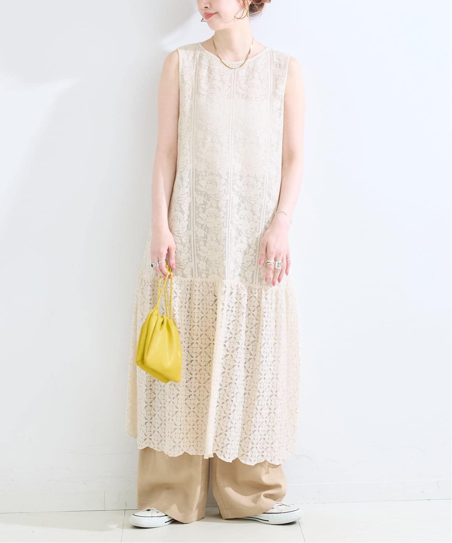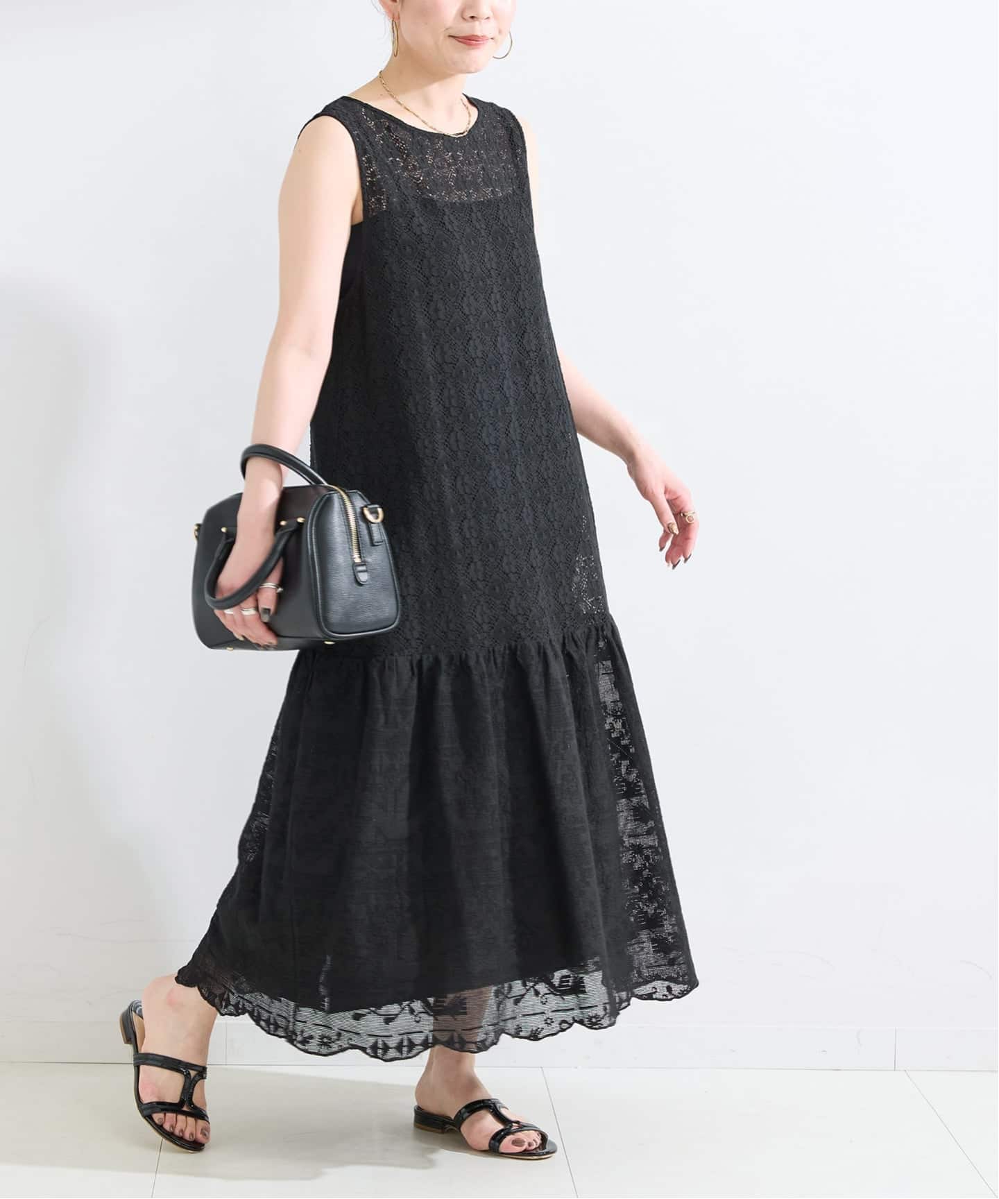 トップスとスカート部分は異なるレース柄を組み合わせることでさりげない表情の変化をプラスし、甘さを抑えた大人カジュアルな印象です。