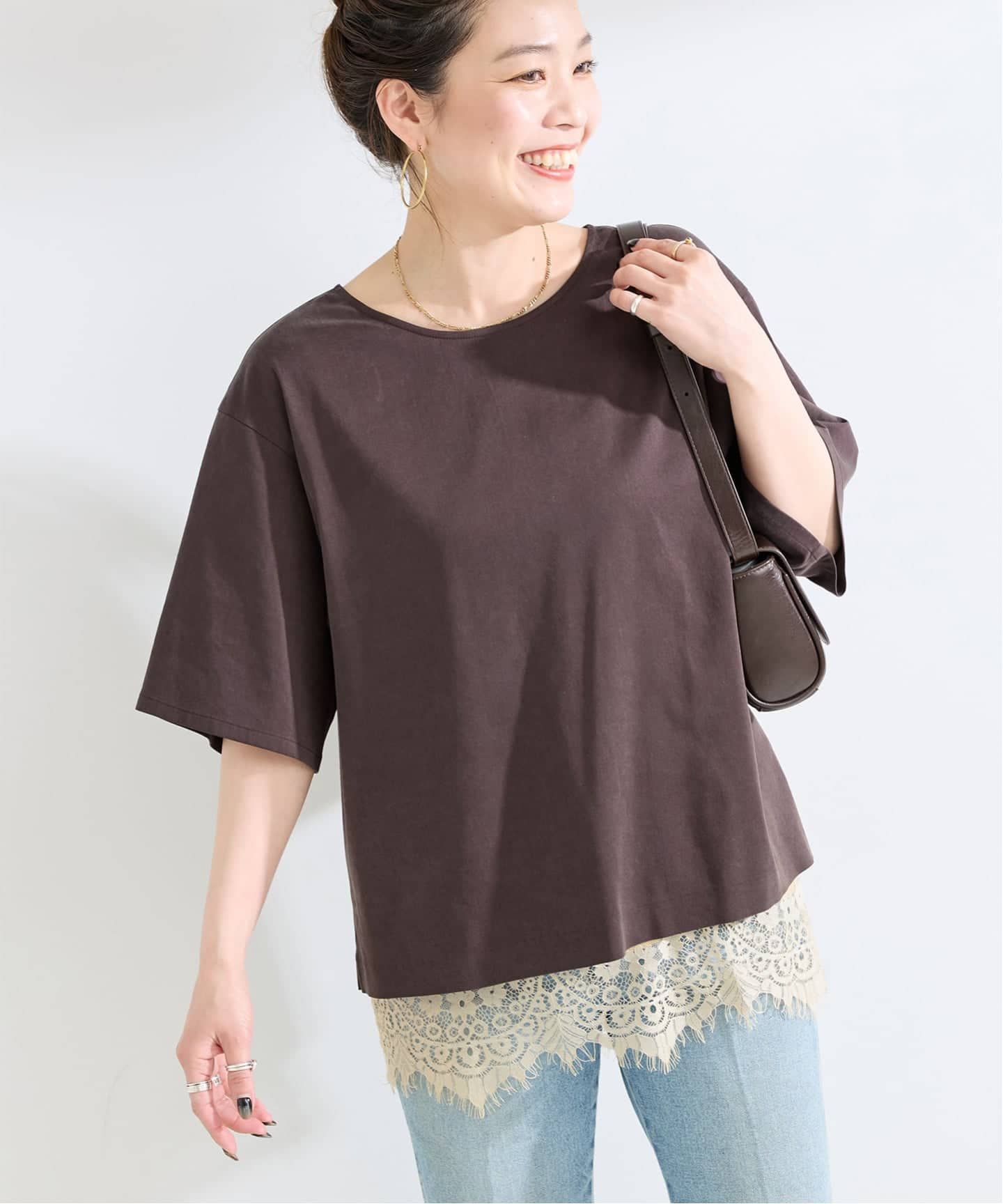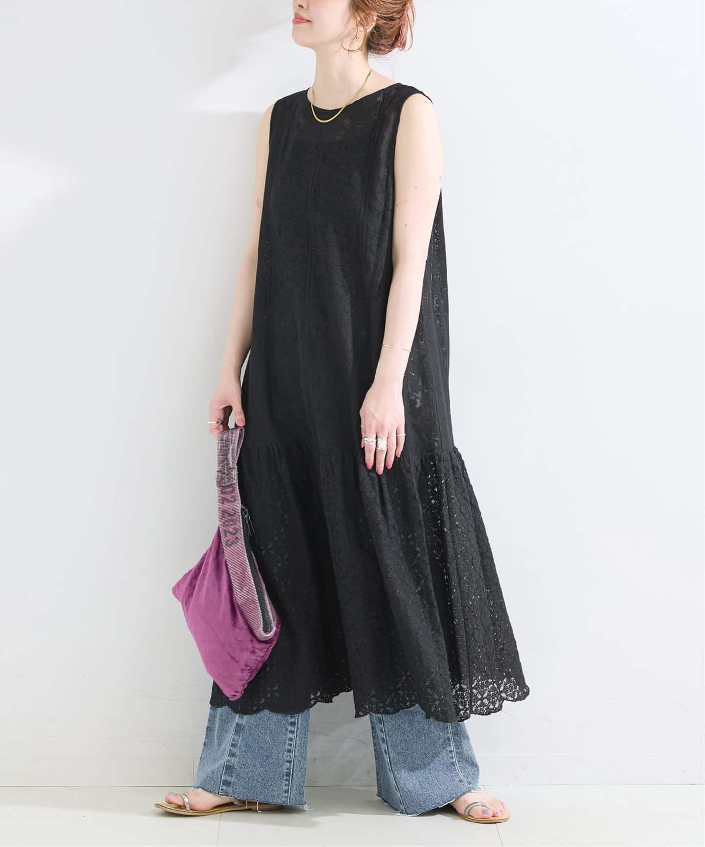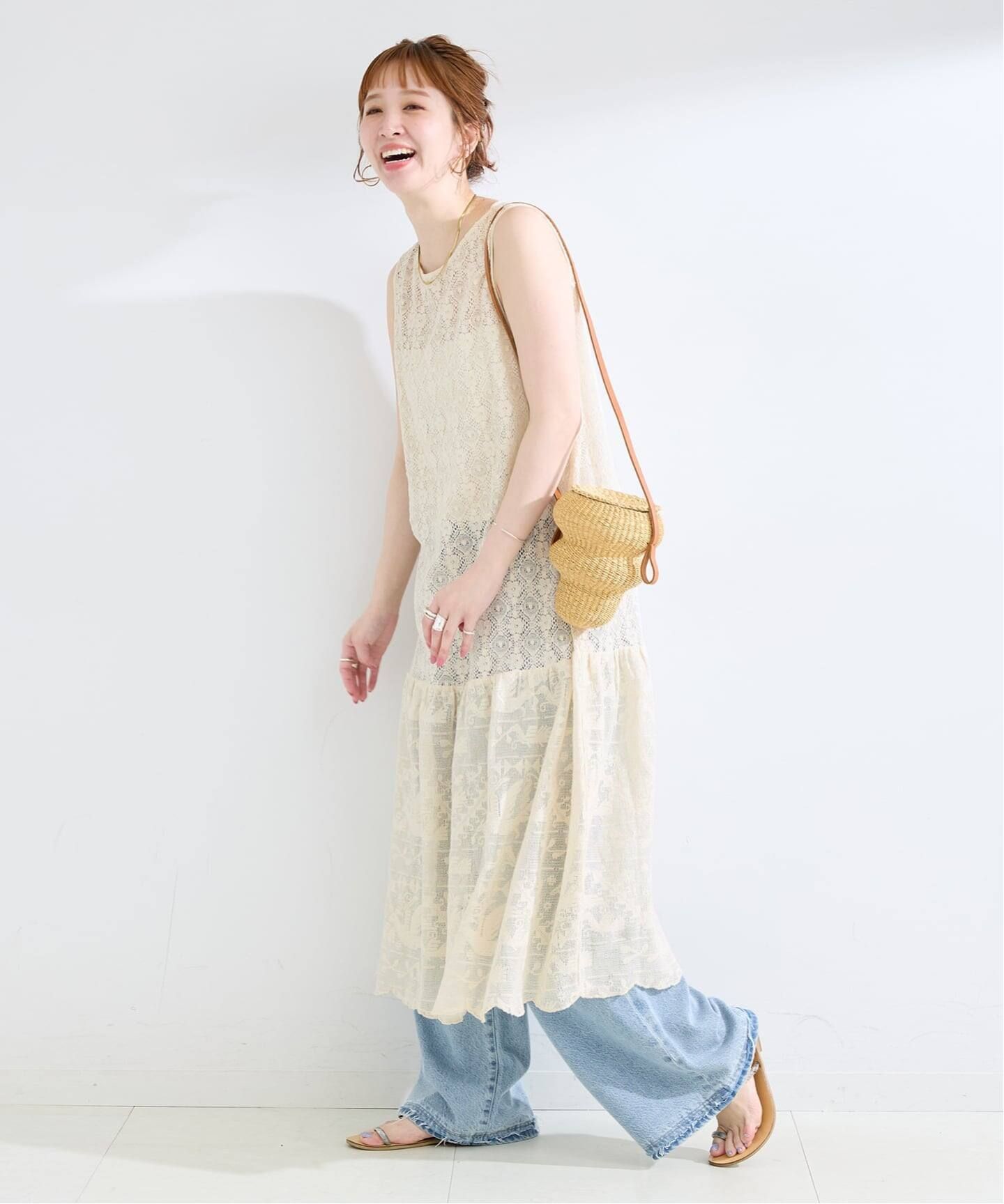 トップスとスカート部分は異なるレース柄を組み合わせることでさりげない表情の変化をプラスし、甘さを抑えた大人カジュアルな印象です。
