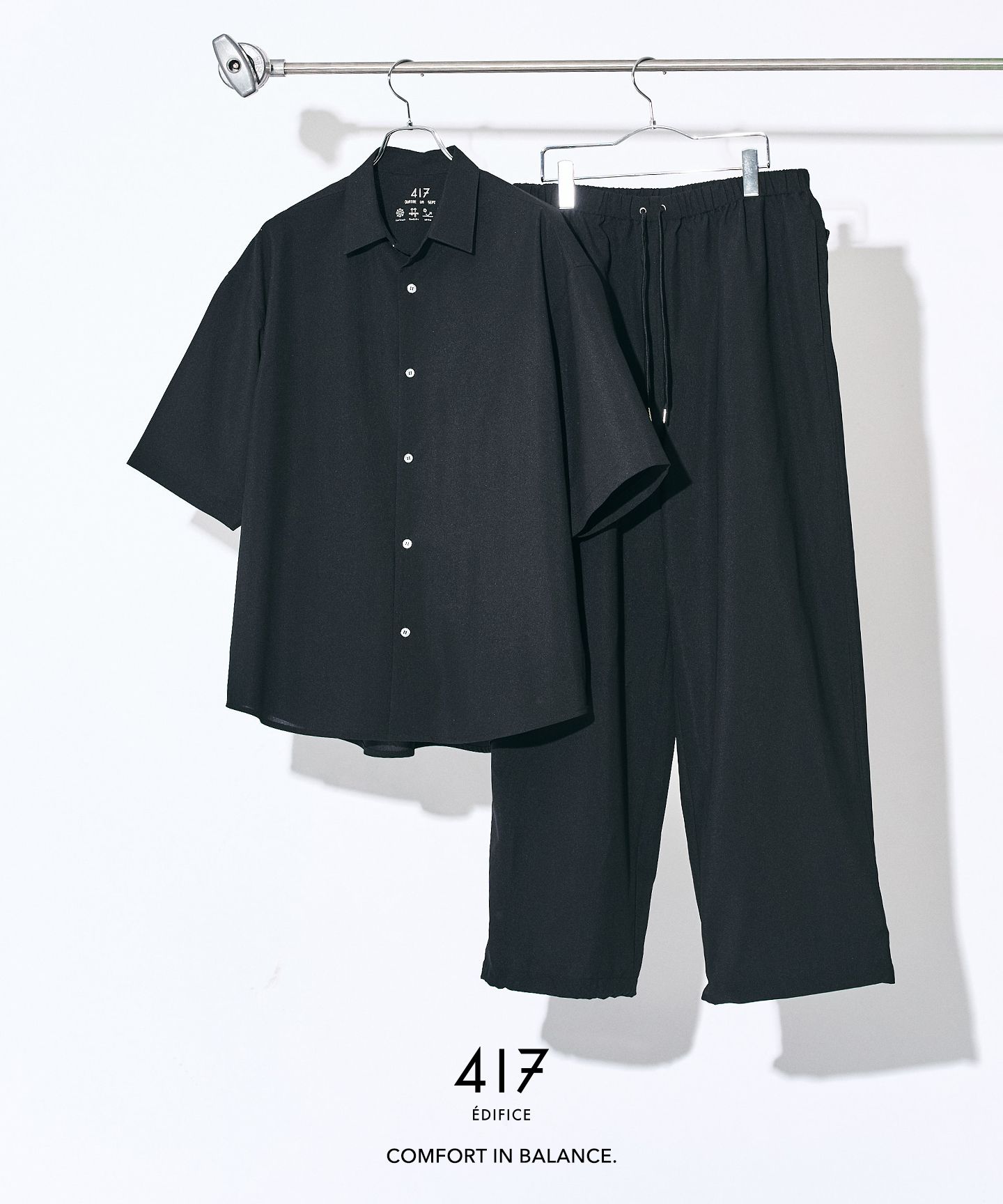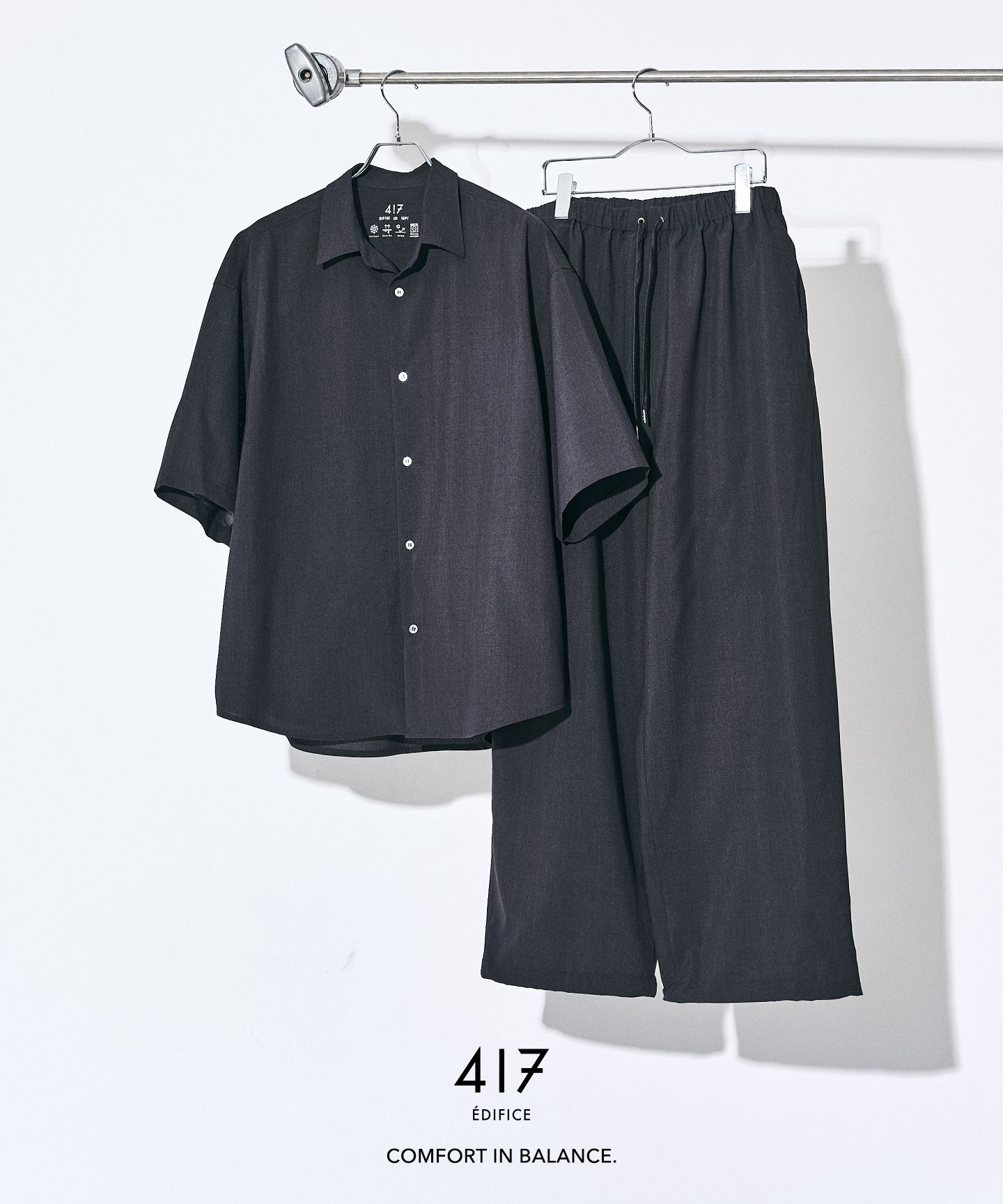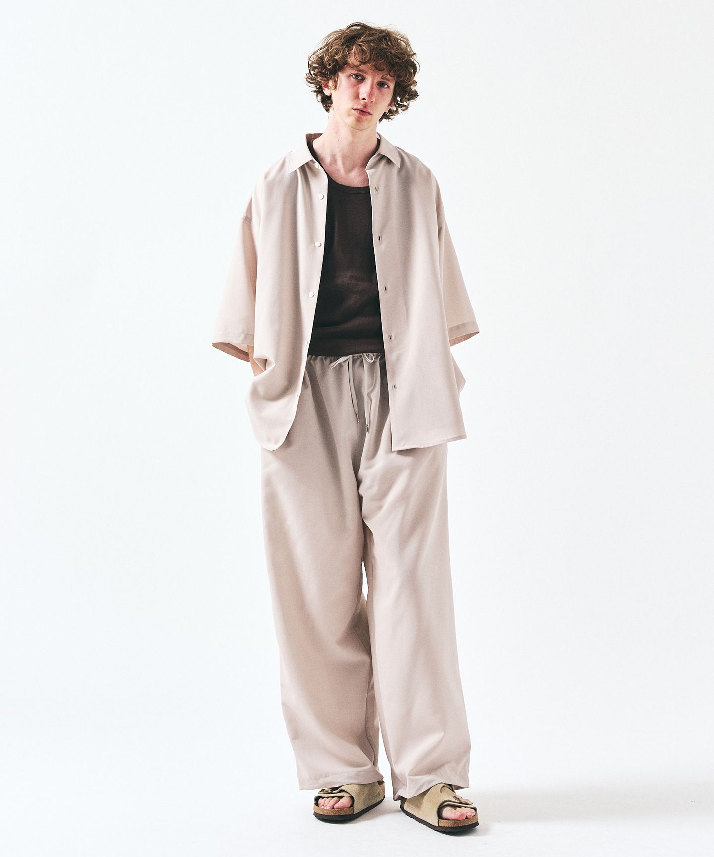 スタイリングを考える時間ごと、削ぎ落とす。シャツとパンツがセットになったこの一着は、ただ“楽”で終わらせないためのバランスでできている。