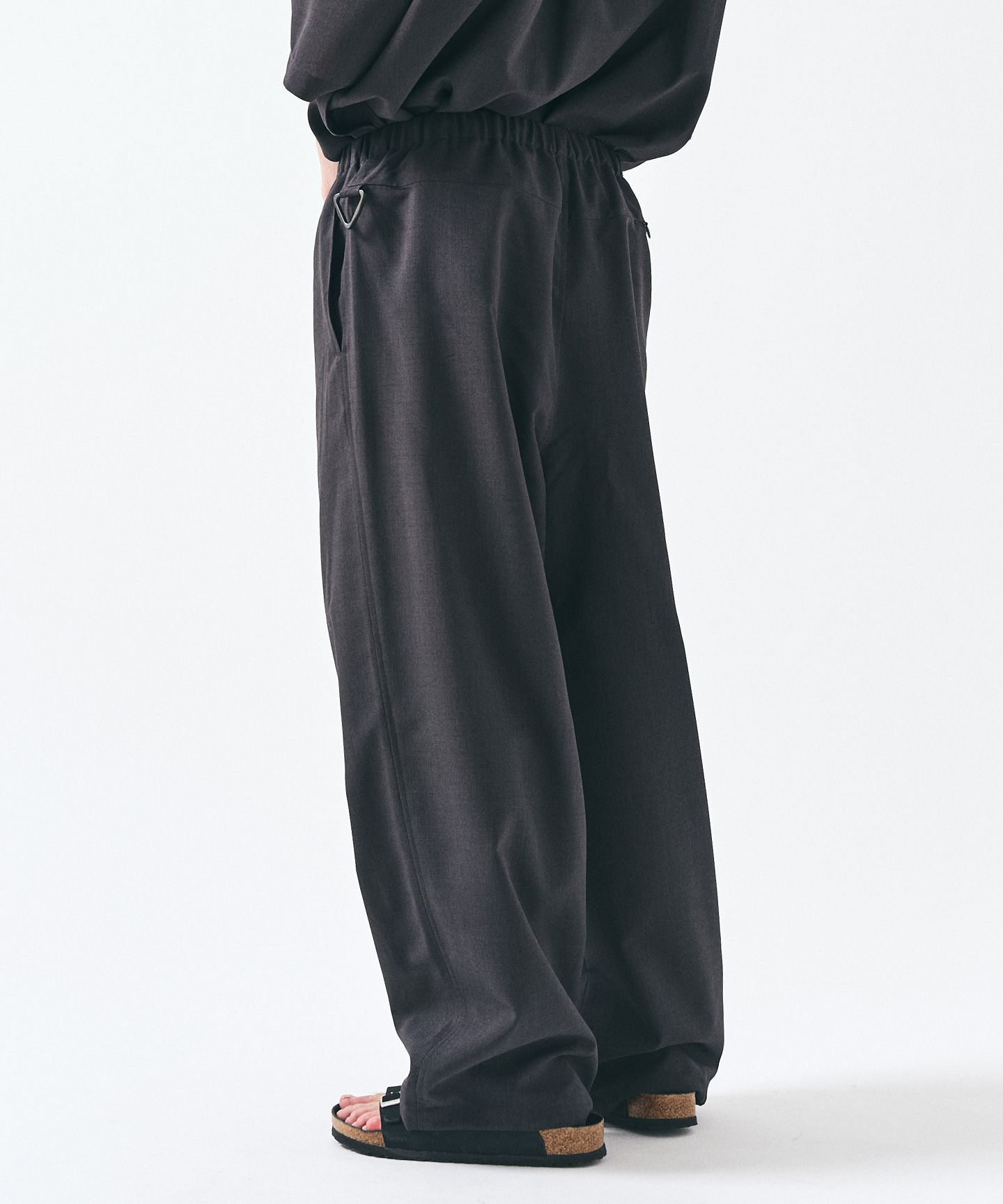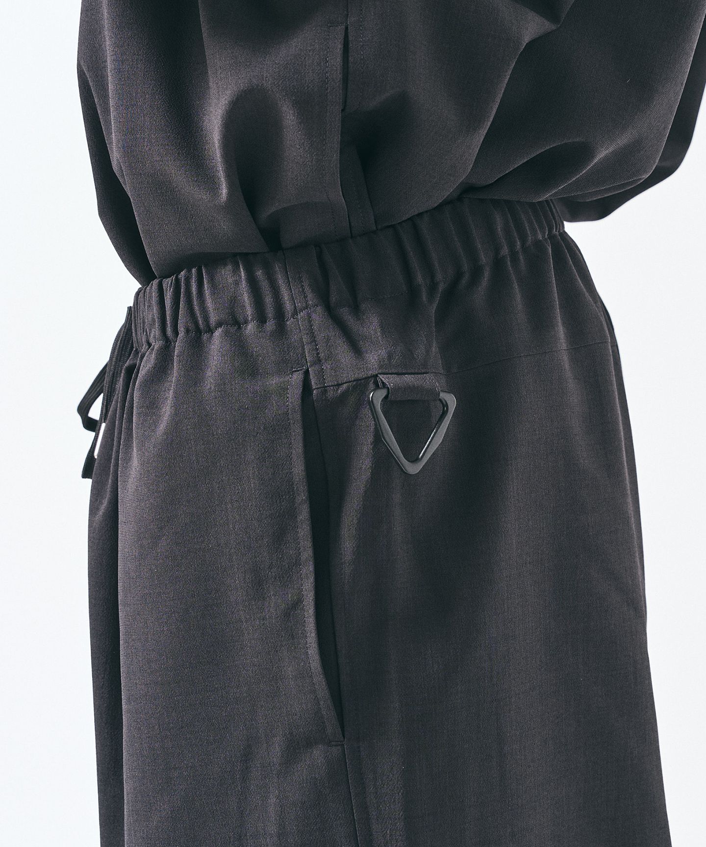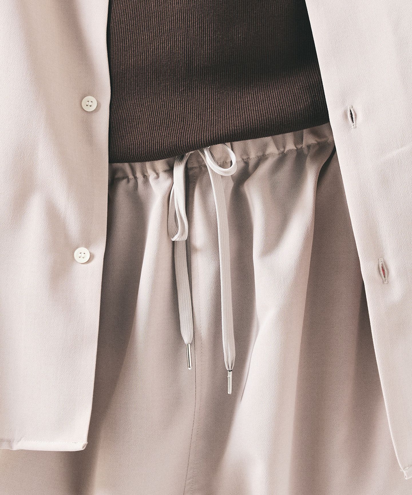 ウエストはイージー仕様で、ドローコード付き。穿き心地は軽いのに、見え方は崩れない。裾にはドローコード。そのままでもいいし、絞ってもいい。シルエットを少し崩す余地を残している。