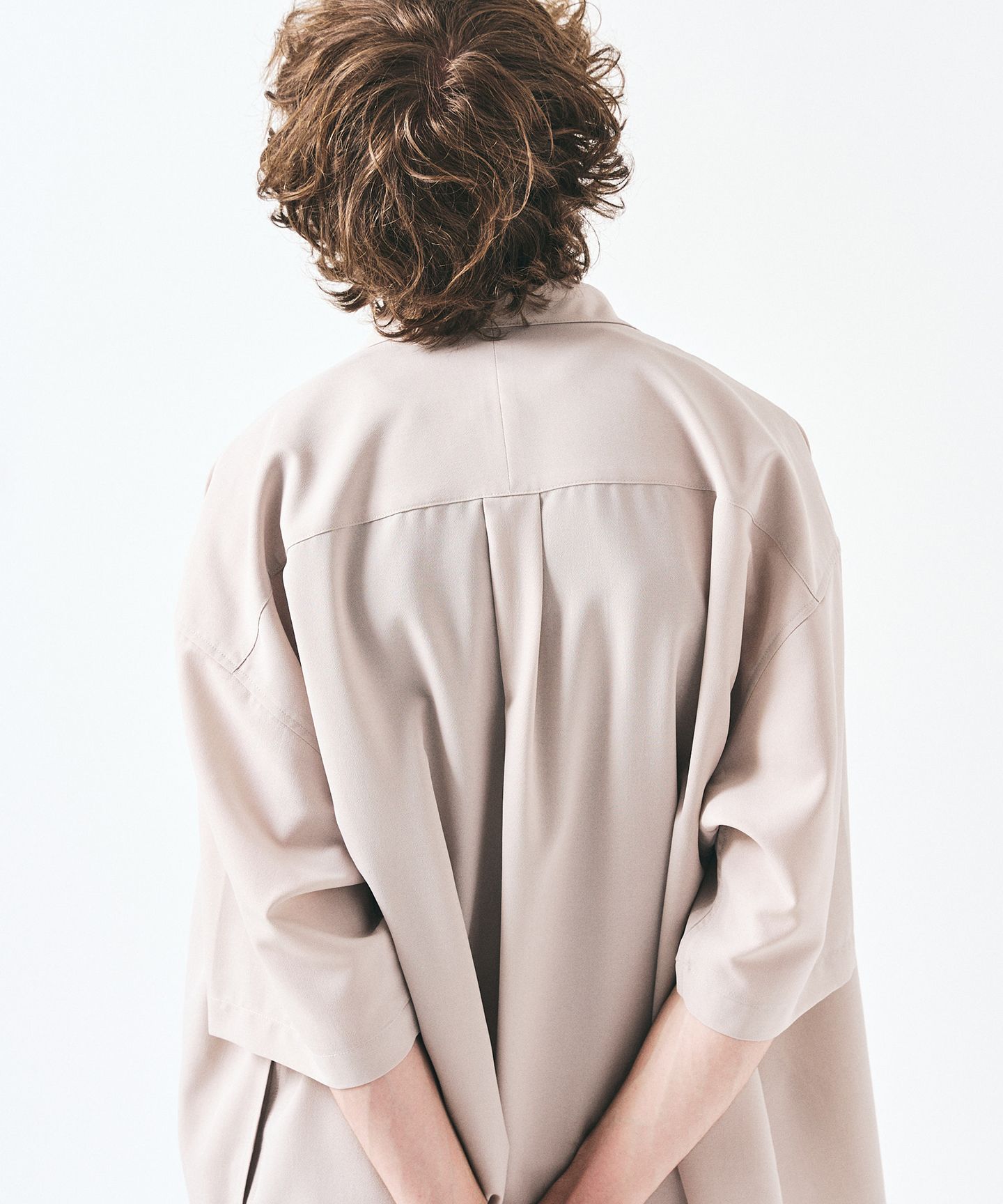 肩は落ちて、袖は広い。背面にはタックを入れて、膨らみをコントロールしている。ただのビッグシルエットじゃない。ちゃんと設計された余白。