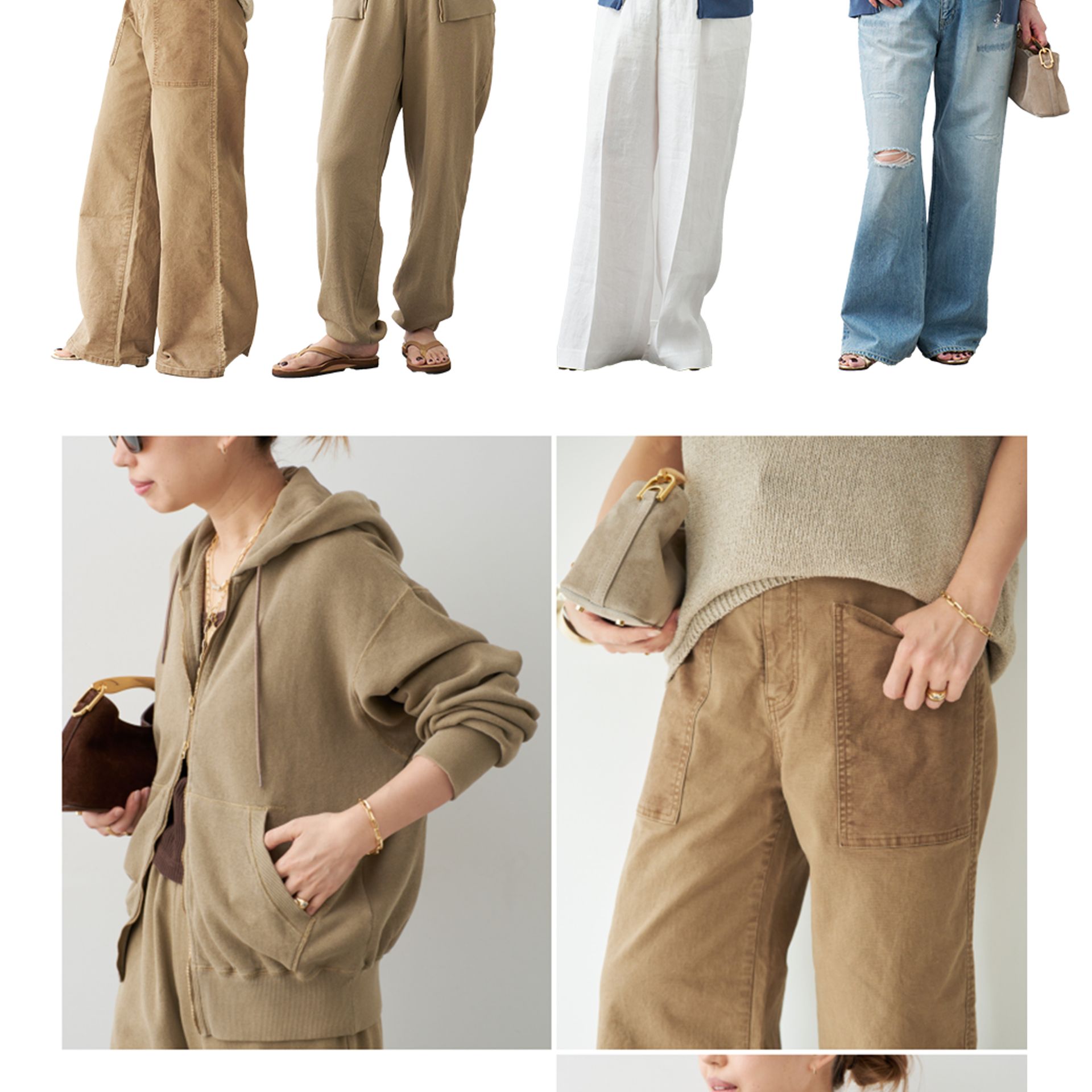 ストレートから裾を少し広げ若干フレアシルエットにすることで、ヒールだけでなく夏のビーチサンダルなどフラットシューズとも決まりやすいバランスに。