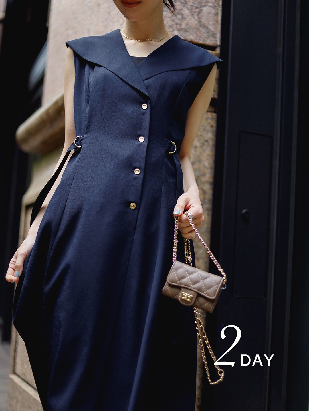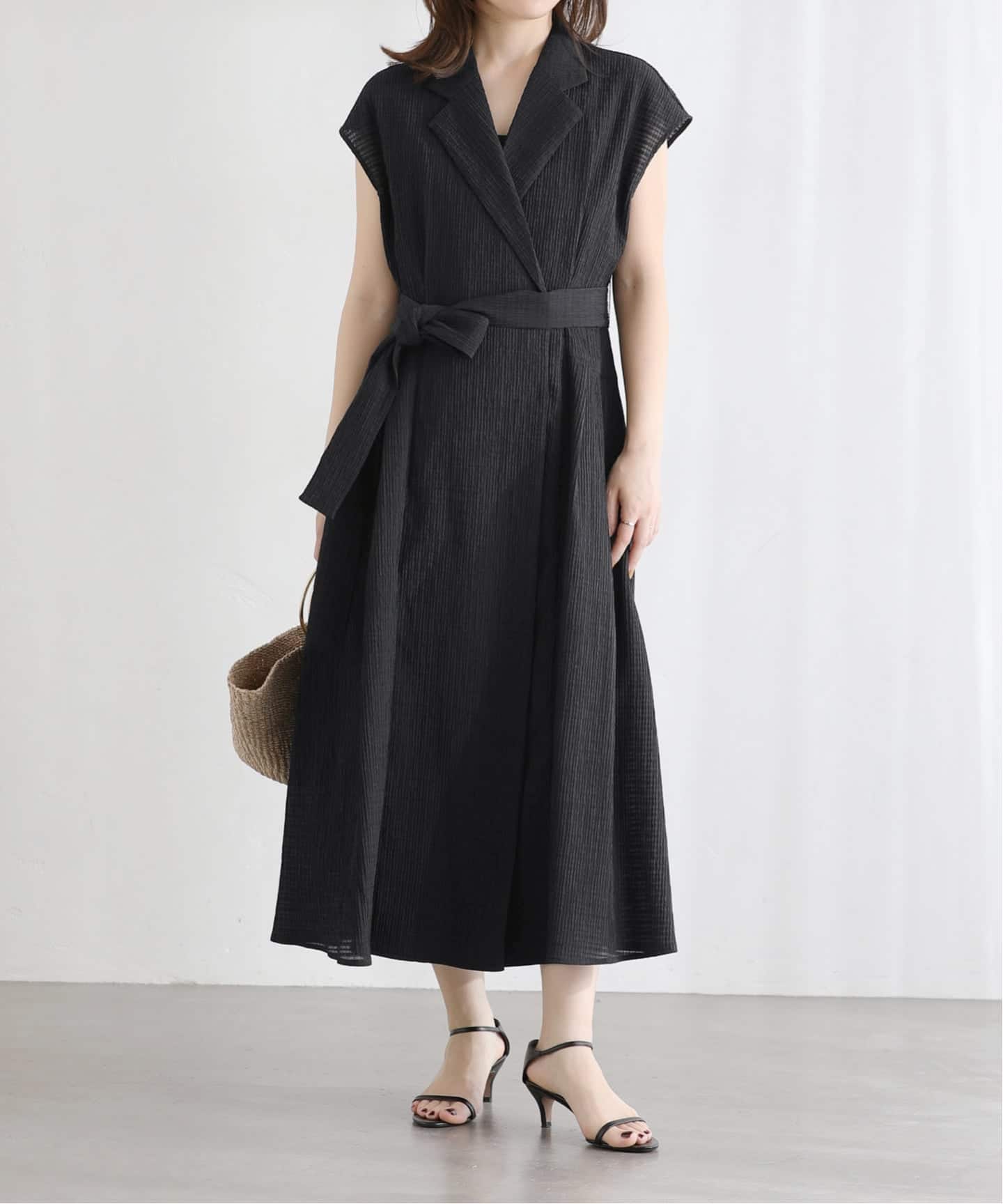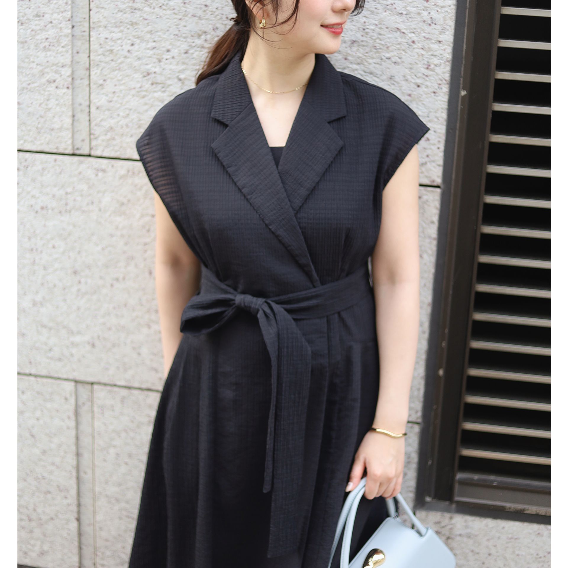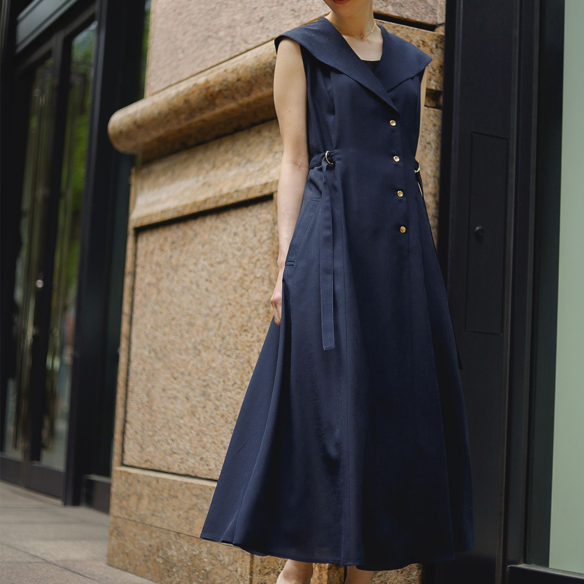 襟まわりやウエストのポイントなど、パッと目を引くデザイン性があり周りと被らないデザインなのに、街や日常に馴染むところがこのワンピースの使い勝手の良いところ。