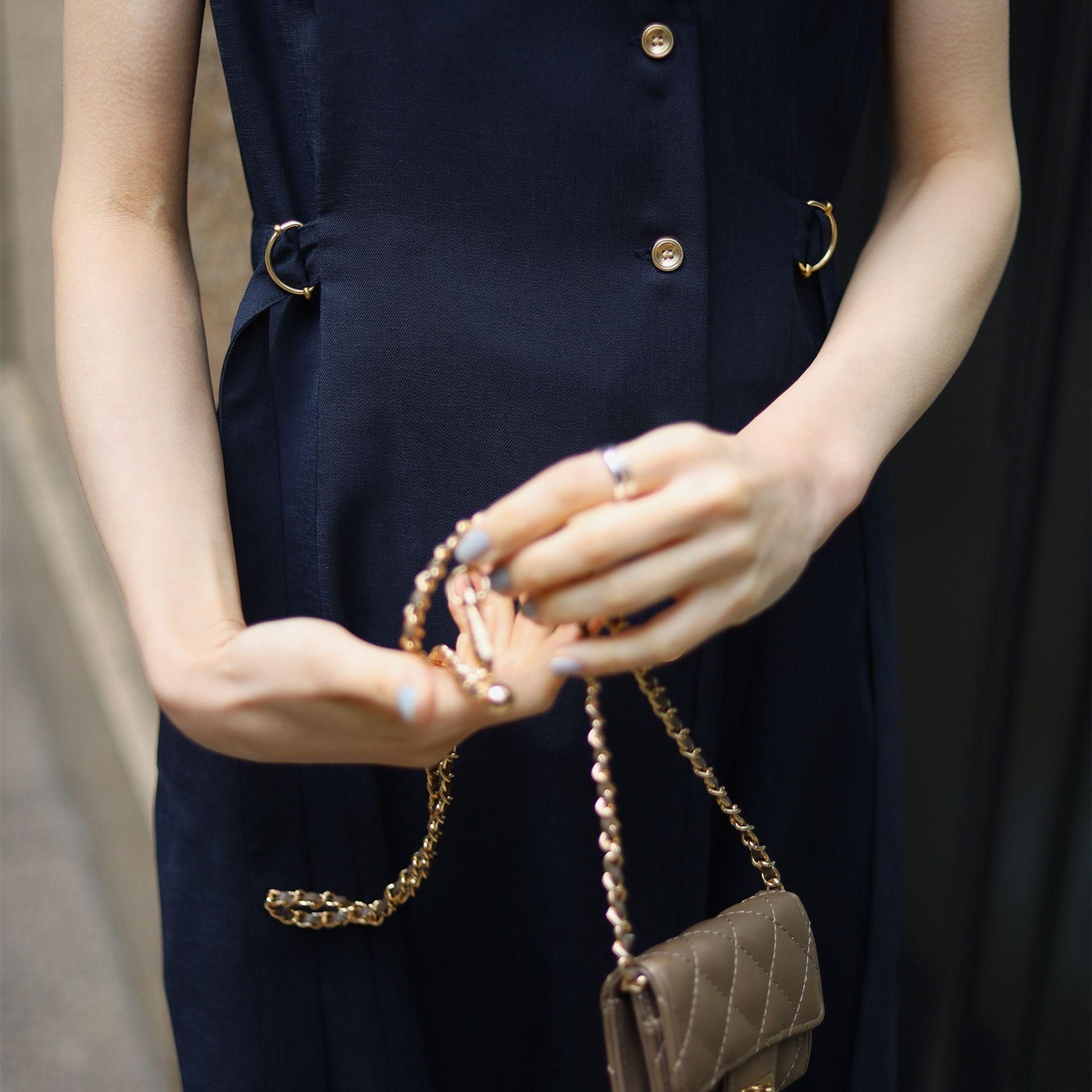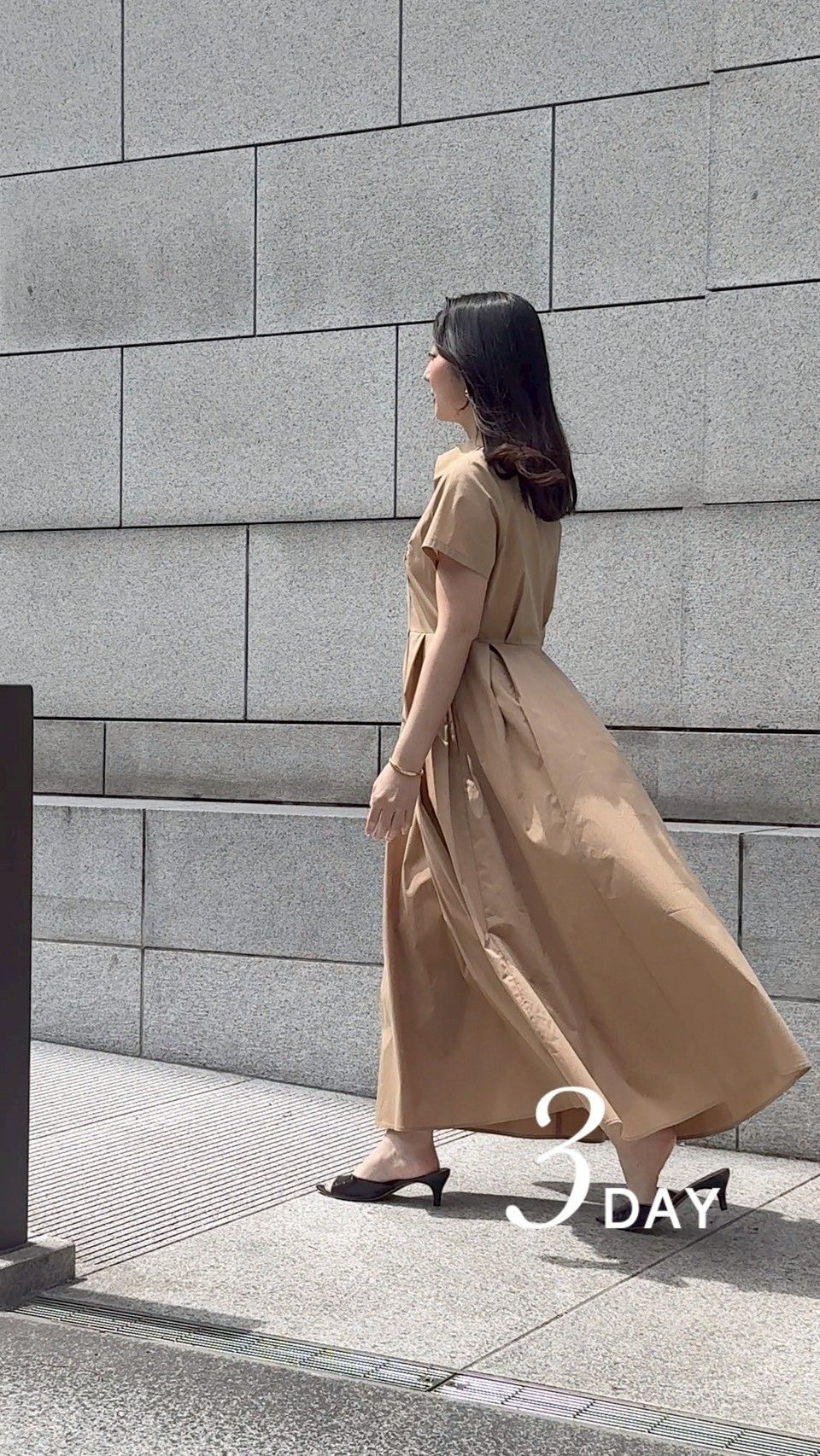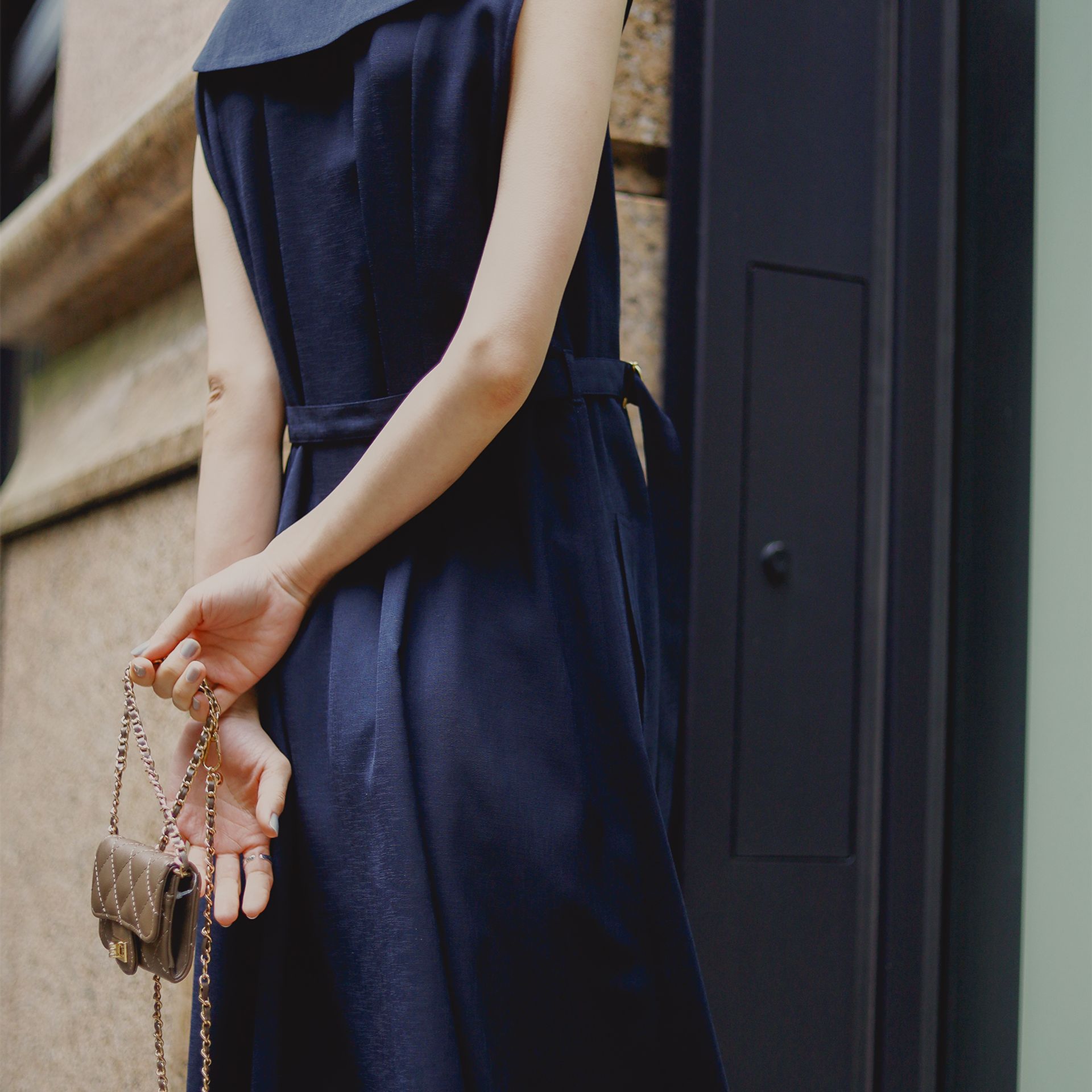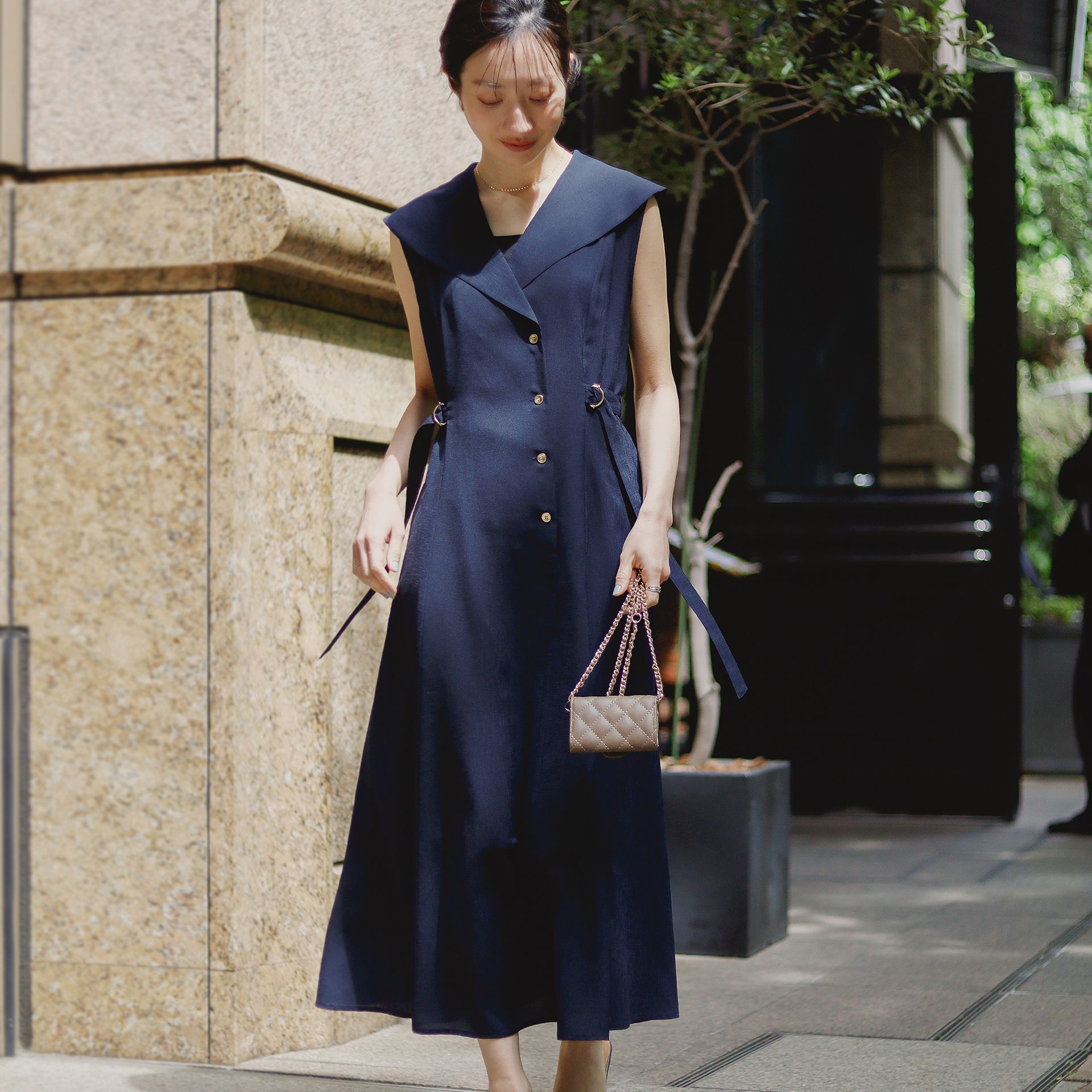 襟まわりやウエストのポイントなど、パッと目を引くデザイン性があり周りと被らないデザインなのに、街や日常に馴染むところがこのワンピースの使い勝手の良いところ。