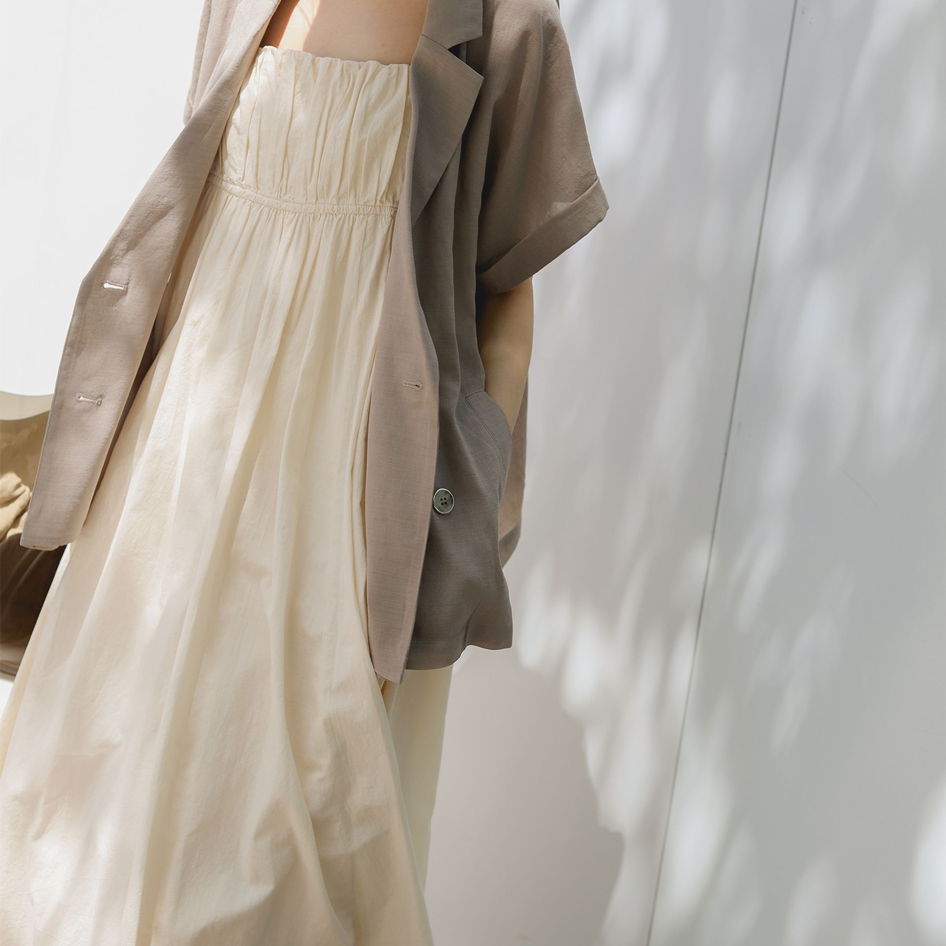 日中に1枚で着ればバカンス気分を演出し、夏のバルやビアガーデンなどとも相性の良い1枚。