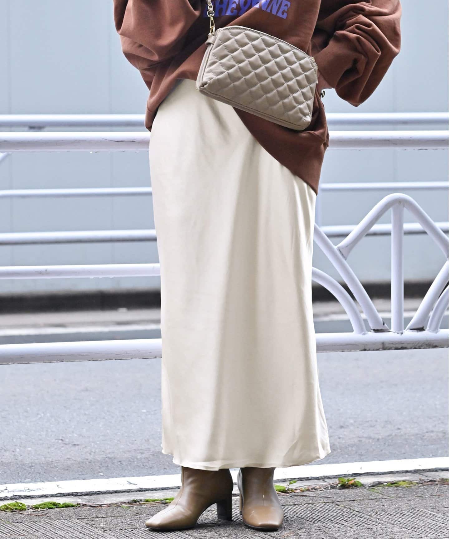 今の気分にぴったりなサテンマーメイドスカートはあえてカジュアルなスウェットで合わせるとこなれ感がでたスタイリングに◎ビッグサイズなトップスとも相性が良いです。