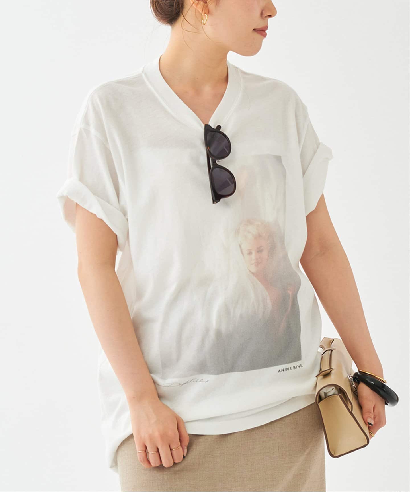 Tシャツだけど女性らしいシルエット感を楽しめるのでレイヤードスタイルにも◎