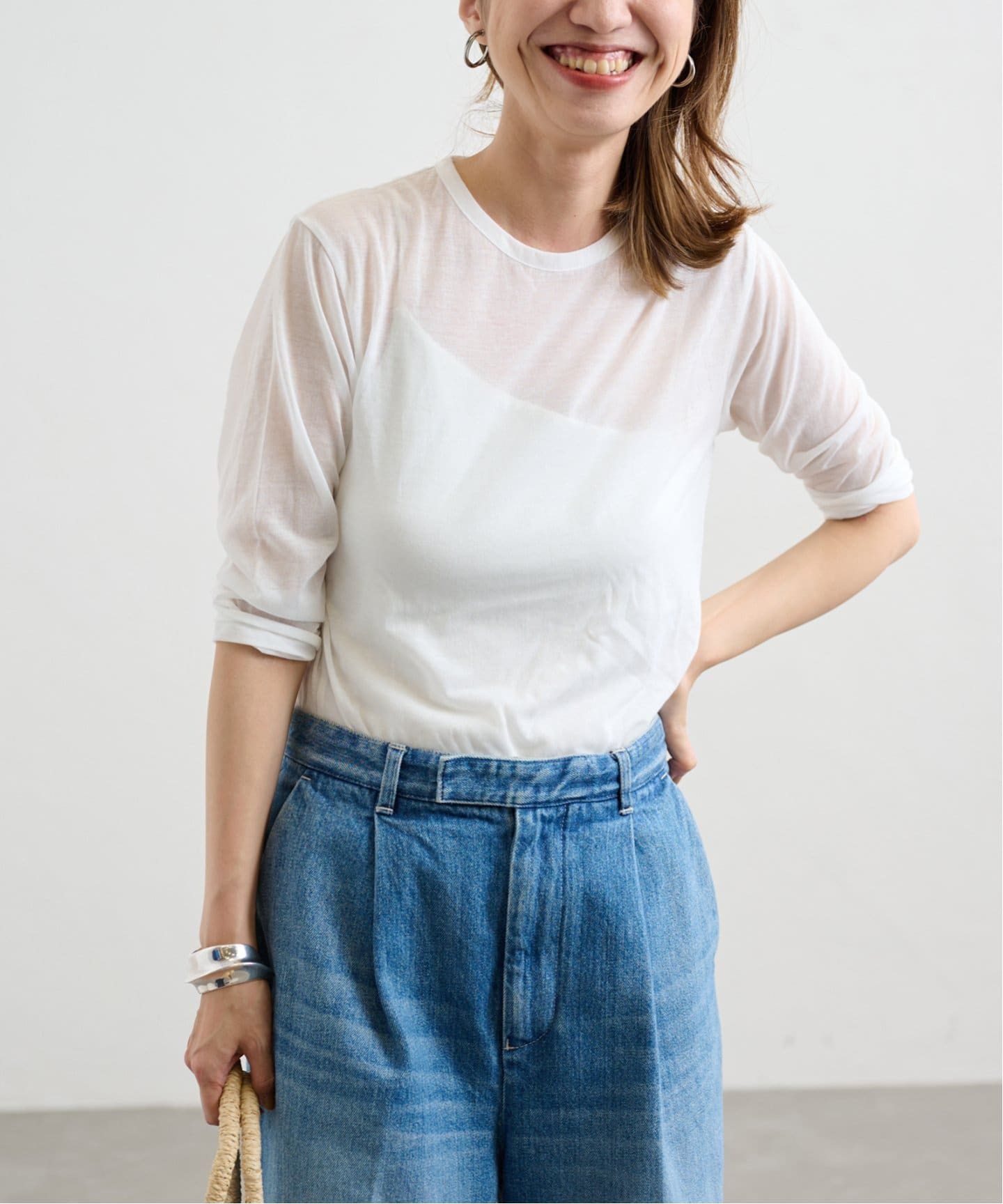 袖丈がちゃうどいいシアートップスで夏でも着れる1枚で黒と白と2色買いしました。