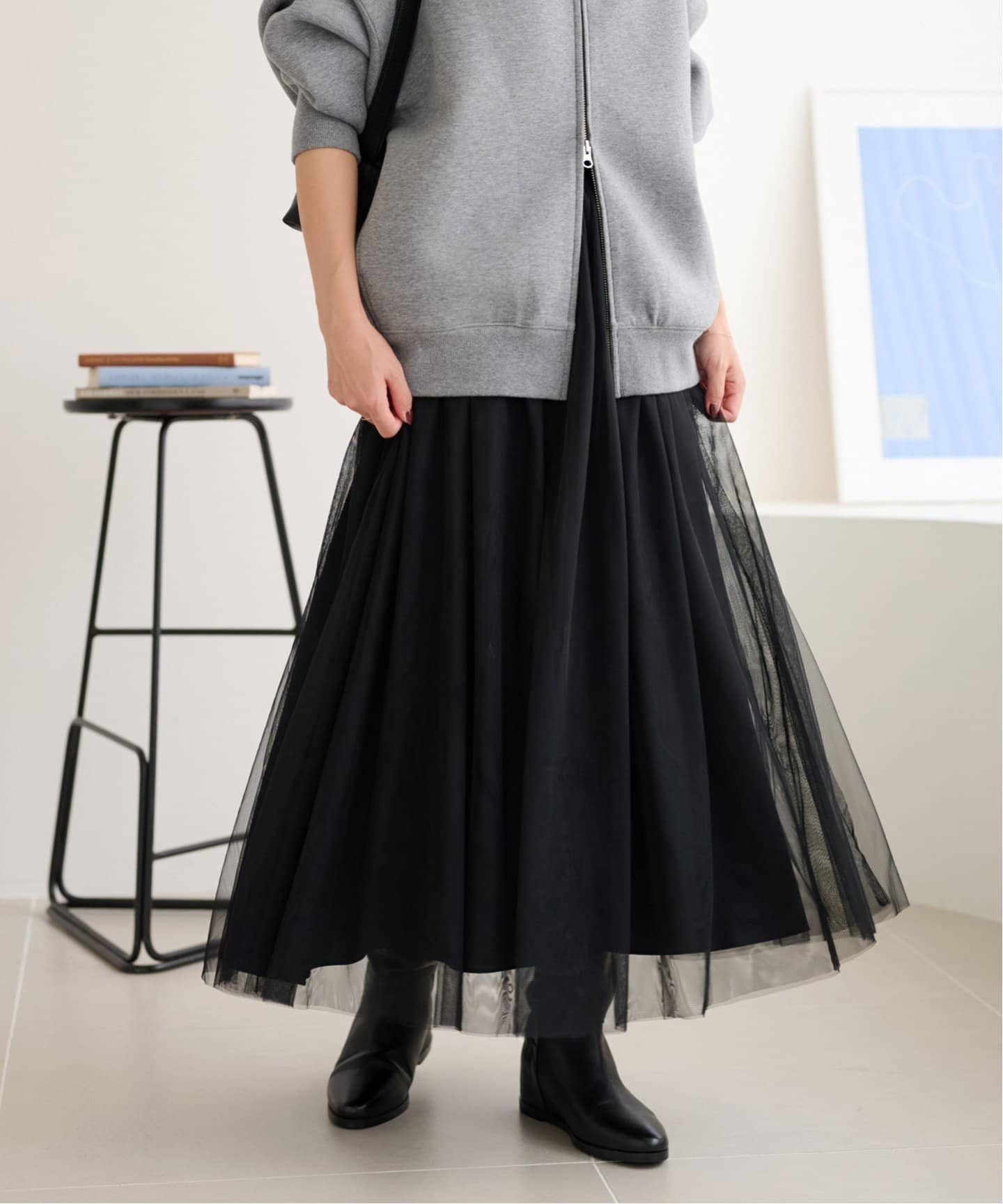 スカートはすっきりとしたロング丈でカジュアルなトップスに合わせても大人っぽい着こなしに。