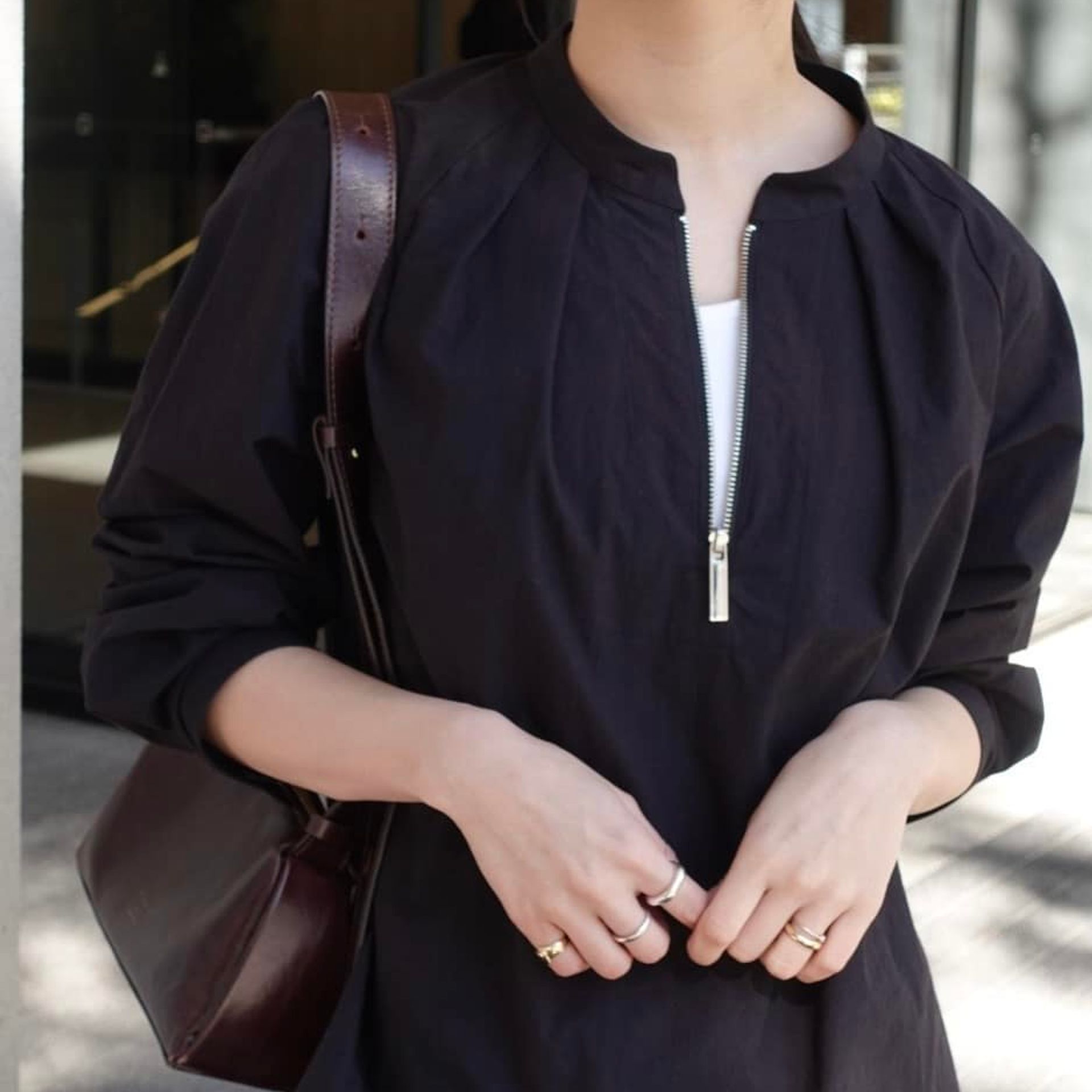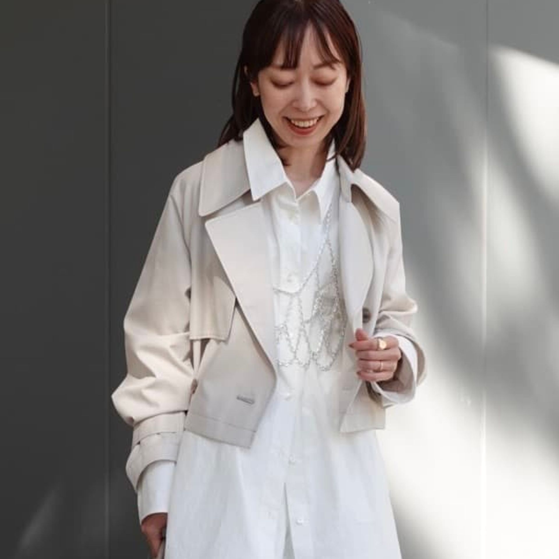 ビックシルエットシャツに、短丈のアウターを合わせて目線をぐっと上げることでスタイルアップ効果を持たせつつ、チェーンビスチェで艶感もプラス。のっぺりしがちなワントーンコーデにメリハリがでます。コートの袖口も少しだけ括って、シャツの袖をちら見せすることでこなれ感を出していただくのもおすすめの着こなしです。
