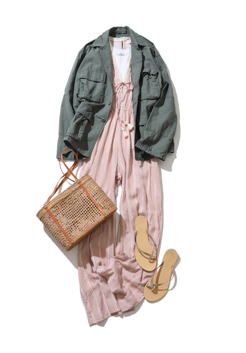 清涼感たっぷりのストライプ柄と、リラクシングなシルエットが春の気分にぴったりなジャンプスーツ。白インナーを合わせて今っぽくこなれさせつつ、サンダルやカゴバッグでシーズンムードを高めて。仕上げに辛口なミリタリージャケットを羽織って、デイリースタイルに昇華。