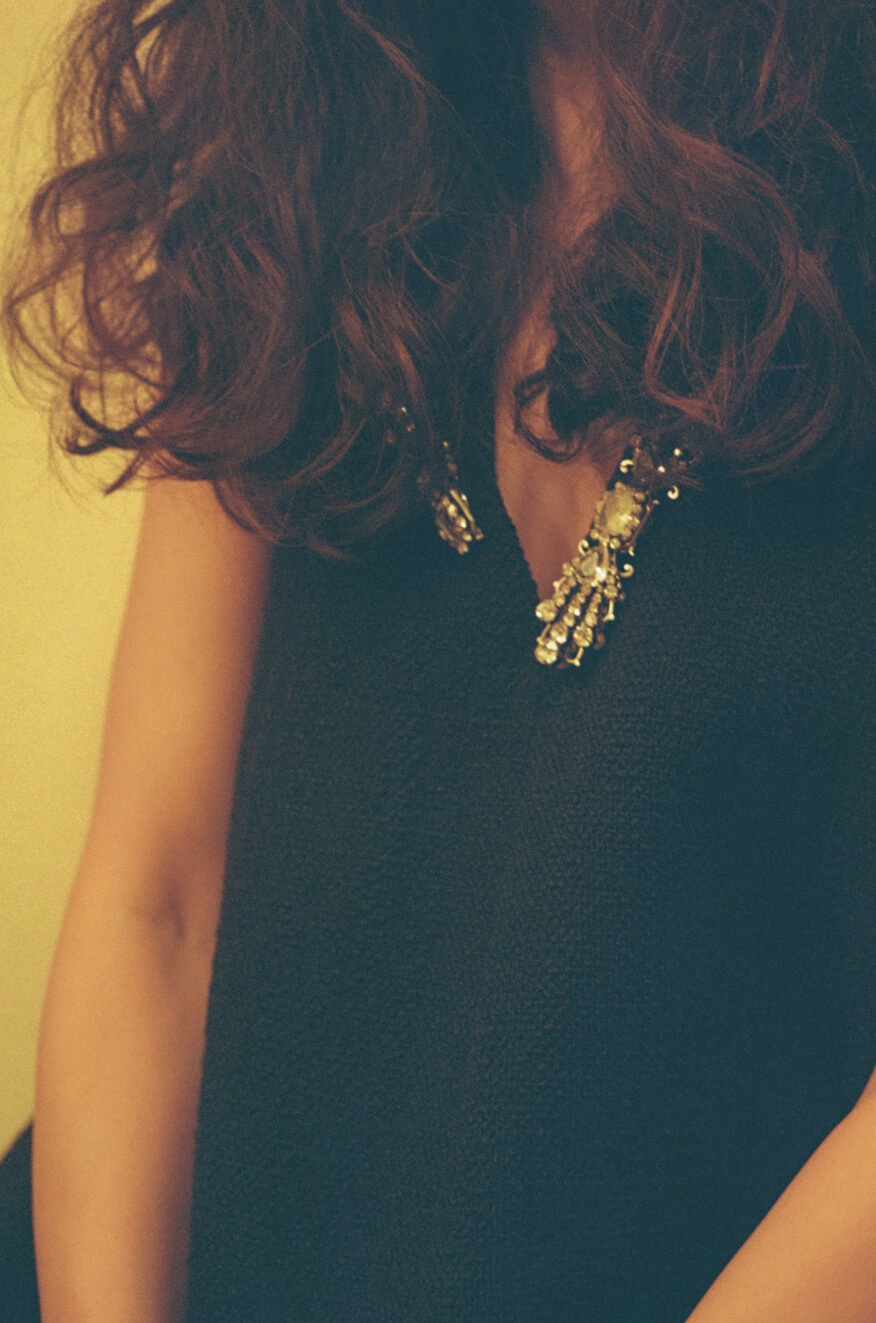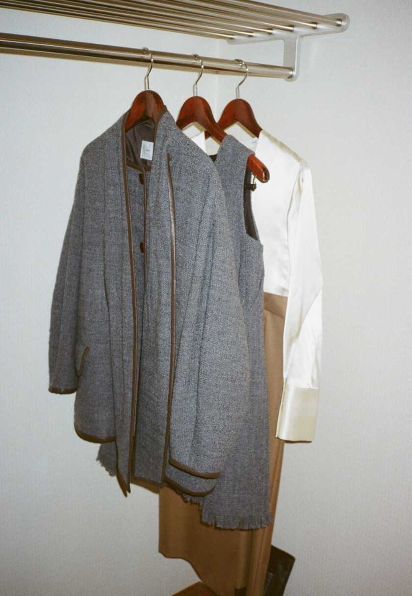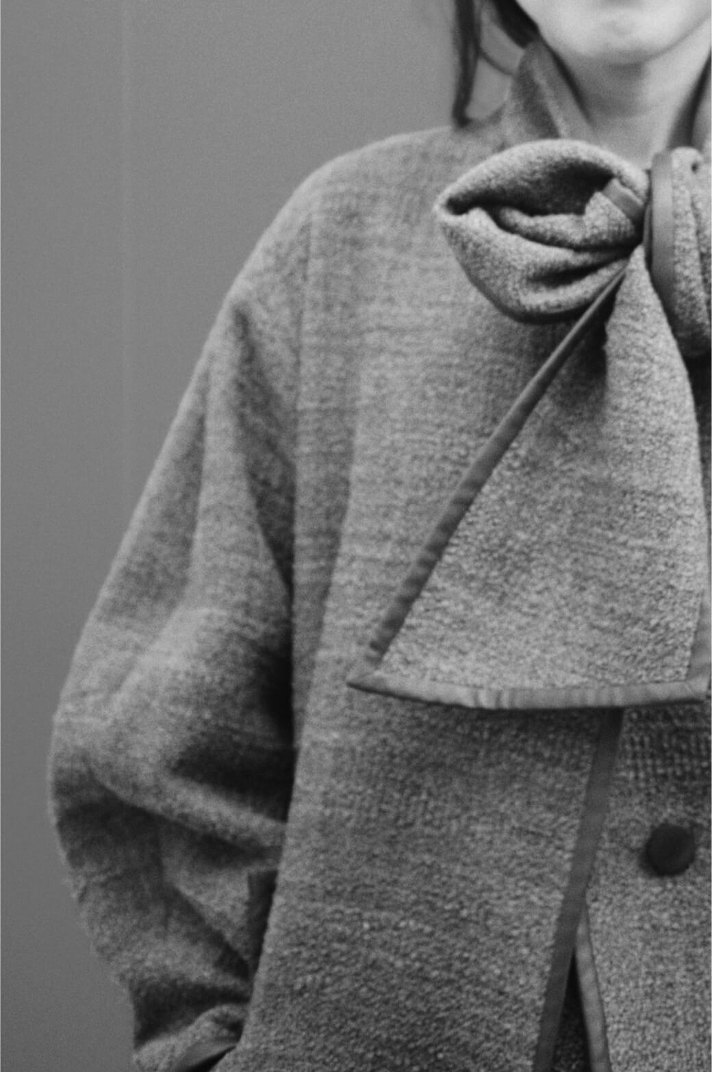アスコットシャツのように襟のリボンとコートが一体化したデザインが目を引くツイードのコート。顔まわりを華やかにしてくれる大きなリボンは、結んだら素敵なのは言うまでもなく、前を開けて緩く結んでも、無造作に垂らしているだけでも様になる。撮影中に辻さんの着こなしを見ていても、リボンのあしらい方ひとつでかなり楽しめる作りになっているのが伝わってきた。そして、もうひとつ辻さんがこだわっているのは着丈だとか。同生地のワンピースと合わせた時に、コートの裾から出る生地の分量や見え方を特に意識し、絶妙なレングスに仕上げているという。撮影したルックをもう一度見てみると、セットアップはもちろん、様々な着回しにも応用できる万能なシルエットであることがわかる。
