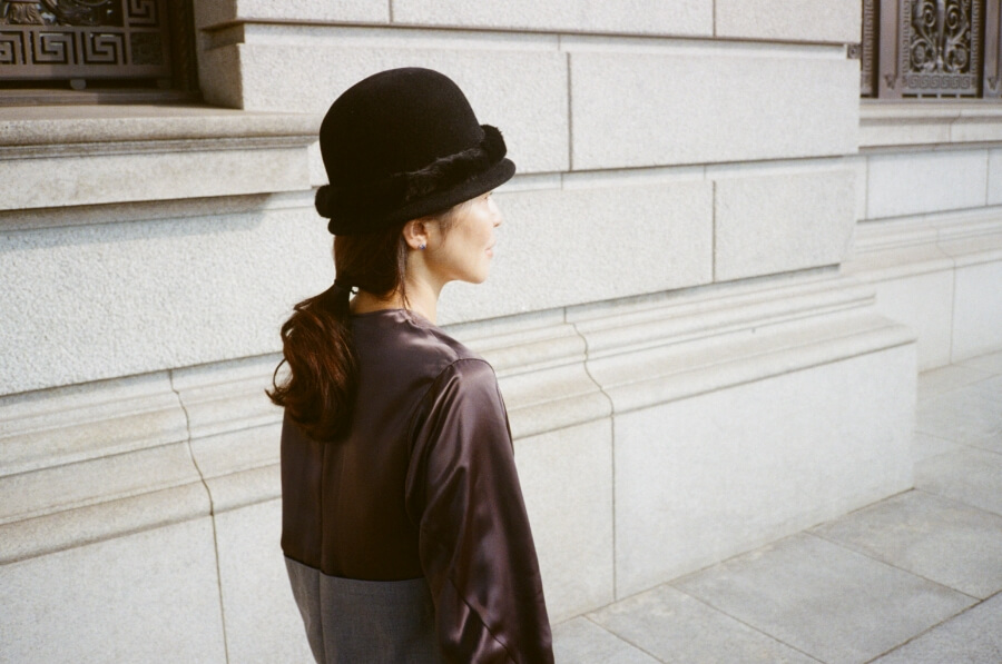 ボーラーハットを彷彿とさせるクラシカルな佇まいなのに、見覚えのない独特なデザイン。それがこのハットの第一印象だった。その疑問を辻さんに尋ねてみると、今回のコレクションのためにオートクチュールの帽子を手がけるHaute Mode Hirataにオーダーしたという。しかも、辻さんのイメージスケッチを元にイチから型を作り、クラウンの高さやブリム幅を何度も調整した、こだわりのハットなのだ。上質な素材と、上品なカラーリングで仕上げたハットは、ファーのありとなしの2型展開。シックな女性に相応しいエレガントさを纏った、正真正銘の逸品だと思う。