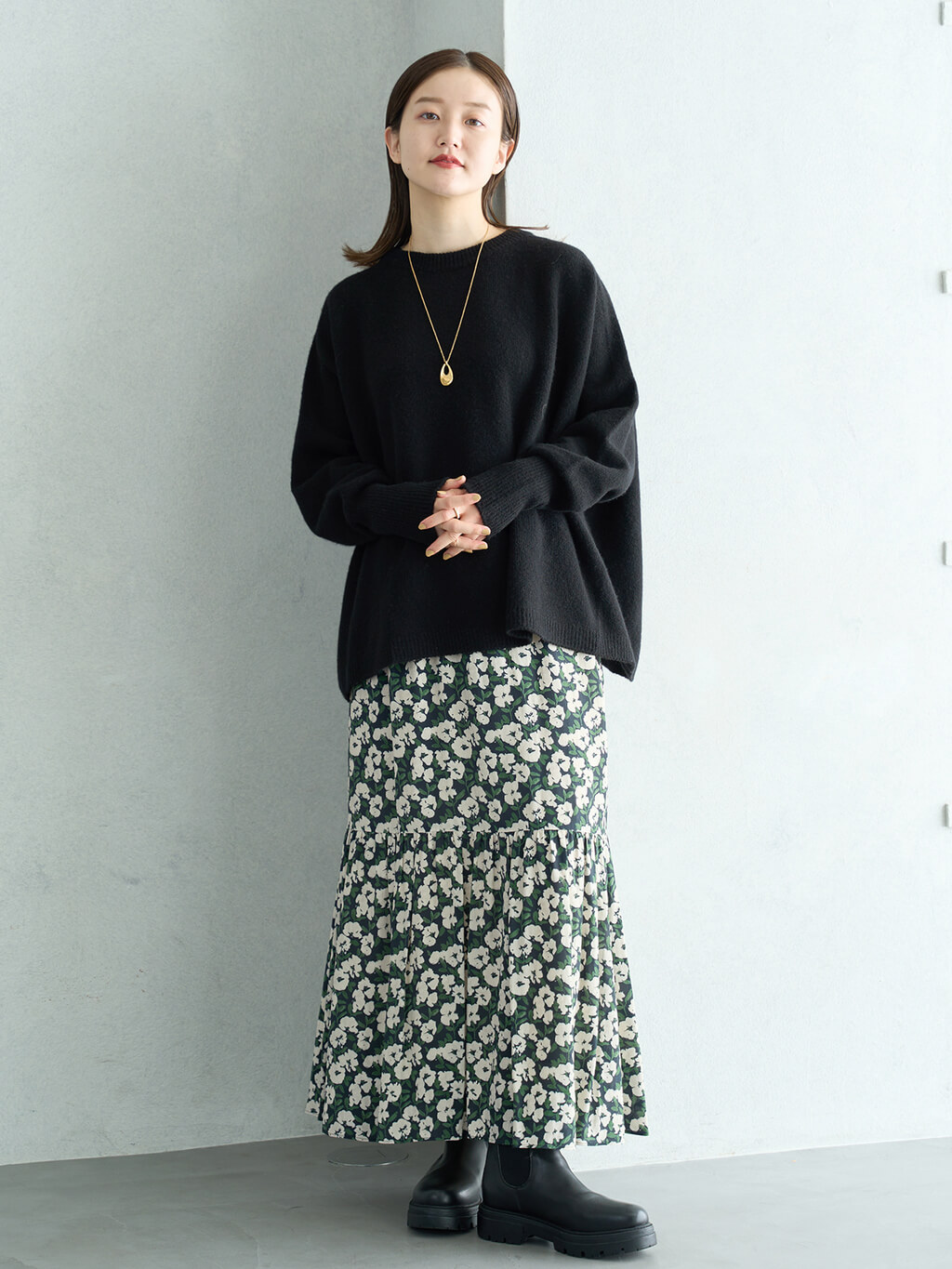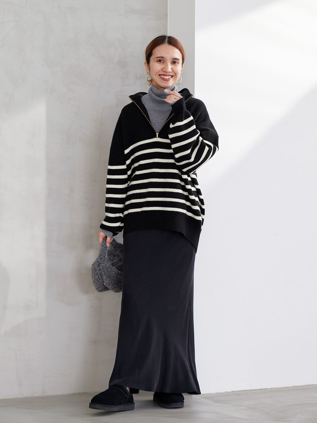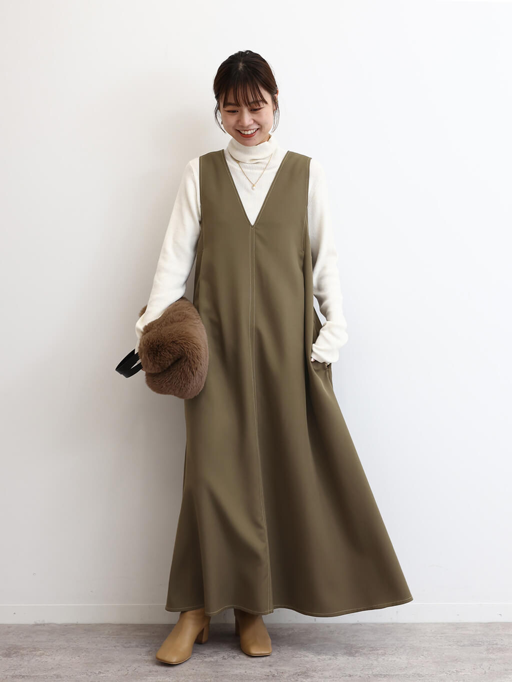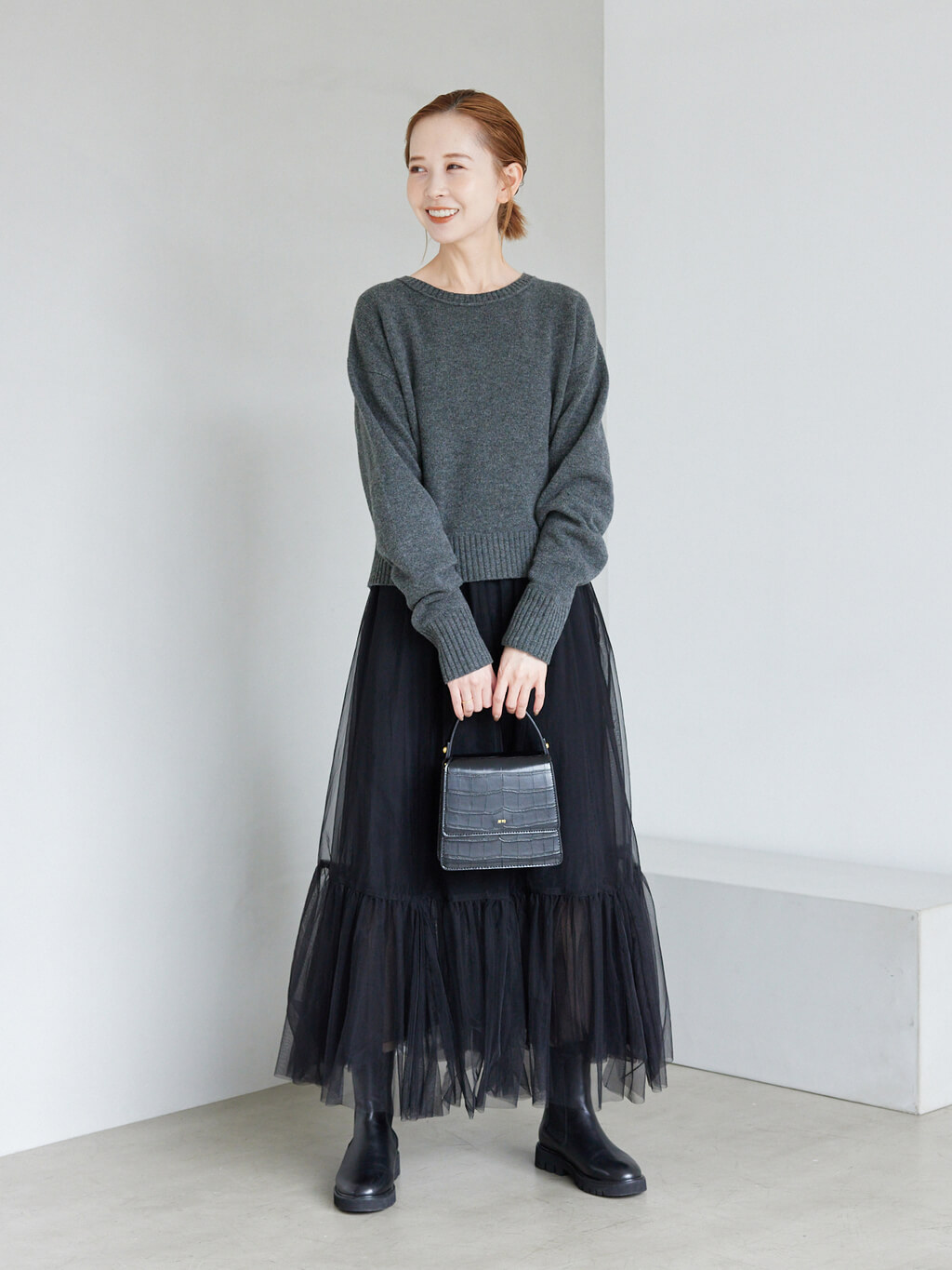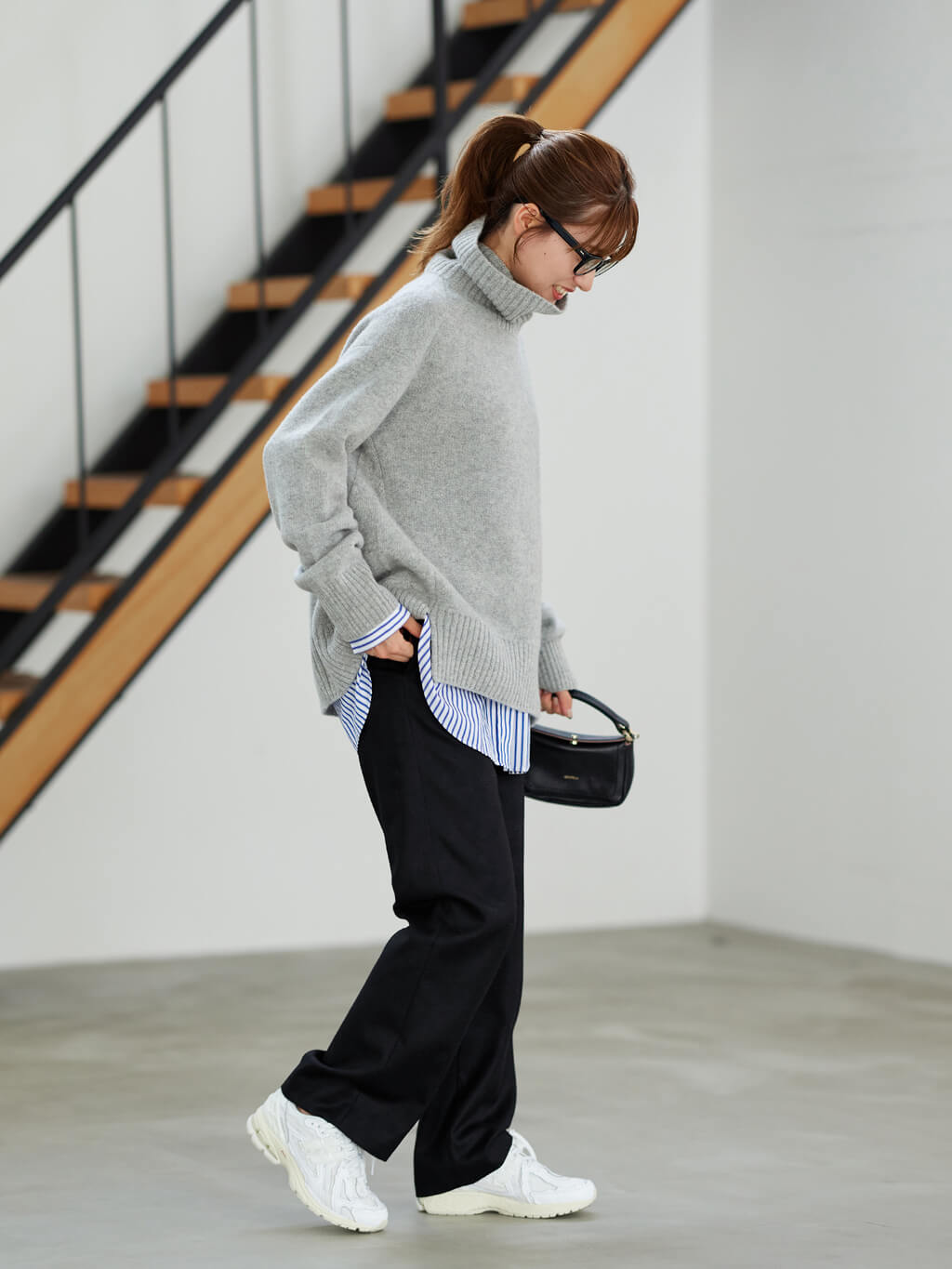 タートルネックニットレイヤードするだけで今っぽいスタイリングになるタートルネックニットは冬のマスト。ジャンスカの下にインするのがおすすめ。1枚でサマになるゆるめのシルエットは、首元を折り返さずに着るとスタイリッシュに。