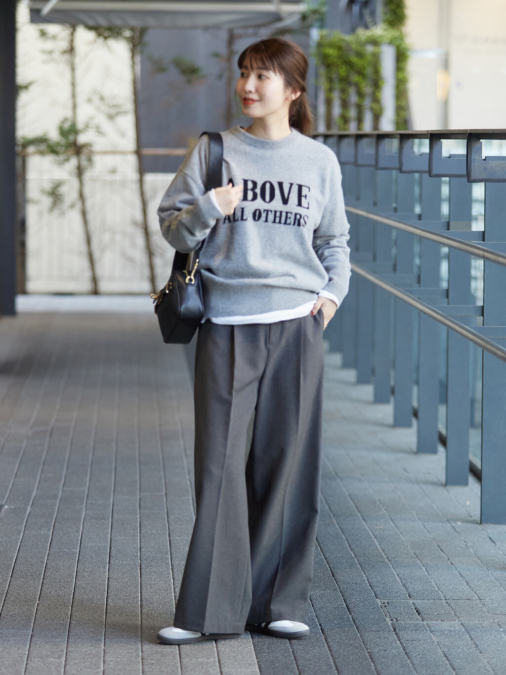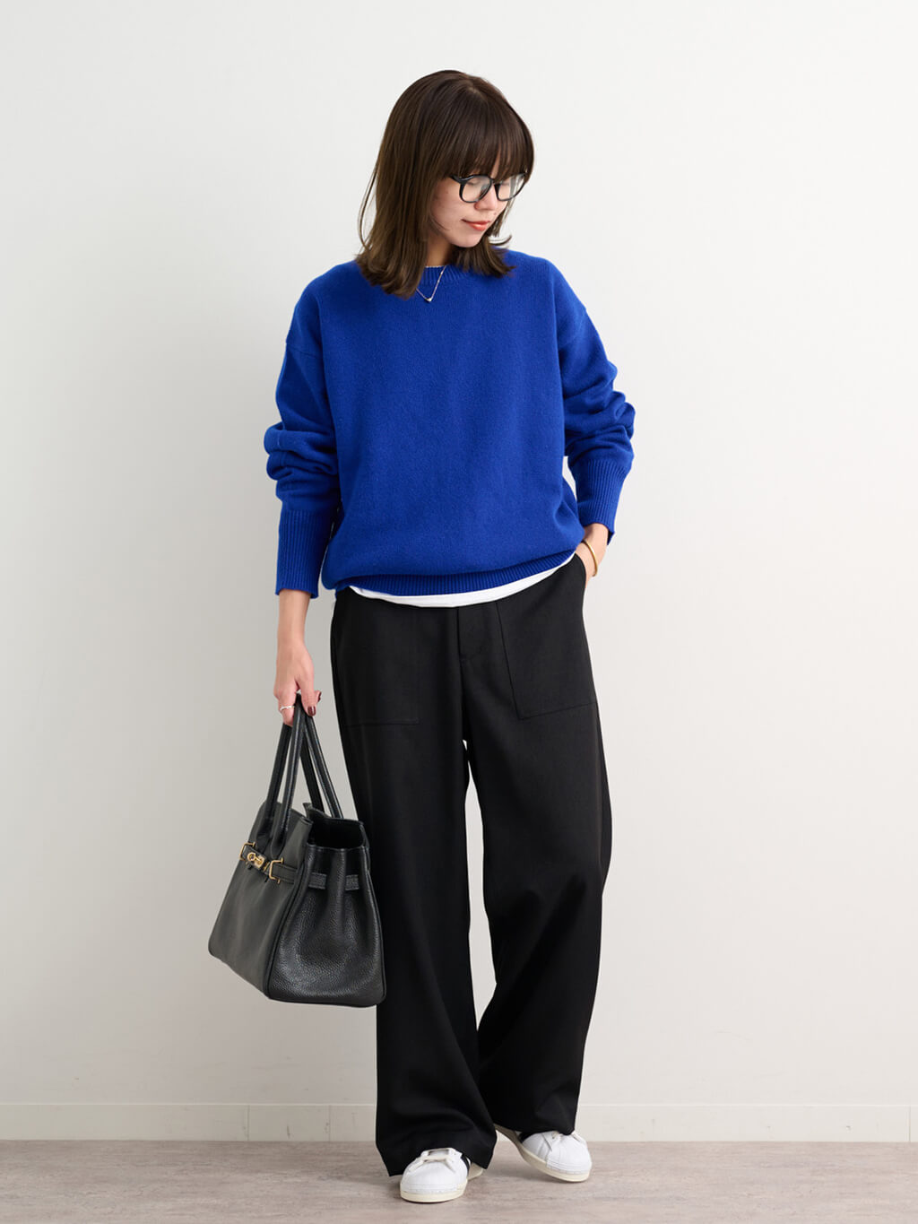 リラクシーな着こなしで楽しむ汎用性抜群のクルーネックニットは、開きすぎず詰まりすぎずの首周りが上品なイメージ。ゆるっとしたシルエットでもキレイめにまとまるので、マキシスカートやワイドパンツをつなぐだけで肩の力が抜けたリラクシーなコーデが簡単に叶って◎。