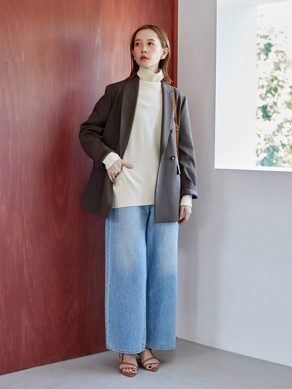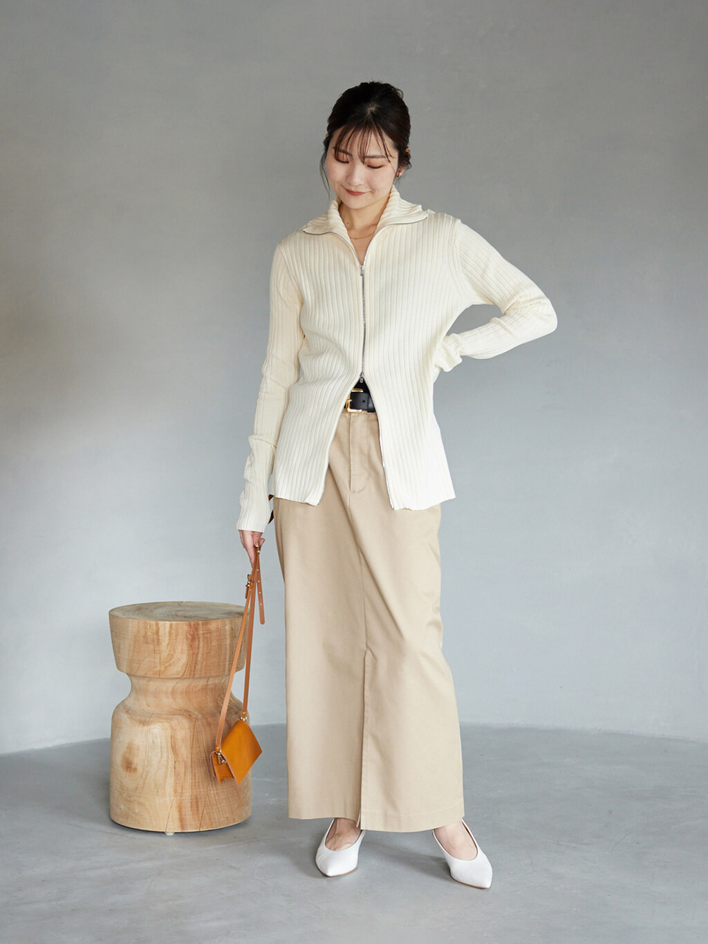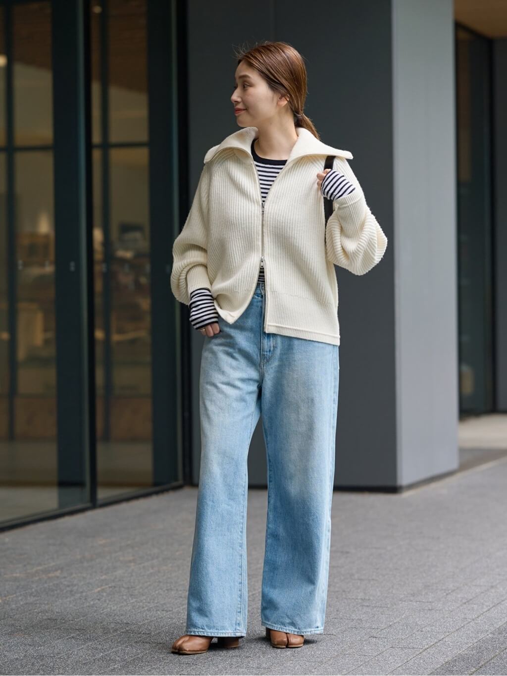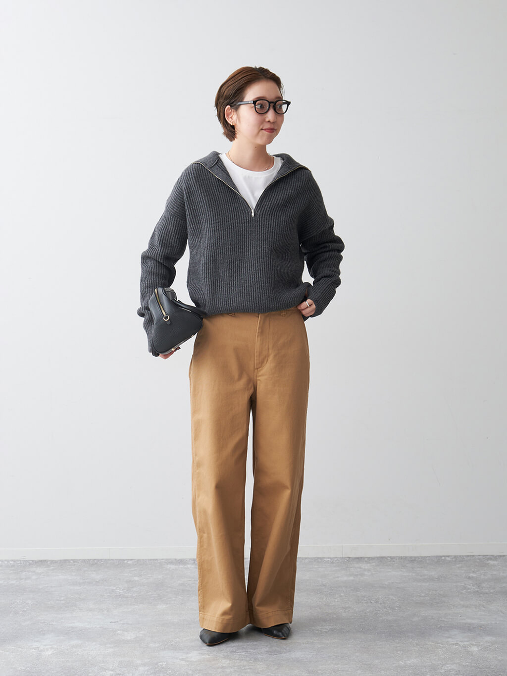ジップアップニットはゆるく開いてトレンドのジップアップ&ハーフジップニットはジップを少し開いてニュアンスを醸して。FRAMeWORKのようにタートルネックニットを差し込んだり、JOURNAL STANDARDのようにボーダートップスをインしたりするとグッドバランス。