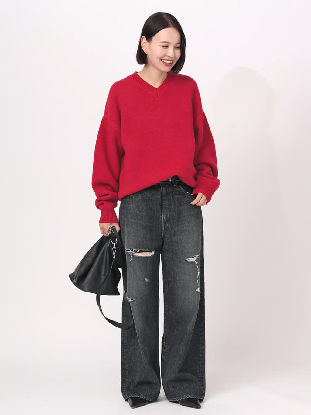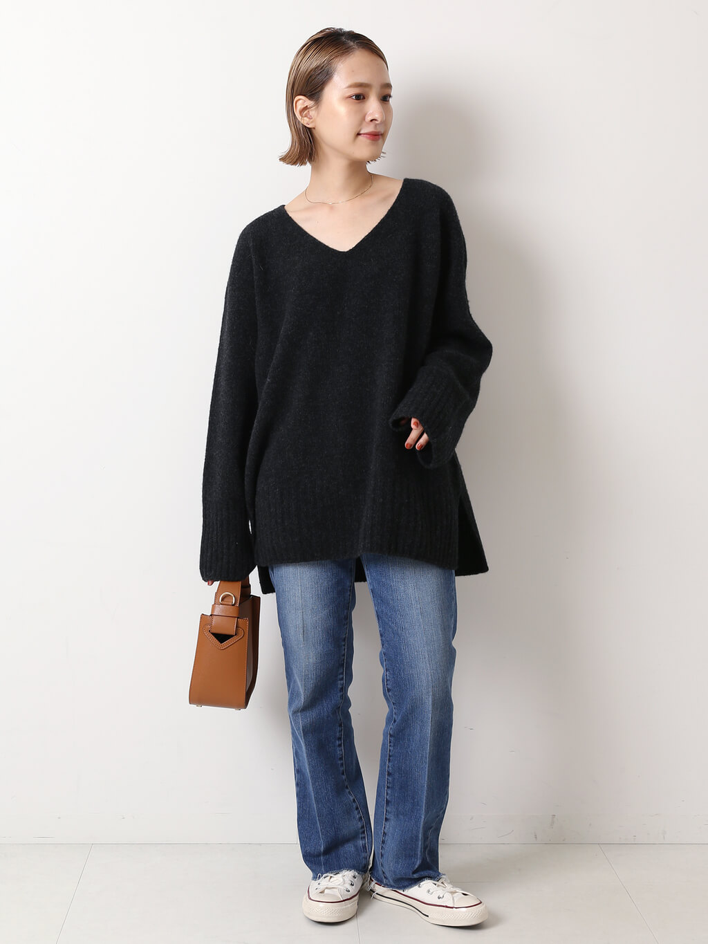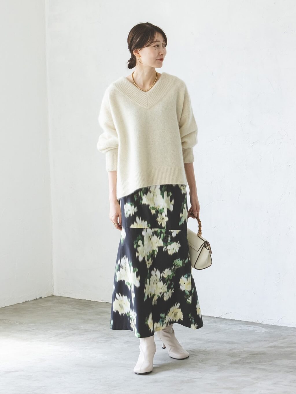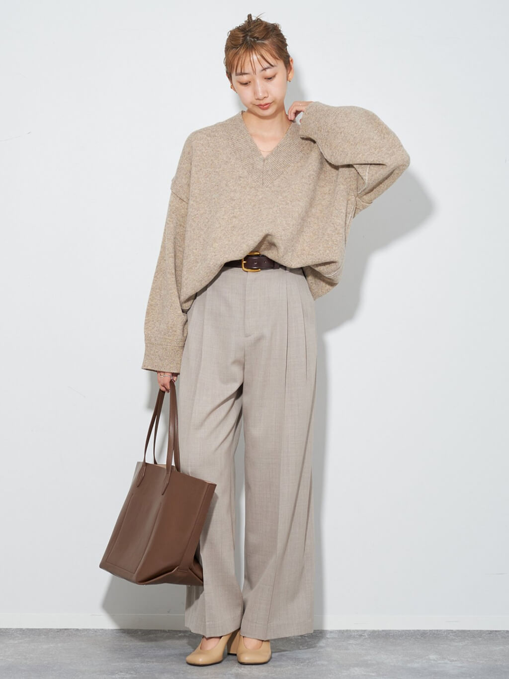 さらっと1枚で箔がつく身幅は大きめでボディラインを拾わず、首元は鎖骨をキレイに見せる開きすぎないネックラインが今年らしいVネックニット。Plageのようにベージュのワントーンでまとめると、さらにこなれ感がアップ。