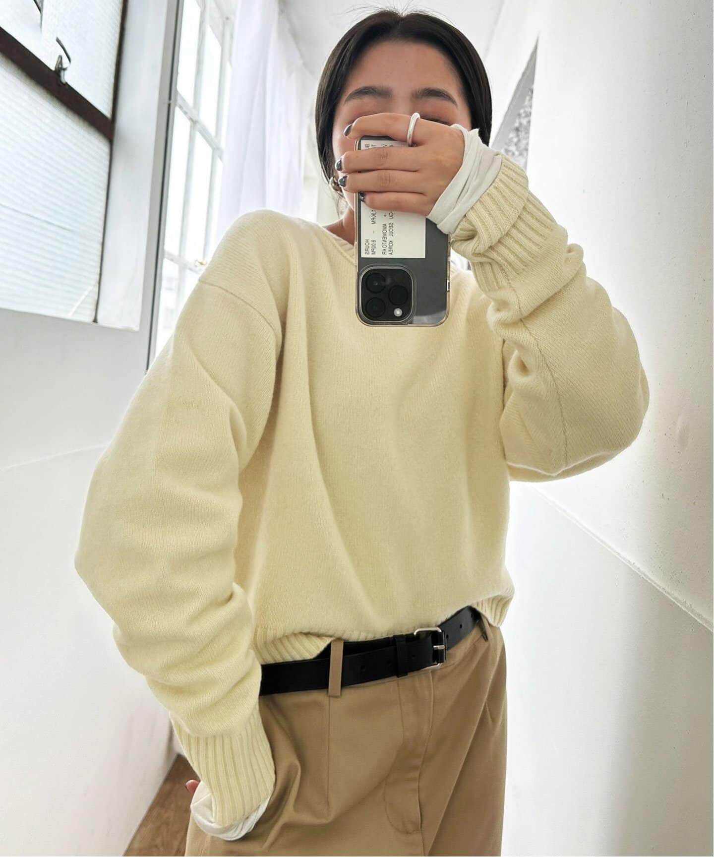 コートの中でもたつかない絶妙なゆるさが◎Deuxieme Classeのミドルゲージ プルオーバーやNOBLEのYAKワイドVネックニットなど、適度なゆるさや大きめのスリーブが大人可愛いムードを醸すニットが続々。コートの中でももたつかず、華奢見えも叶える絶妙なフィットが高ポイント。