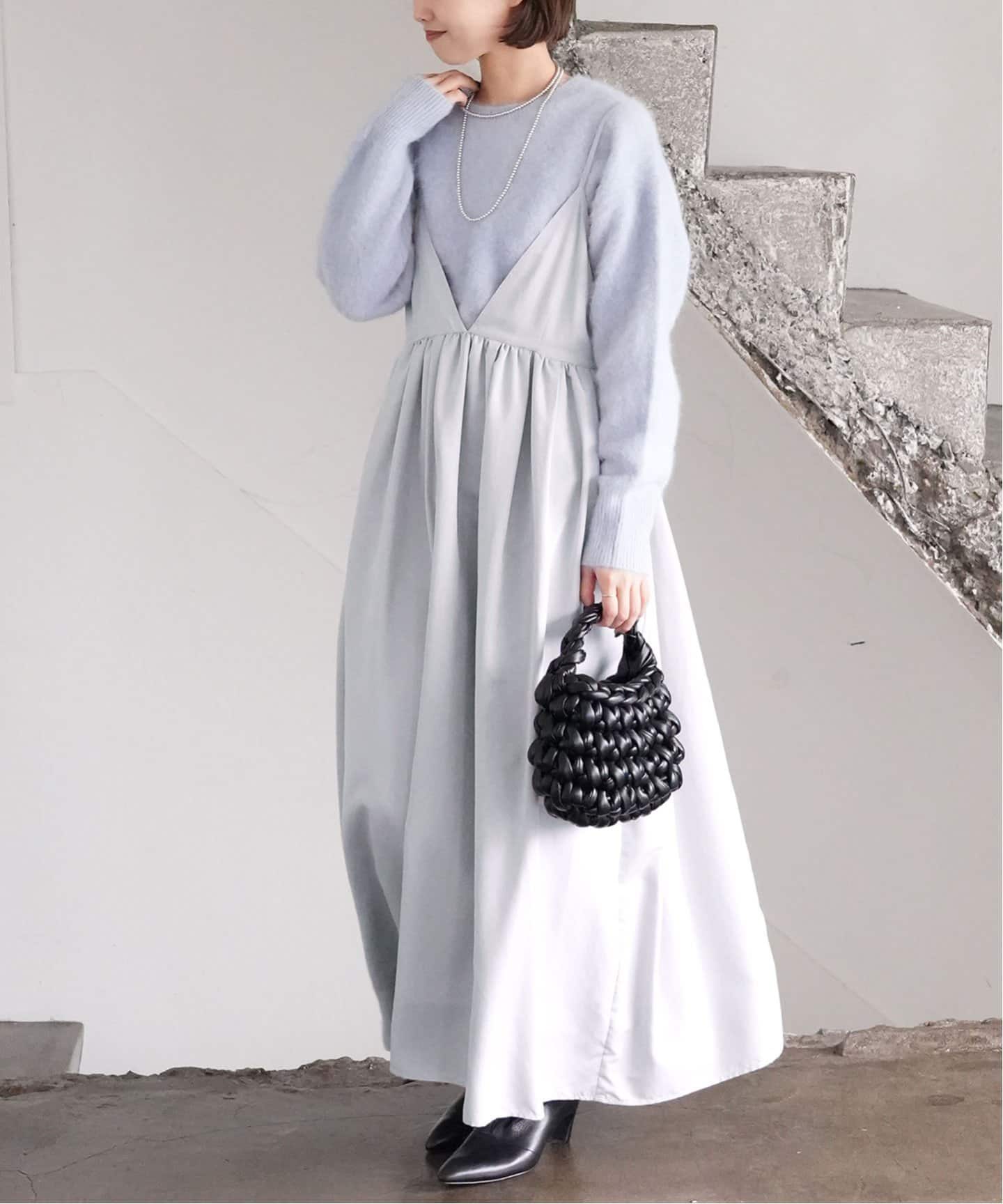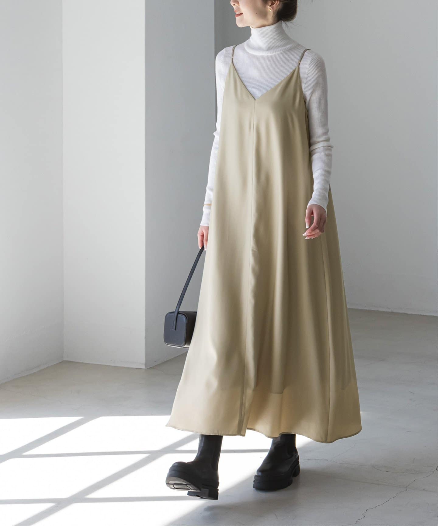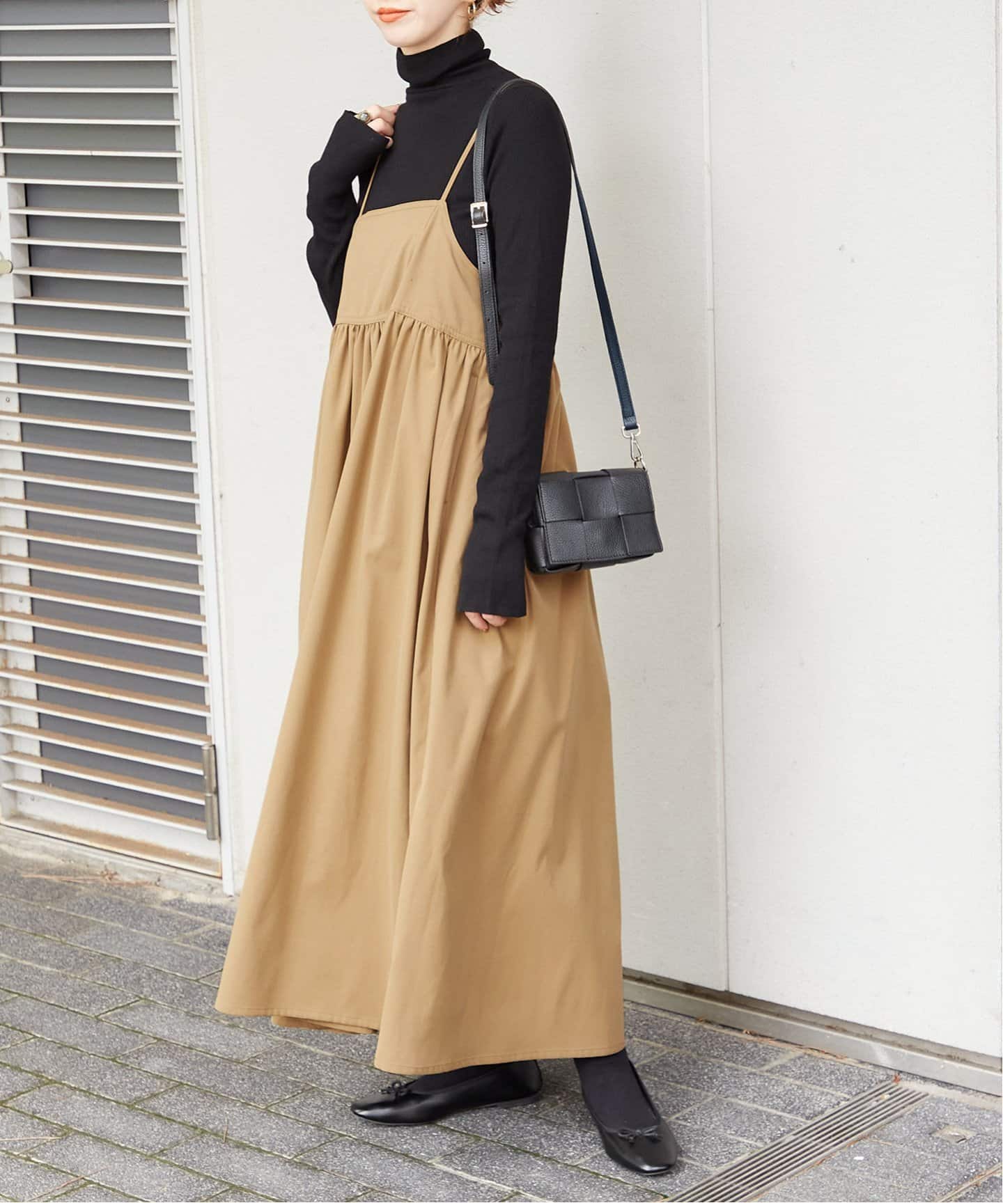 ワンランク上の冬コーデにタートルネックニットや暖かトップスをインすれば真冬も活躍するキャミワンピース。ギャザーを寄せてフェミニンに広がるフレアシルエットが、重たくなりがちな冬コーデに女性らしい軽さをプラス。