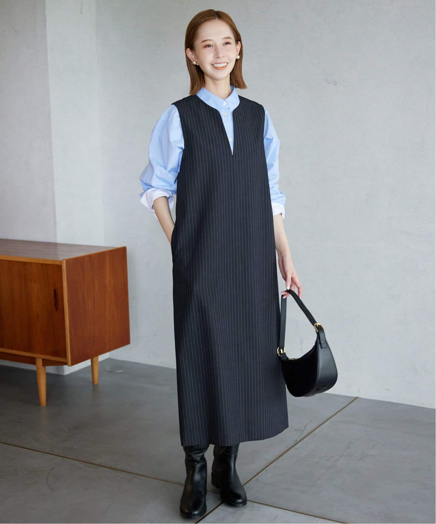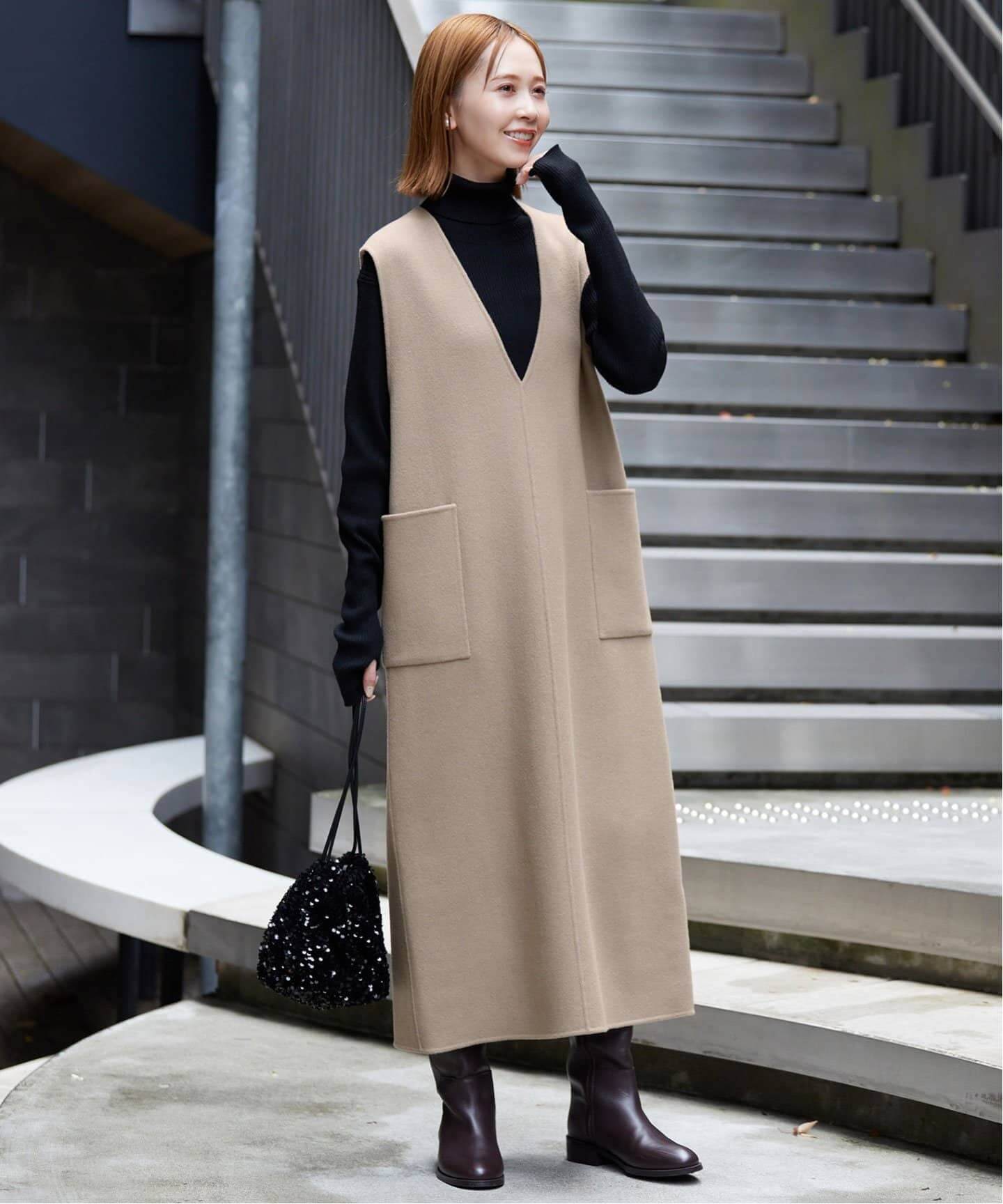 上質素材にこだわって上質なウールを使ったSuper110をブレンドして仕立てたSLOBE IENAのダブルフェイスジャンスカのように、一点投入で装いを格上げしてくれる大人顔ジャンスカが便利。スッキリ開いたVネックは、アクセサリーやレイヤードでひと工夫を。