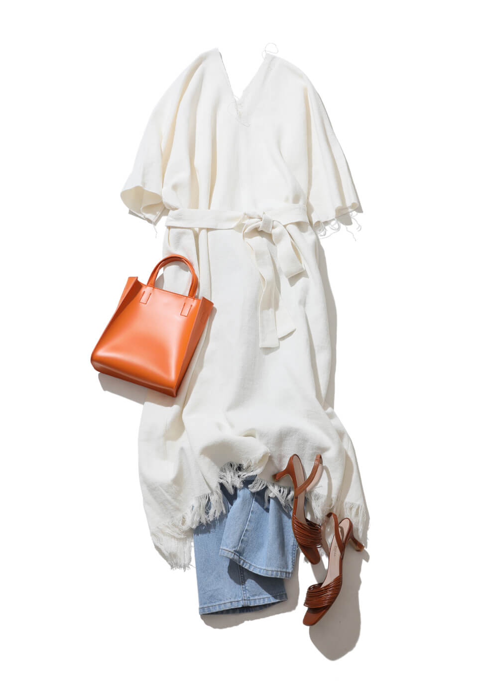 切りっぱなしのディテールやフリンジの裾など、随所にこだわりが詰まった白ワンピースをライトウォッシュのデニムと合わせて、洗練のカジュアルをメイク。ボリュームのあるシルエットはウエストのベルトでメリハリをプラス。目を引くオレンジのバッグでスパイスを添えて。