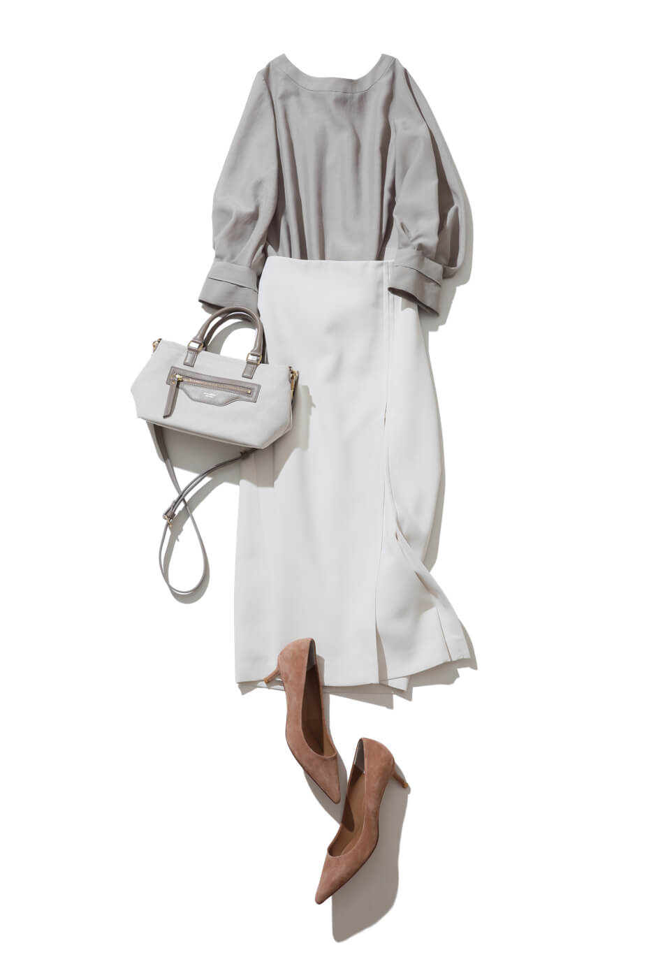 透け感とふんわりボリュームがフェミニンな雰囲気のブラウスに対し、ボトムスはシャープな大人っぽさを醸すジップAラインスカートでメリハリをプラス。袖のエアリーなボリュームが一層引き立って、女っぽいシルエットのバランスもちょうど良い塩梅に。洋服の色と同じバイカラーバッグがベストマッチ。
