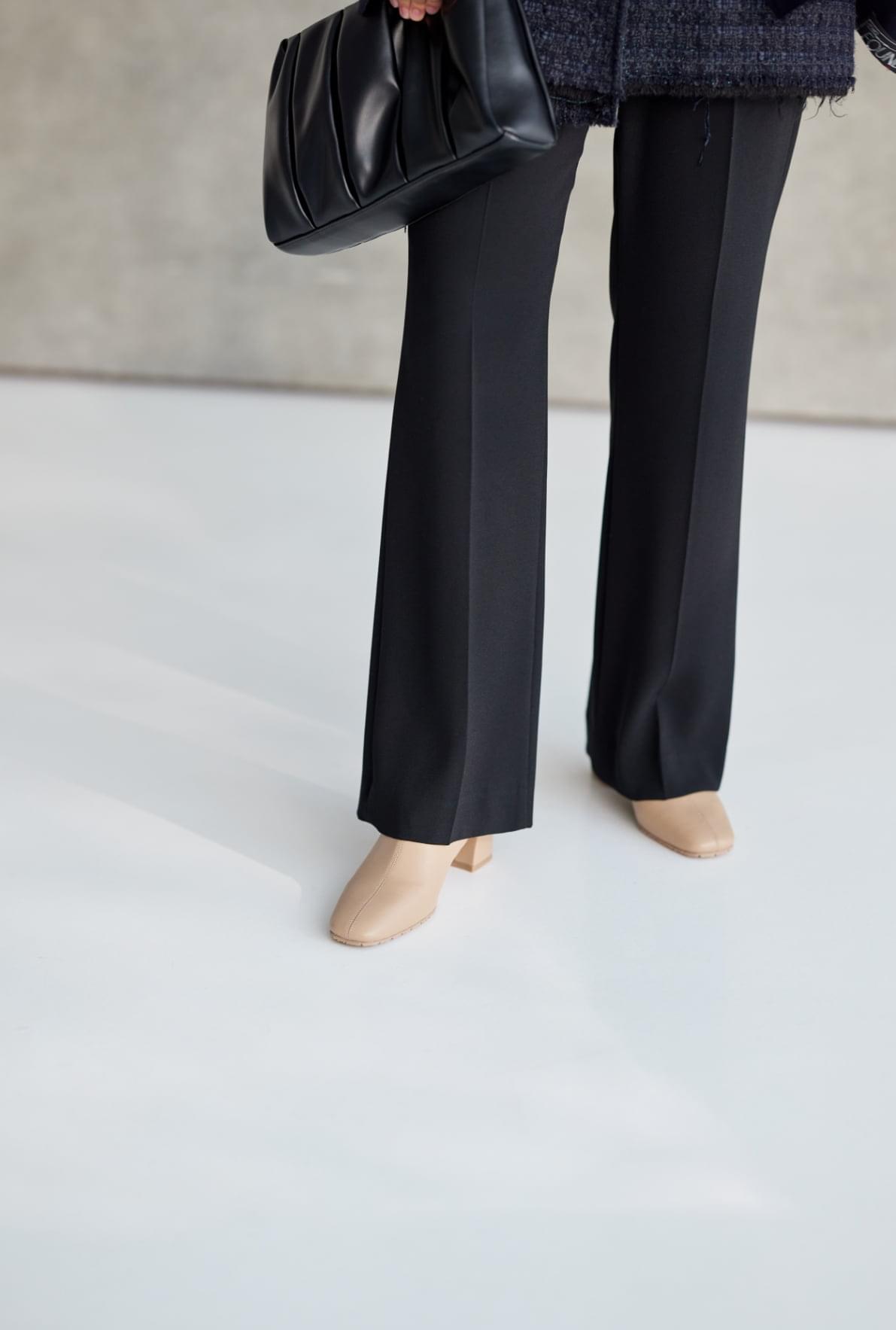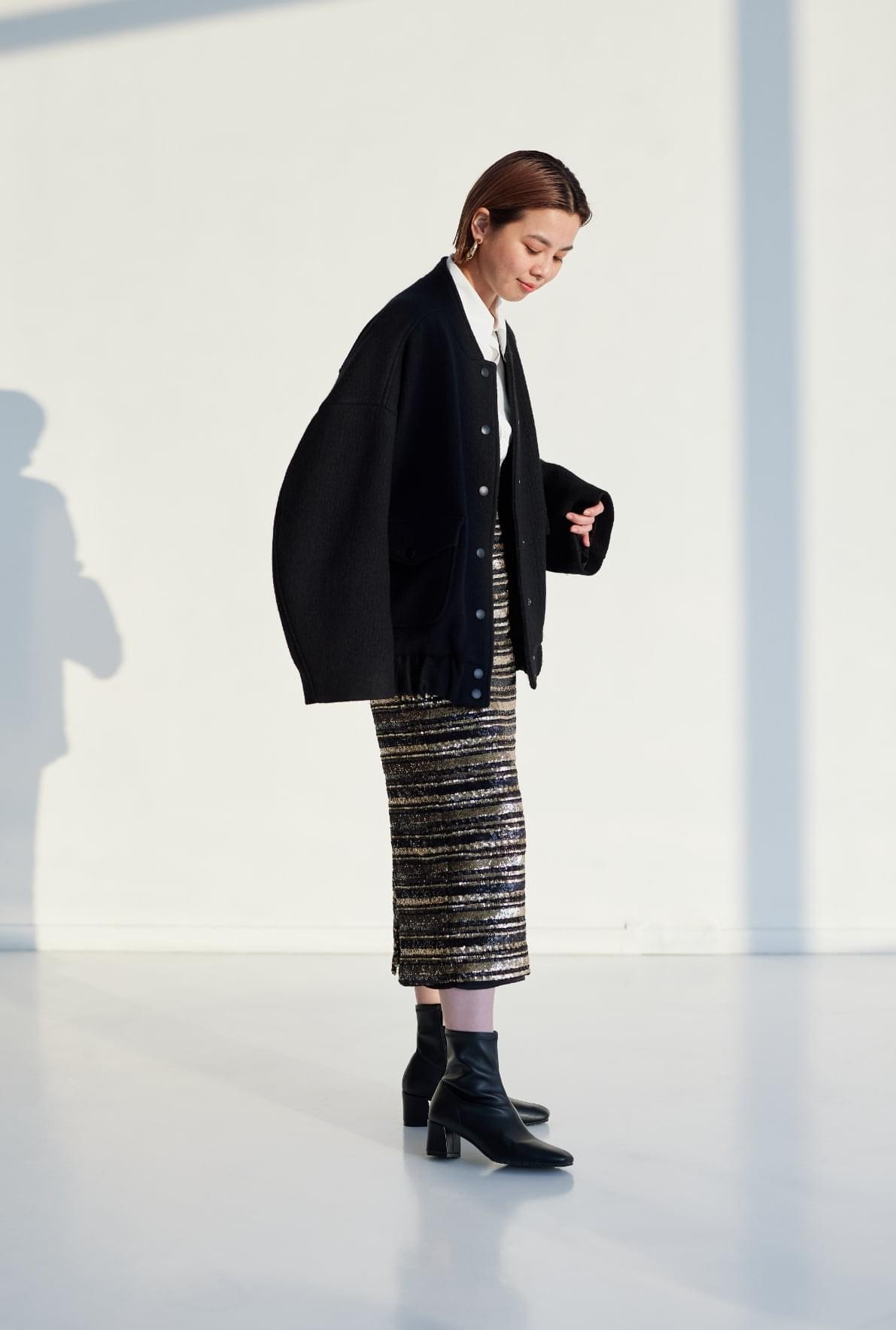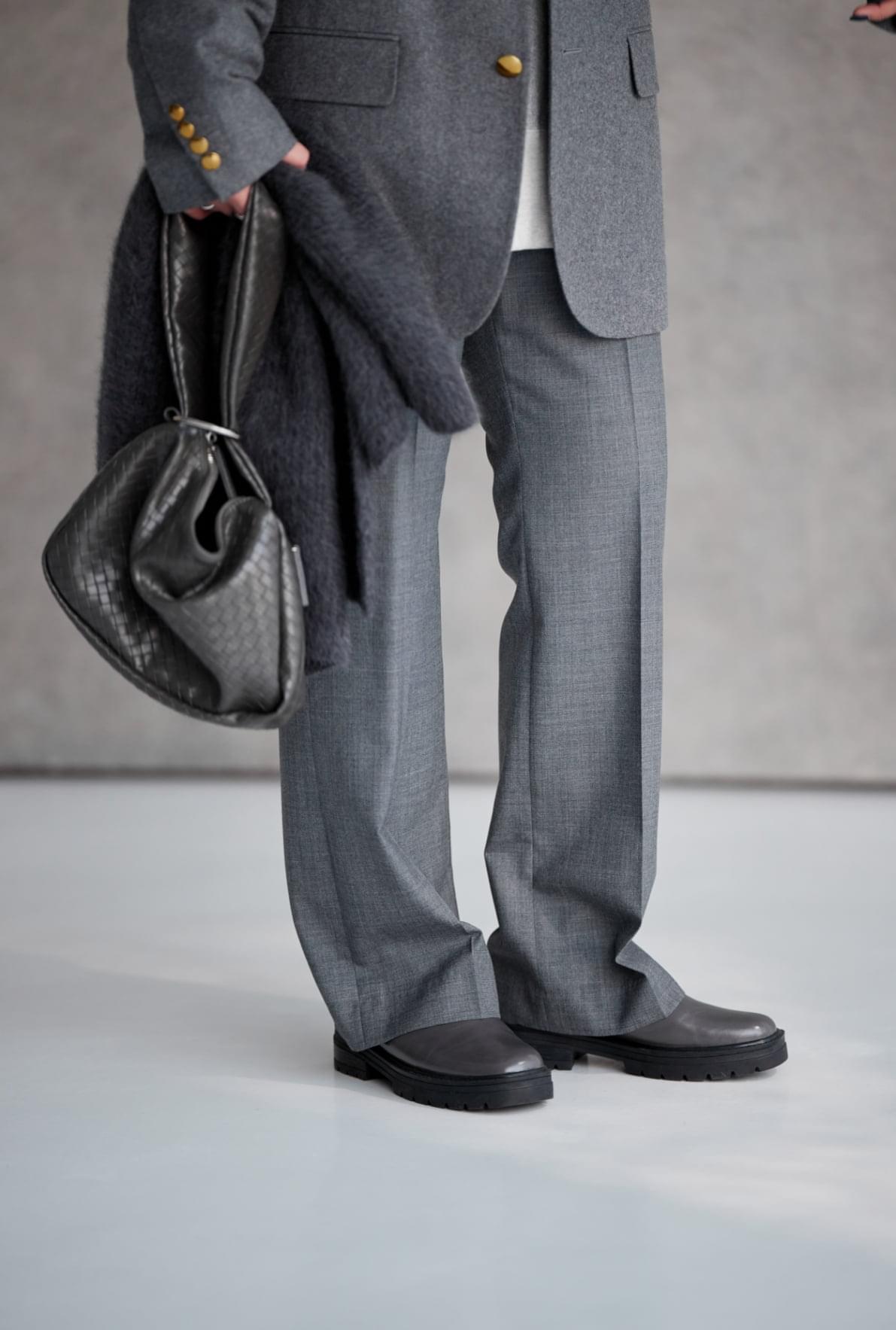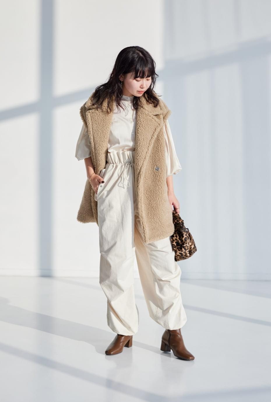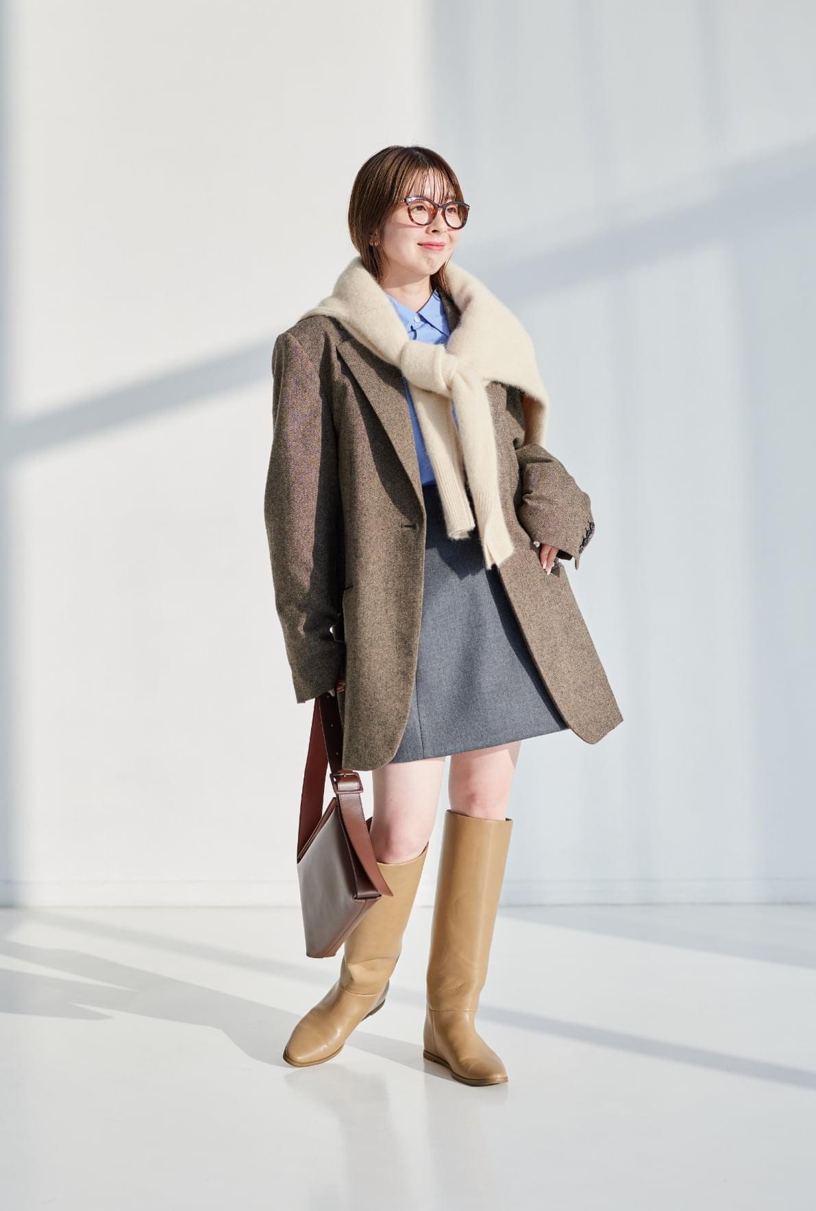オーバーサイズで短丈というエッジの効いたジャケットを使ったレイヤードコーデ。ブーツはブラックでもいいのですが、ベージュを合わせることでまろやかになりワンポイントとしても効いてますよね。シルエットの美しいパンツなので、5cmヒールがあることでさらにスタイルアップ!