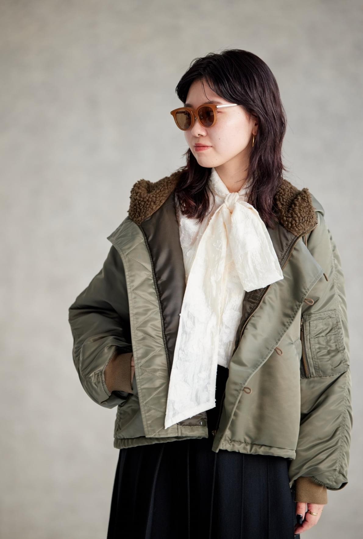 ツイード素材のワークパンツはアイテム自体にミックス感があって面白いですね。ボリュームのあるシルエットのパンツなので、足元にはすっきりとタイトに仕上がるフィットブーツを合わせました。カジュアルなワッペン付きのデニムジャケットのインナーにあえてボウタイブラウスを合わせて、ミックス感をさらに増幅。
