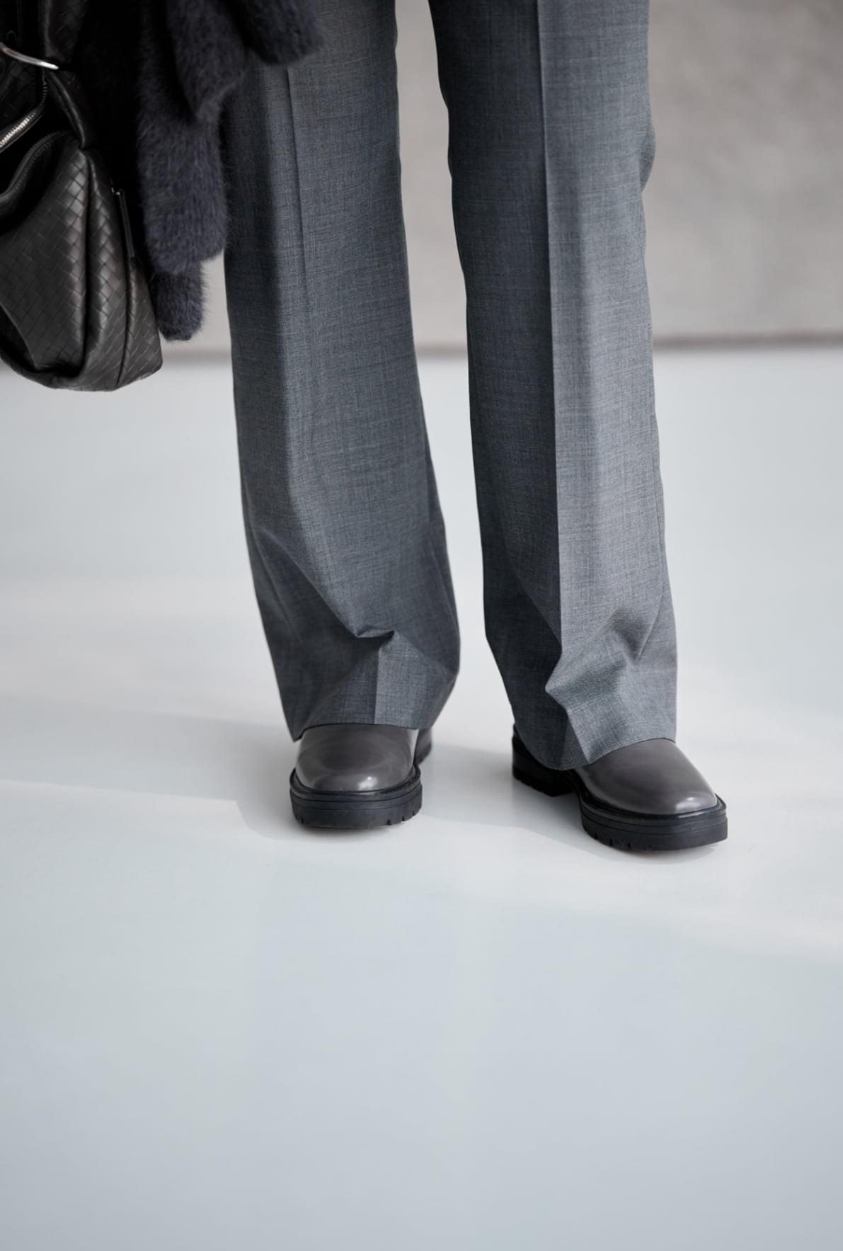 注目のスウェットセットアップをワイドなロングブーツにINする今年らしい提案。ブーツのツヤのあるブラックが醸し出す緊張感が、リラクシーなスウェットコーデを引き締めるのに有効です。アウターはワイドなブーツに重なる長めの丈感がいいなと思い、メンズのオーバーサイズコートを羽織りました。最後にサングラスを足して、遊びのあるアクセント。