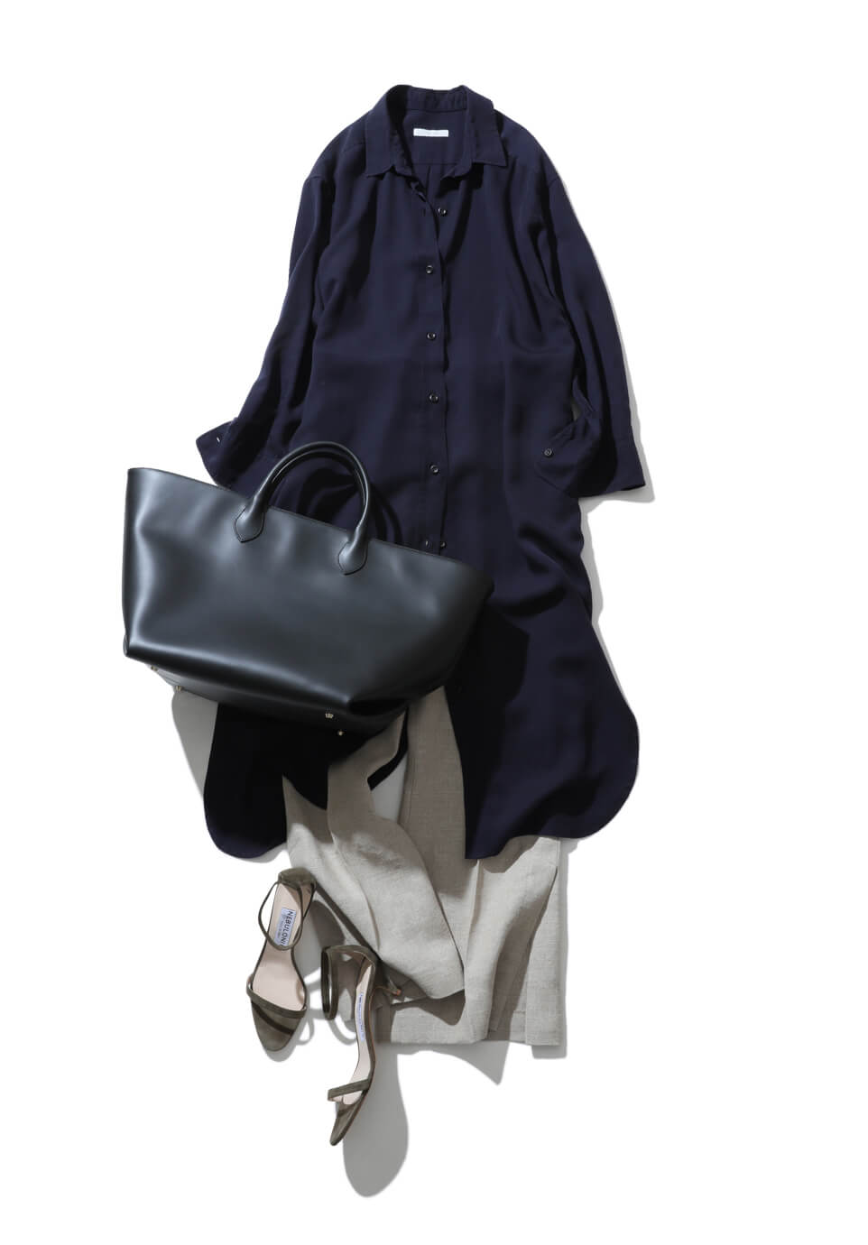 ゆったりしたリラクシングなシルエットながらも上品さが漂う、ネイビーのソフトシャツワンピースが主役。マジメにまとめず、異素材のボトムスをレイヤードして遊びをプラス。美シルエットの麻フレアパンツなら、程よいラフさとお洒落度を味付け。華奢なストラップサンダルで今年らしさを足して、さらに鮮度を高めて。