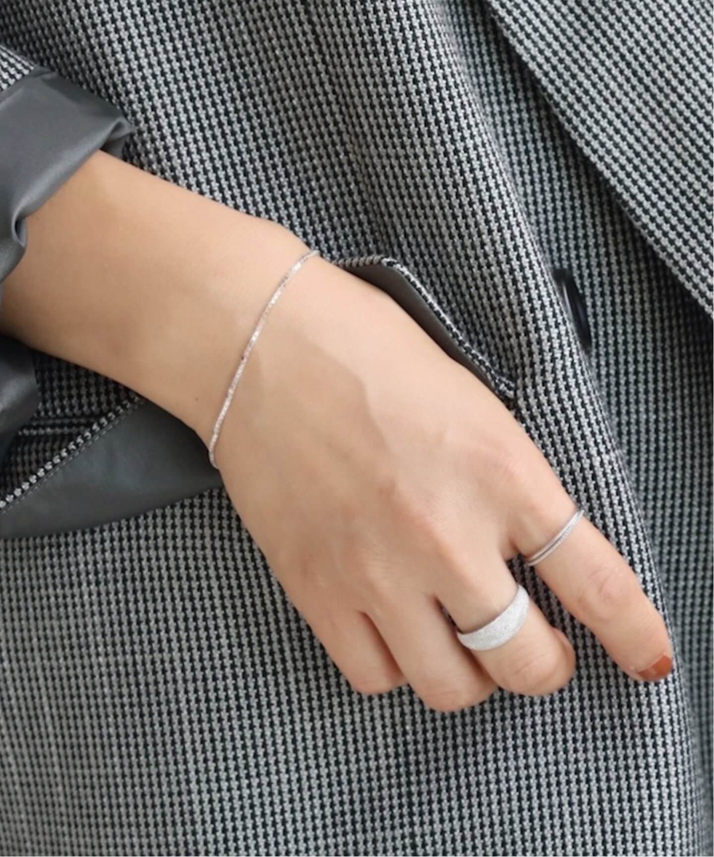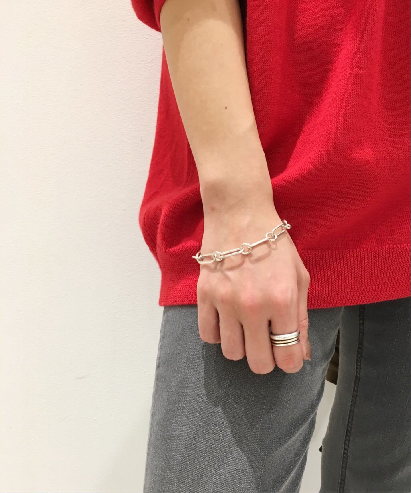 チラリとのぞくブレスレットが好印象華美じゃなくてシンプルなものこそ、今の気分。