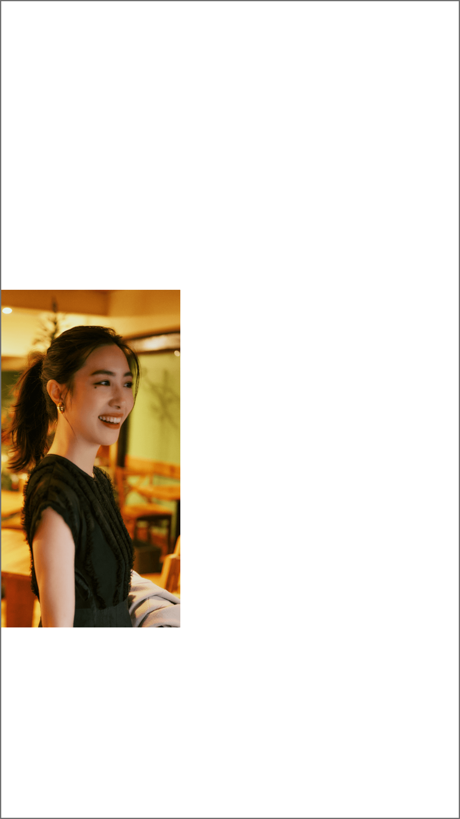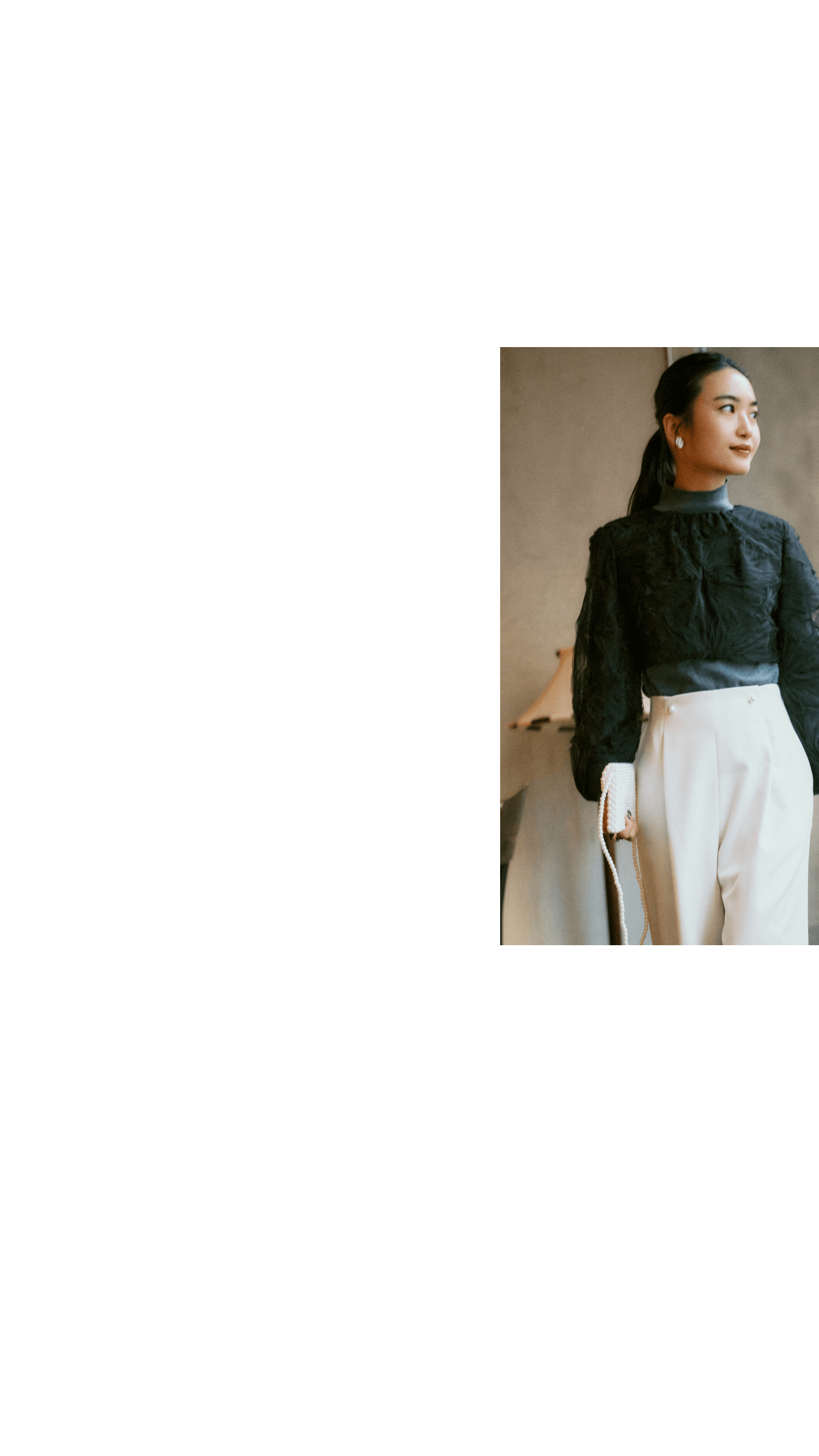ちょっと見慣れていない、イレギュラーな黒を楽しめるというシアーなボレロを主役に。「ボリュームのある袖とクロップド丈が今の気分です。ボレロのデザインを生かして、着こなしはすっきりと。パールバッグで奥ゆかしく遊びを加えて。冬休みはまだ特に予定を決めていないけれど、京都でお寺巡りしたり、ゆっくりする時間をつくりたいと思っています」。Bolero jacket 15,400yen / KAENE