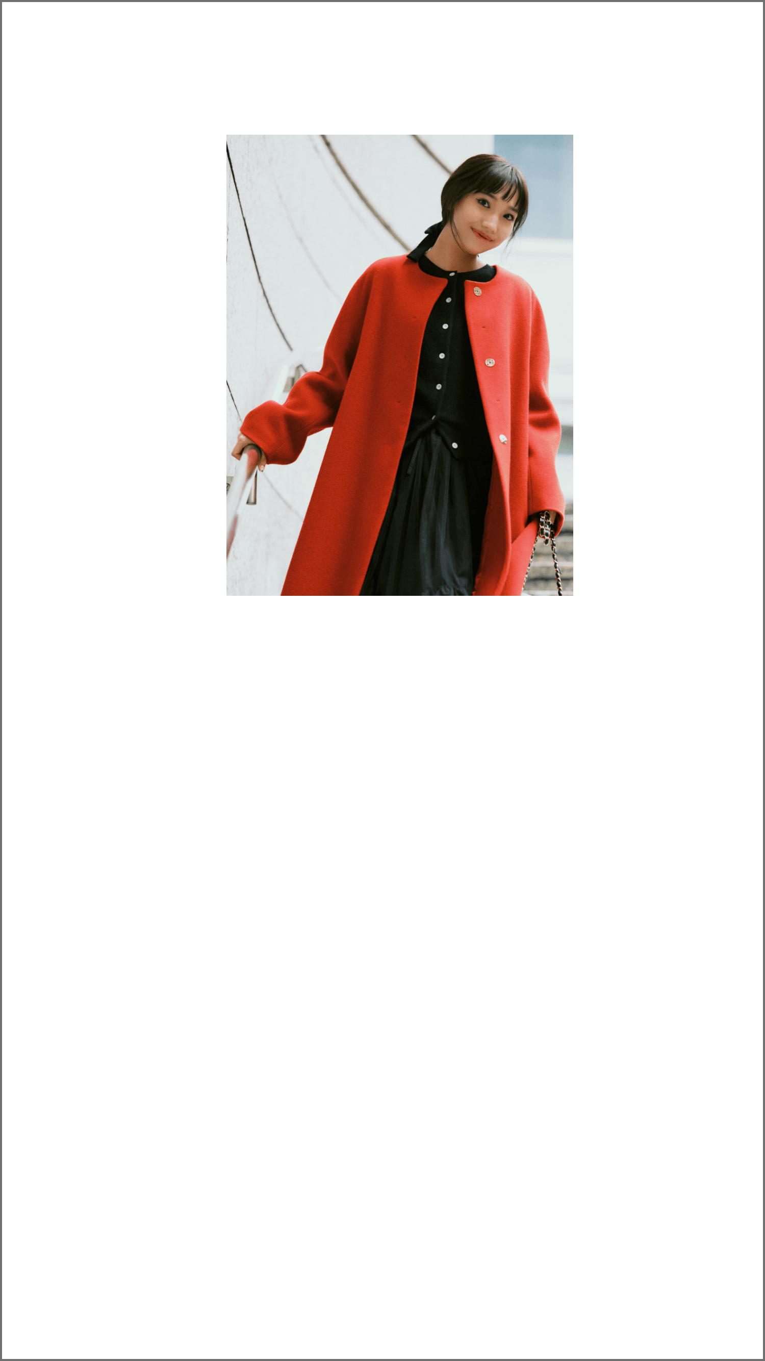 「特別なディナーデートに向かうイメージ。ハッとするような色出しの真っ赤なロングコートが主役です。ドラマティックなAラインのシルエットで非日常の気分に浸って。黒でまとめたコンパクトなカーディガンとチュールスカートでシネマ女優っぽく。ヘアはリボンでゆるくまとめ、後ろ姿も抜かりなくおめかし」。