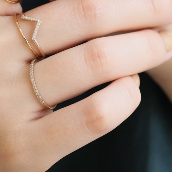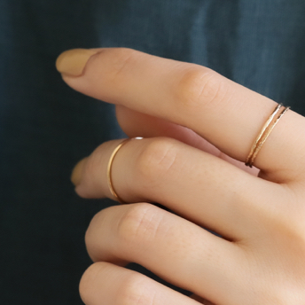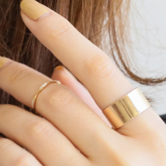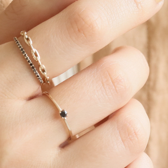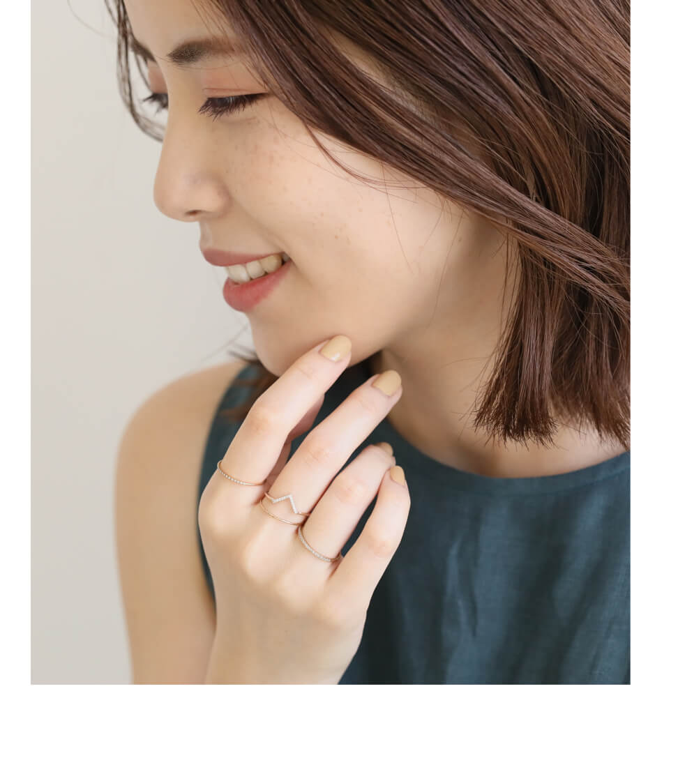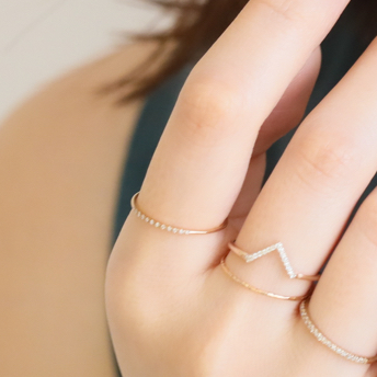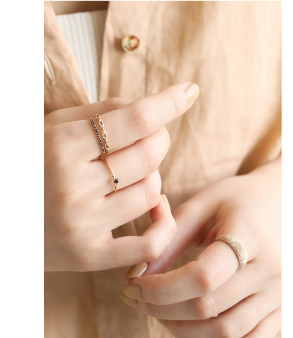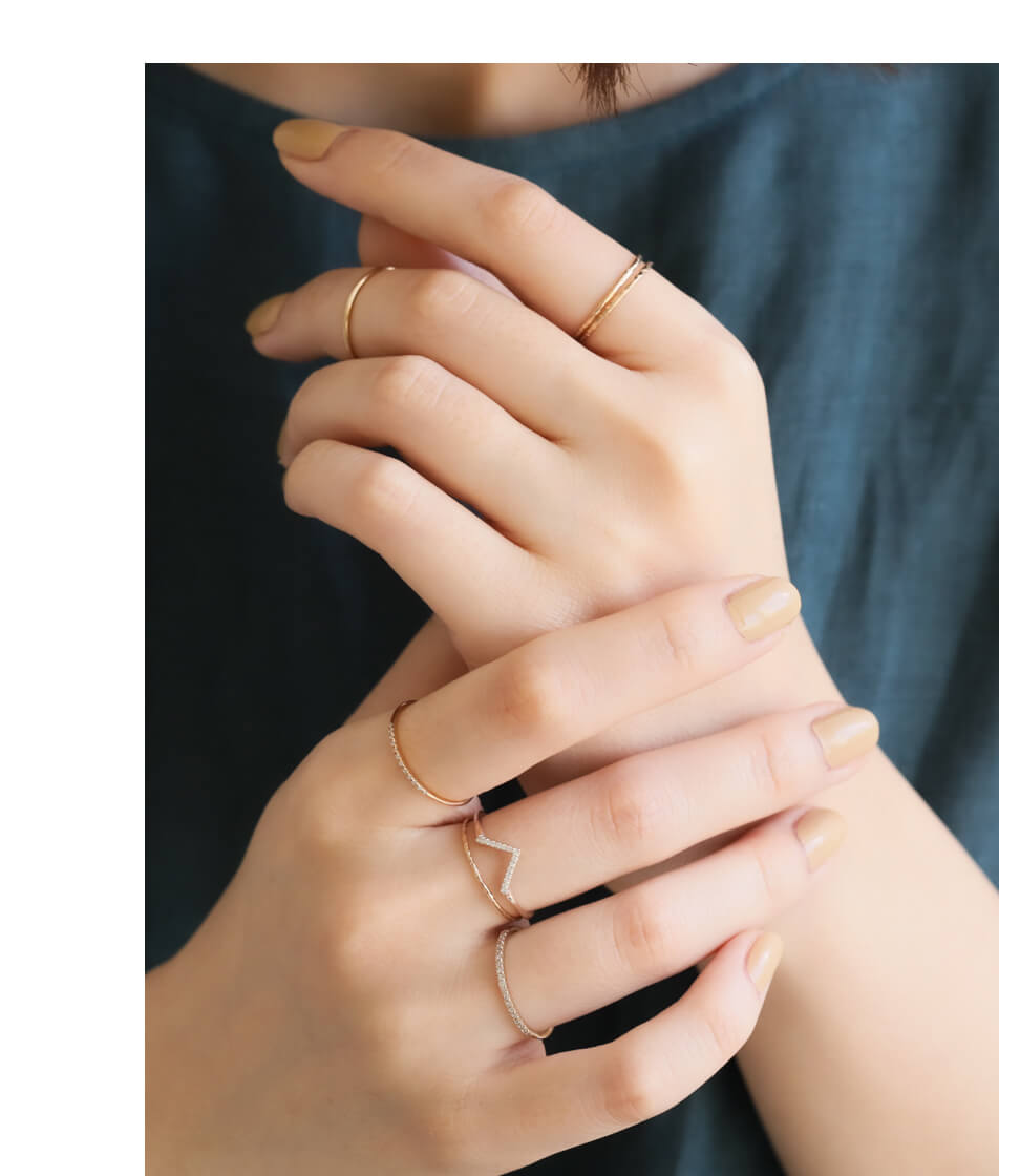レイヤードしやすい華奢なリングたちは、