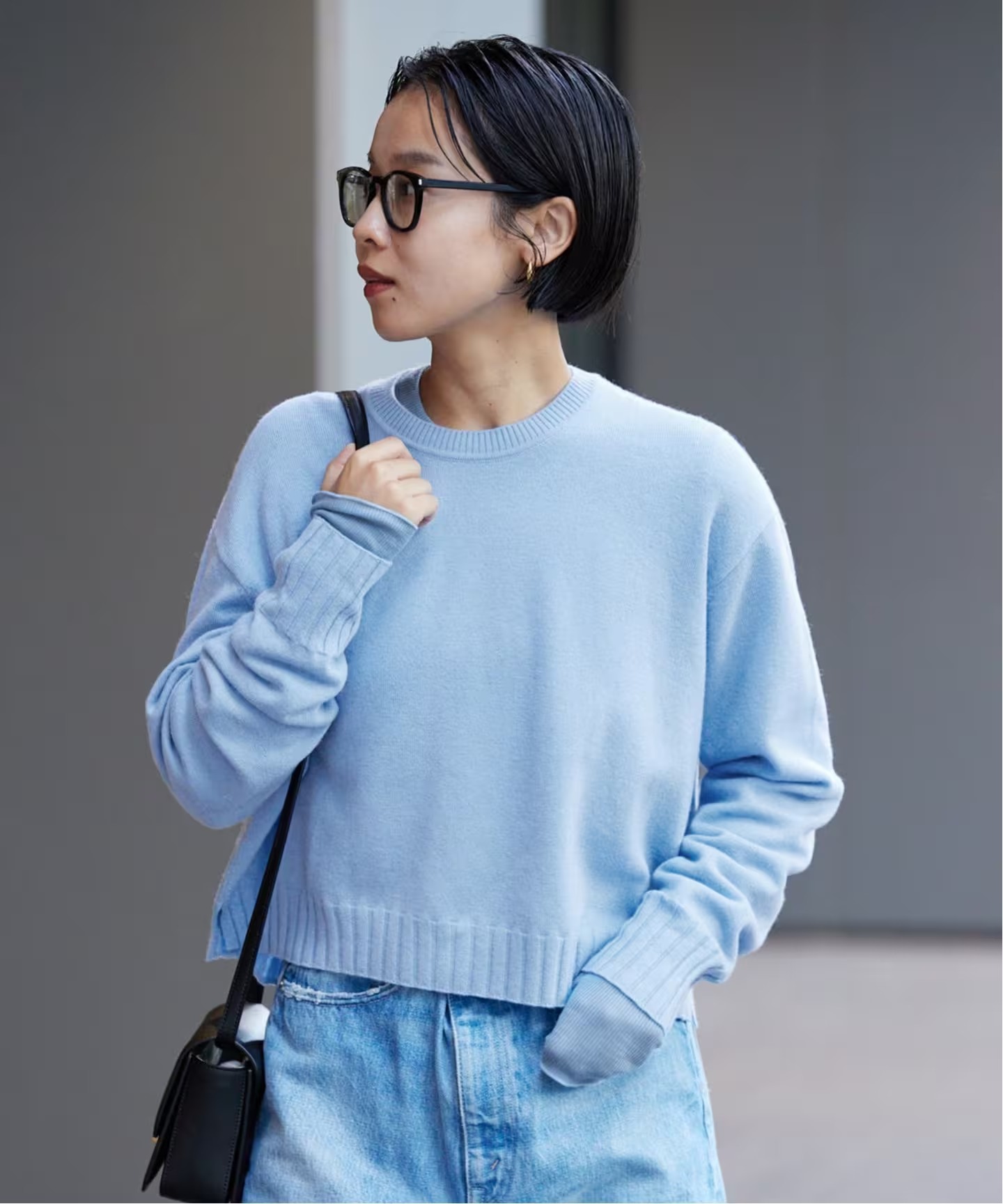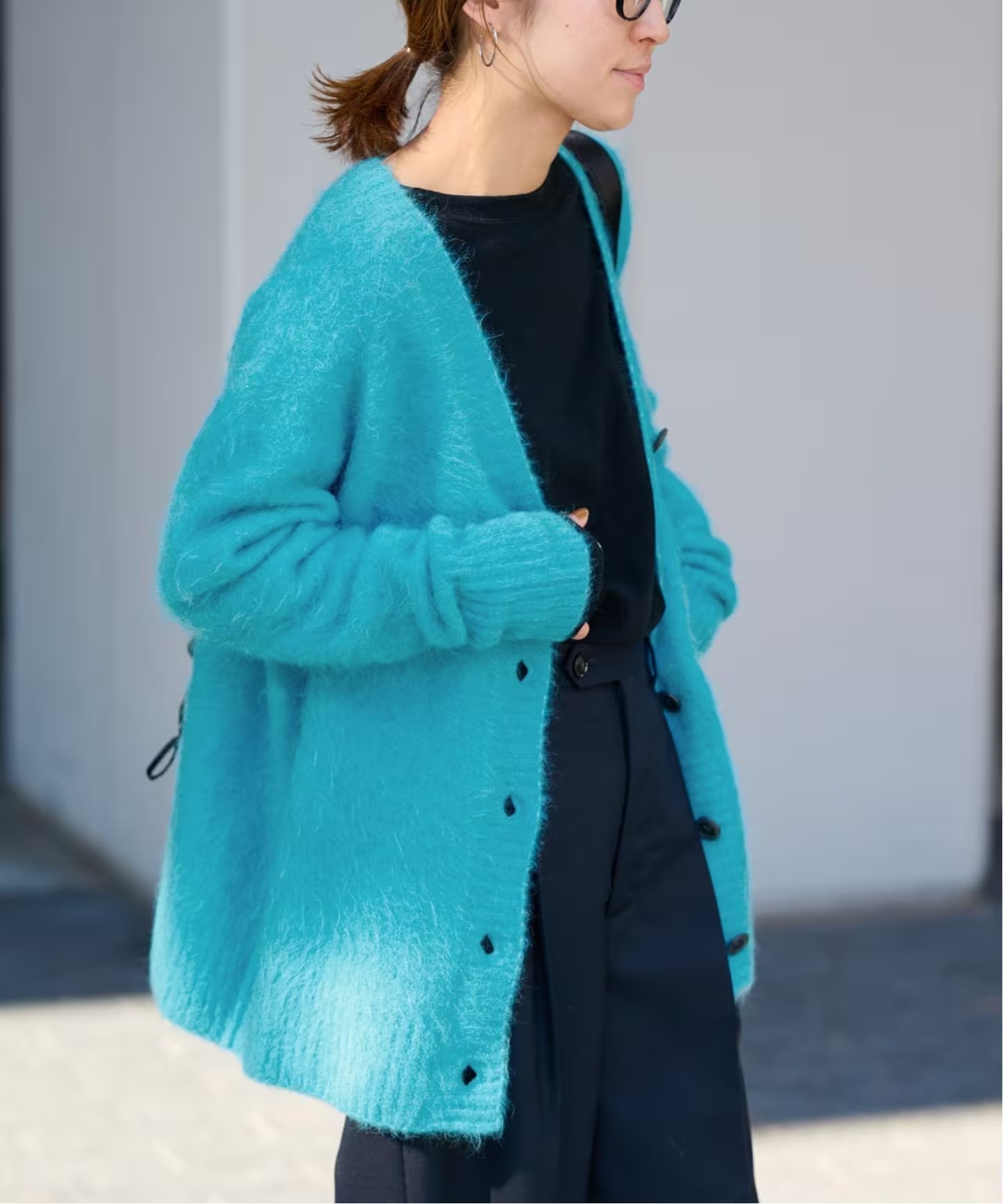 濃淡を使い分けてイメージチェンジFRAMeWORKのアルパカ MIX FUR 2way カーディガンはターコイズ、IENAのショート丈プルオーバーはアイスブルーと、ひとえにブルーと言っても濃淡次第でムードが変化。キュートなルックスのSLOBEフレアデニムキーホルダーも注目して。