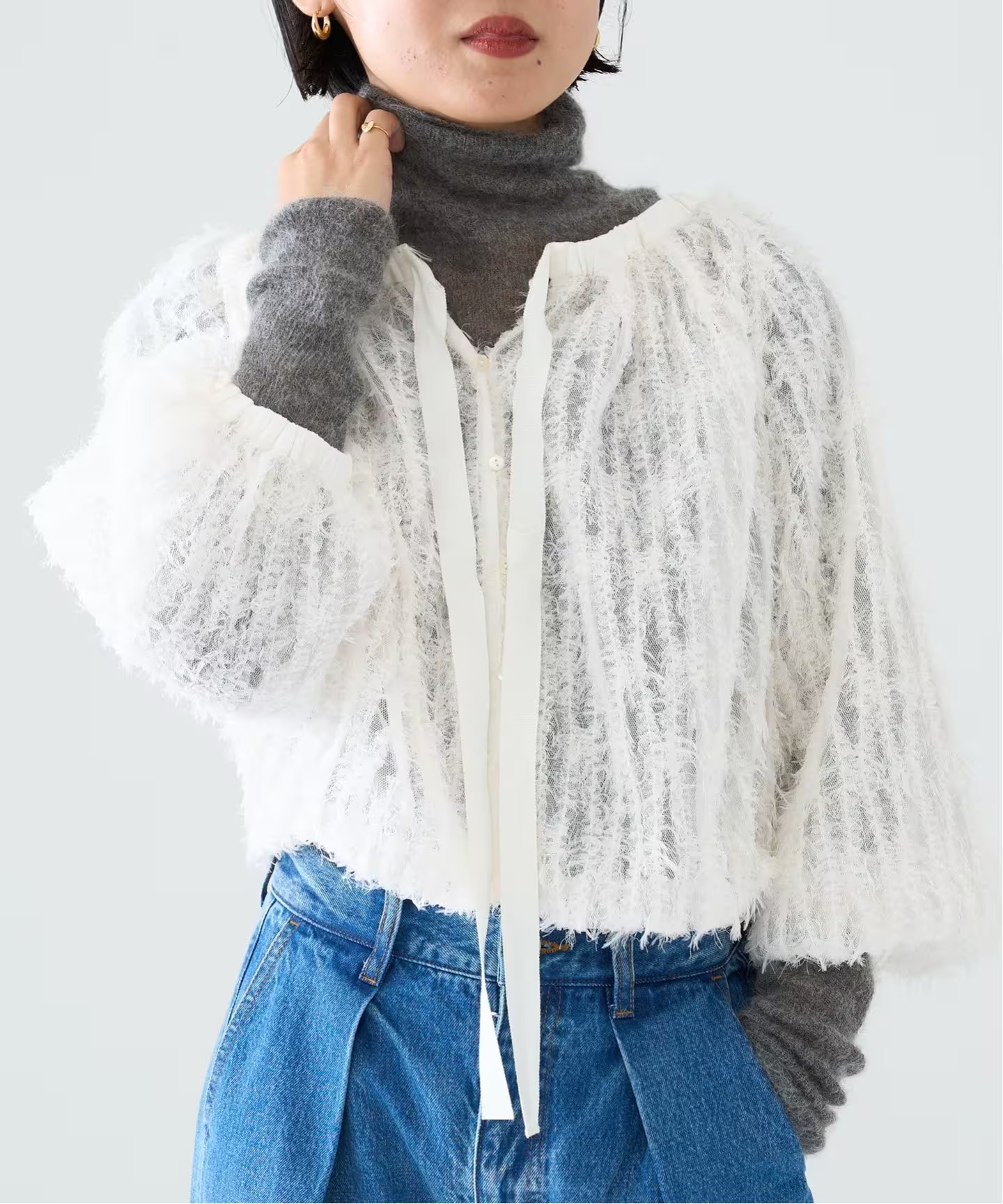 センスが光るクリーンなルックス冬コーデに映えるホワイト。ウエアでは、ふわふわした可愛らしさとジャケットデザインのエレガントさがグッドバランスのカーリーフェイクムートンVネックジャケット。レイヤードをワンランク格上げするフェザーチュールブラウスも。