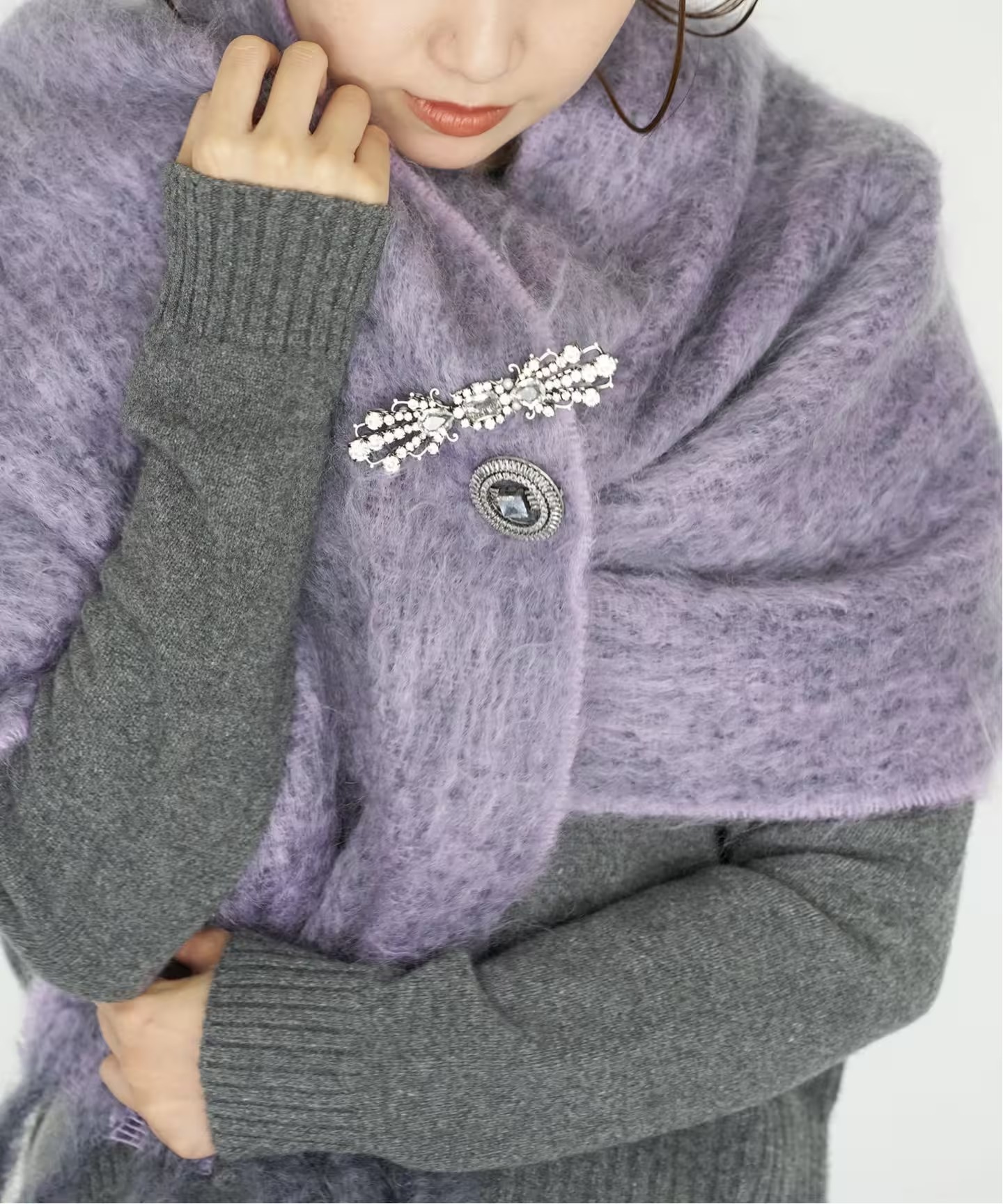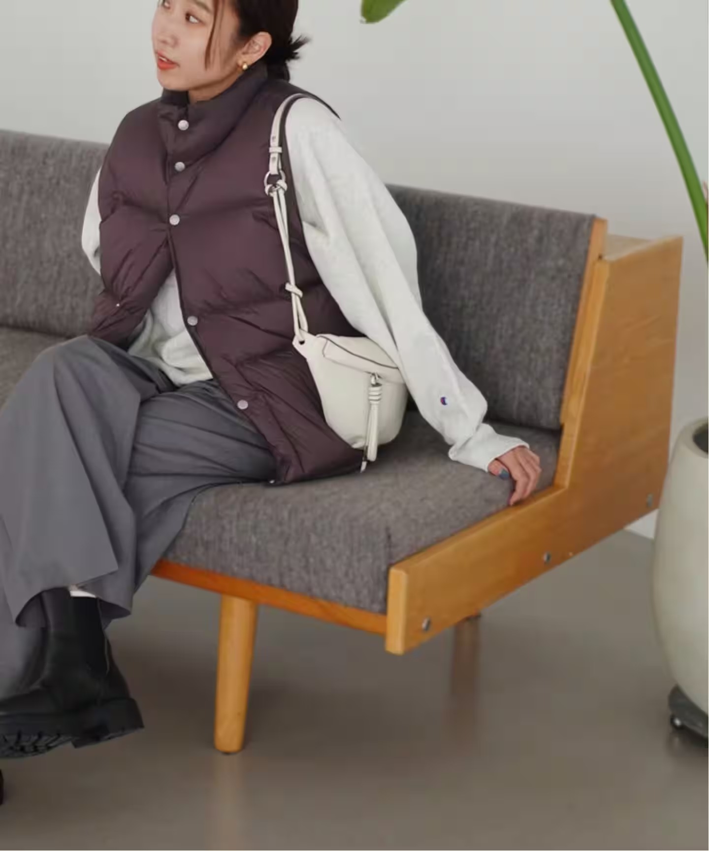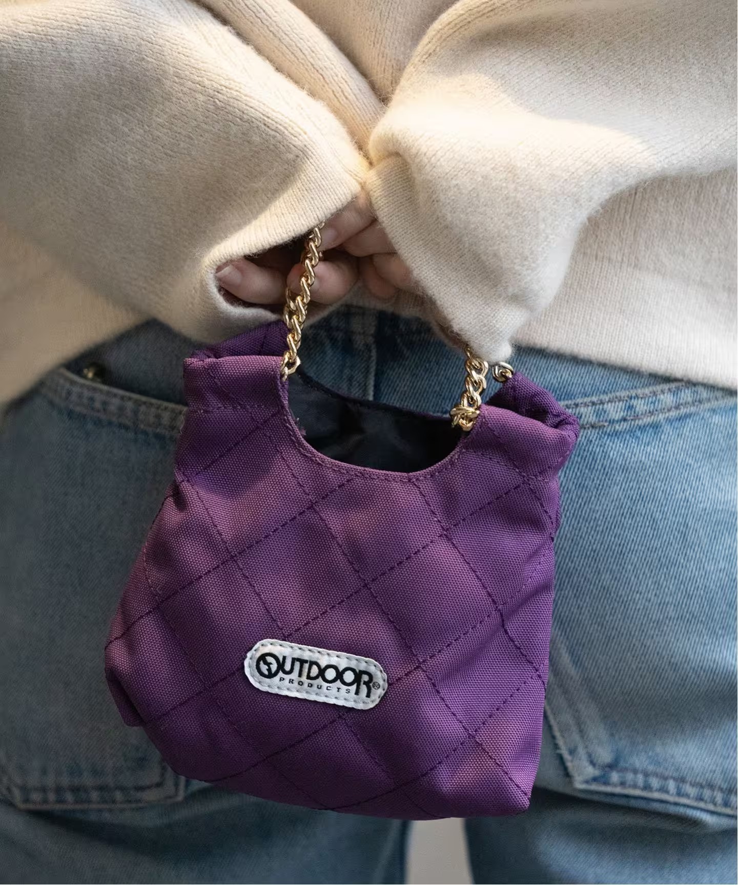 大人カラーでカジュアルを格上げ大人コーデと相性の良いパープル。これまでのOUTDOOR PRODUCTSのイメージを覆す、クラシカルなチェーンバッグが新鮮。真冬に大活躍するストールは、優しい印象を引き寄せるライラック系のカラーをレコメンド。