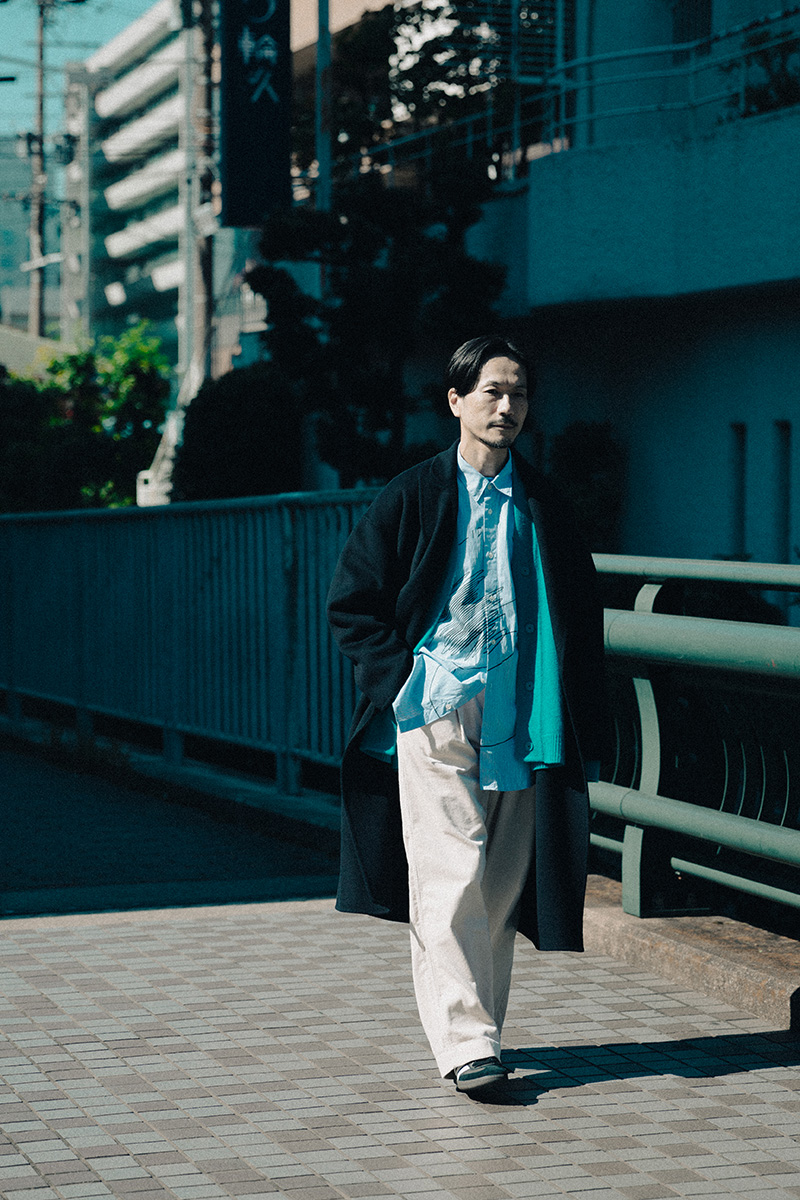 ÉDIFICEらしいブルーを基調としたスタイリングです。上品なロングコートにパキッとしたブルーのカーディガンやストライプシャツ合わせつつ、ゆるめのパンツやスニーカーでカジュアルダウンしました。シャツは、グラフィックアーティストのAICONさんとÉDIFICEがコラボレーションした一着。遊び心があって可愛いですよね。