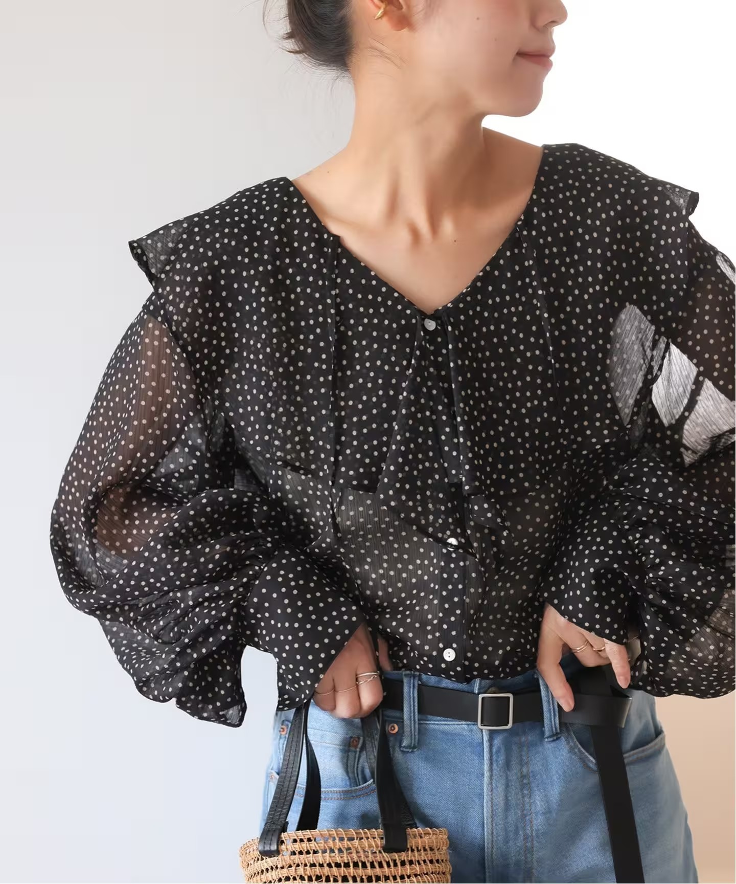 女っぽデザインを投入して鮮度アップrelumeの注目は大人フェミニンなアイテム。顔まわりが一気に華やかになる大きなフリルが魅力のエアリーなブラウス。柔らかな色だしとフリルが着映え効果抜群なカラーブラウスもおすすめ。