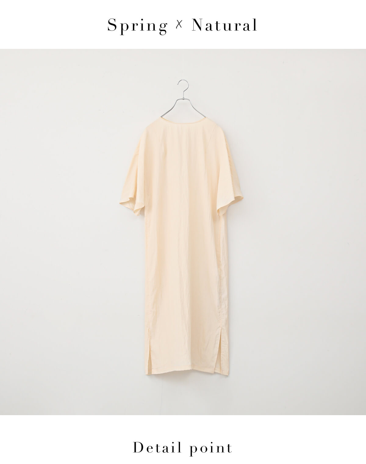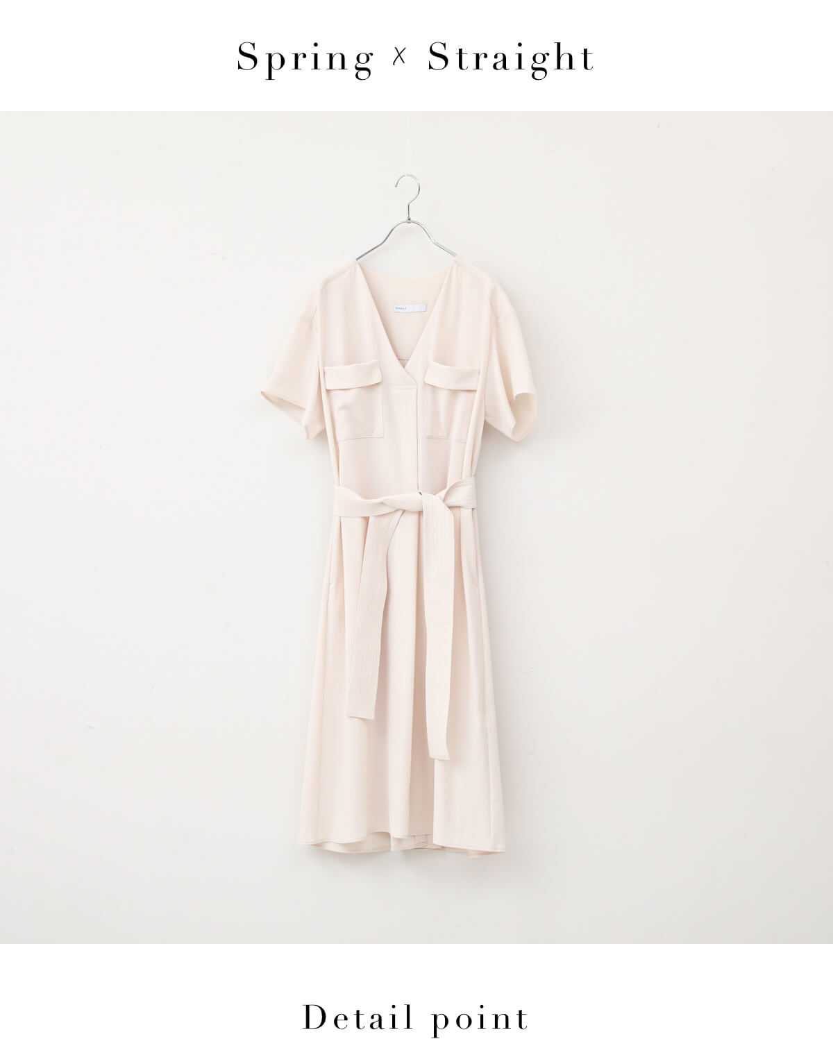 ハリのある素材がドラマティックなフレアラインを生み出すワンピース。ストレートさんのメリハリボディを引き立てるVネックとウエストマークできるディテールがポイント。色はナチュラルなクリーム色がスプリングさんの黄みがかった肌をさらに健康的に見せてくれます。