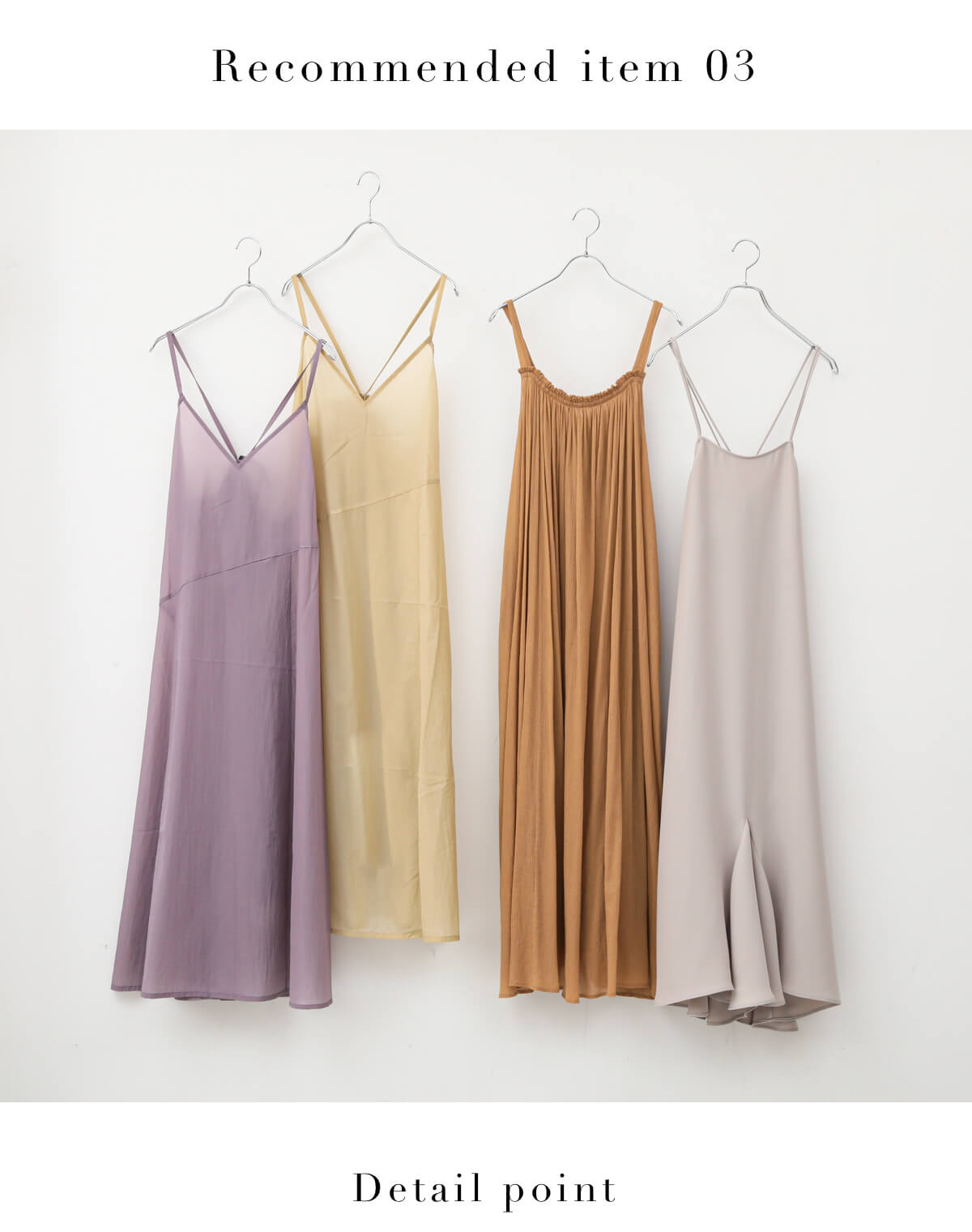 持っておけば失敗のないブラウン系のカラーを中心にした、春らしいラインナップ。スプリングさんのグレーはなるべく青みのない、ベージュに近い色味を選ぶとより良さが引き立ちます。パープルは旬のシアー素材を選べばより着こなしやすく。ミニマルなマーメイドワンピは、背中のダブルストラップをアクセントに効かせて。 - Bonumスーパーライトハッスイナイロン キャミドレス¥17,380(税込)